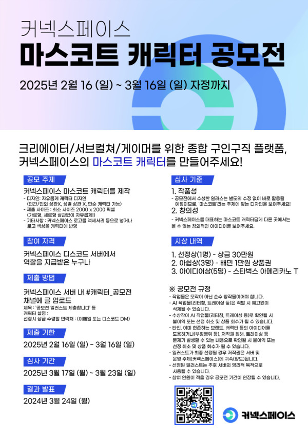커넥스페이스 마스코트 캐릭터 공모전 공모분야 디자인/캐릭터 접수기간2025.02.16 ~ 2025.03.16 D+387 종료 참가자격 제한없음 주최커넥스페이스 1등상금(상품)100만원 이하 홈페이지 바로가기 첨부파일 다운로드 유의사항 ※본 내용은 참고 자료로 내용의 오류와 변동에 대해 책임지지 않습니다. (오류 및 변동 신고는 상단의 '제안/오류' 신고를 통해 해주십시오.) ※주최사 사정에 따라 일정 및 내용이 변경될 수 있으니 주최사 홈페이지 등을 통해 관련 안내를 수시로 확인하시기 바랍니다. 상세내용 ■ 제목커넥스페이스 마스코트 캐릭터 공모전 ■ 기간 - 접수기간 : 2025년 2월 16일 (일) ~ 3월 16일 (일) - 결과발표 : 2024년 3월 24일 (월) ■ 참가자격 커넥스페이스 디스코드 서버에서 역할을 지급받은 누구나 ■ 참여방법 / 접수방법[공모 주제]커넥스페이스 마스코트 캐릭터를 제작디자인 : 자유롭게(인간/인외 상관X, 성별 상관 X, 단순 캐릭터 가능)제출 사이즈 : 최소 사이즈 2000 x 2000 픽셀(가로형, 세로형 상관없이 자유롭게!)기타사항 : 커넥스페이스 로고를 액세서리 등으로 넣거나 로고 색상을 캐릭터에 반영 [제출 방법]커넥스페이스 디스코드 서버 내 #캐릭터_공모전 채널에 글 업로드제목 : '공모전 일러스트 제출합니다' 등캐릭터 설명 :선정시 상금 수령할 연락처 : (이메일 또는 디스코드 DM) [심사 기준]작품성: 공모전에서 수상한 일러스는 별도의 수정 없이 바로 활용될 예정이므로, '마스코트'라는 주제에 맞는 디자인을 보여주세요!창의성 : 커넥스페이스를 대표하는 마스코트 캐릭터답게 다른 곳에서는 볼 수 없는 창의적인 아이디어를 보여주세요! ■ 시상내용 / 혜택 - 선정상(1명) : 상금 30만원 지급 - 아쉽상(3명) : 배달의 민족 1만원 교환권 - 아이디어상(5명) : 스타벅스 아메리카노 Tall 사이즈 기프티콘 ※ 선정 방식 : 역할을 지급받은 서버 전체 유저 대상 인기투표 후, @커넥스페이스 운영/관리진 내부 회의로 최종 결정 ■ 유의사항 - 작업물은 모작이 아닌 순수 창작물이어야 합니다. - AI 작업물(리터칭, 트레이싱 등)은 적발 시 예고없이 삭제될 수 있습니다. - 수상작이 AI 작업물(리터칭, 트레이싱 등)로 확인될 시 불이익 또는 선정 취소 및 상품 회수가 될 수 있습니다. - 타인, 이미 현존하는 브랜드, 캐릭터 등의 아이디어를 도용하거나(부정행위 등), 저작권 침해, 트레이싱 등 문제가 발생할 수 있는 내용으로 확인될 시 불이익 또는 선정 취소 및 상품 회수가 될 수 있습니다. - 일러스트가 최종 선정될 경우 저작권은 서버 및 운영 주체(커넥스페이스)에 귀속(양도)됩니다. - 선정된 일러스트는 추후 서버의 영리적 목적으로 사용될 수 있습니다. - 참여 인원이 적을 경우 공모전 기간이 연장될 수 있습니다. 목록
