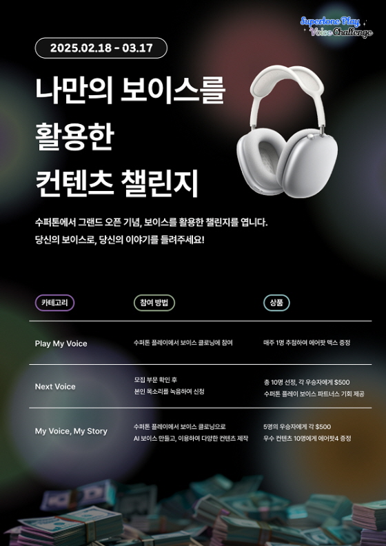 수퍼톤 플레이 보이스 챌린지 공모분야 기획/아이디어/마케팅, 로고송/음악, 기타분야 접수기간2025.02.18 ~ 2025.03.17 D+386 종료 참가자격 제한없음 주최수퍼톤 1등상금(상품)100만원 이하 홈페이지 바로가기 첨부파일 다운로드 유의사항 ※본 내용은 참고 자료로 내용의 오류와 변동에 대해 책임지지 않습니다. (오류 및 변동 신고는 상단의 '제안/오류' 신고를 통해 해주십시오.) ※주최사 사정에 따라 일정 및 내용이 변경될 수 있으니 주최사 홈페이지 등을 통해 관련 안내를 수시로 확인하시기 바랍니다. 상세내용 ■ 제목수퍼톤 플레이 보이스 챌린지 ■ 개요당신의 목소리로 다양한 컨셉의 보이스와컨텐츠를 만들어 도전해보세요!총 $15,000의 상금과 함께, 에어팟 맥스, 에어팟까지지금이 바로 당신의 창의력을 펼칠 순간! 함께 도전하고, 멋진 보상을 받아가세요! ■ 기간 - 신청기간 : 2025년 2월 18일 ~ 3월 17일 ■ 참가자격제한없음 ■ 참여방법 / 접수방법1. Play My Voice보이스 클로닝만 해도?에어팟 맥스 이벤트 자동 참여! 매주 1명 추첨,행운의 주인공이 될 수도 있어요. 2. Next Voice수퍼톤의 공식 보이스가 될 기회!당신만의 특별한 보이스를 세상에 알려보세요!총 10명 선정, 각 우승자에게 $500 상금까지! 3. My Voice, My Story당신의 보이스와 아이디어로 컨텐츠를 만들어보세요!총 5명의 우승자에게 각 $500 상금우수 컨텐츠 10명에게 에어팟4 지급! <신청방법>홈페이지 공고 게시글을 통한 접수https://web.supertone.ai/ko/vc?utm_source=voice&utm_medium=ad&utm_campaign=Play_%ED%99%88%EB%B0%B0%EB%84%88_ko ■ 시상내용 / 혜택 - $500 상금 - 에어팟4 ■ 유의사항자세한 내용은 홈페이지 공고문을 통해 확인하세요. 목록