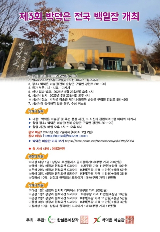 제3회 박덕은 전국 백일장 및 디카시 공모 공모분야 문학/시나리오, 사진/영상 접수기간2025.02.20 ~ 2025.05.23 D+319 종료 참가자격 제한없음 주최박덕은미술관 주관한실문예창작 1등상금(상품)기타 홈페이지 바로가기 첨부파일 다운로드 유의사항 ※본 내용은 참고 자료로 내용의 오류와 변동에 대해 책임지지 않습니다. (오류 및 변동 신고는 상단의 '제안/오류' 신고를 통해 해주십시오.) ※주최사 사정에 따라 일정 및 내용이 변경될 수 있으니 주최사 홈페이지 등을 통해 관련 안내를 수시로 확인하시기 바랍니다. 상세내용 ■ 제목제3회 박덕은 전국 백일장 및 디카시 공모 ■ 개요디카시 응모는 2025년 5월 2일이 마감입니다. (마감일에 유의하세요.)백일장은 5월 23일 시행됩니다. ■ 기간 및 참여 방법<백일장> - 백일장 일시 : 2025년 5월 23일(금) 오전 10시~정오까지 ※ 장소 : 박덕은 미술관(전북 순창군 구림면 강천로 801-20) ※ 참가 부문 : 시, 시조, 디카시 (당일 시제 발표) - 심사 결과 발표 : 2025년 5월 23일(금) 오후 4시 - 시상식 일시 : 2025년 5월 23일(금) 오후 4시 ※ 시상식 장소: 박덕은 미술관 세미나실(전북 순창군 구림면 강천로 801-20) ※ 시상식에 참석하지 않을 경우, 수상 취소됨 <디카시 응모> - 응모 마감 : 2025년 5월 2일까지 - 내용 : '박덕은 미술관' 및 주변 풍경 사진, 그 사진과 관련하여 5행 이내의 '디카시' - 촬영 장소 : 박덕은 미술관(전북 순창군 구림면 강천로 801-20) - 촬영 시간 : 매일 오후 1시~오후 6시 ※ 박덕은 미술관 미리 보기 https://cafe.daum.net/hansilmoonye/NEWp/2064 - 응모 편수 : 디카시 1인 2편 ※ 주의 사항 : 주소, 연락처, 이름 기재 후 보내주세요 - 응모 메일 : hersoherso@naver.com ■ 참가자격대한민국 국민 누구나 ■ 시상내용 / 혜택<글짓기 부문> - 대상 대상 1명;상장과 토션플러스공기정화기1대(쿠팡가격250만원) - 금상 1명:상장과 원적외선드라이기 1대(쿠팡가격11만원)+상금10만원 - 은상 2명:상장과 원적외선드라이기1대씩(쿠팡가격11만원)+상금5만원 - 동상 3명;상장과 원적외션드라이기1대씩(쿠팡가격11만원)+상금3만원 - 장려상 10명:상장과 원적외선드라이기1대씩(쿠팡가격11만원) <디카시 부문> - 대상 대상 1명;상장과 맛사지디바이스1대(쿠팡가격200만원) - 금상1명:상장과 원적외선드라이기 1대(쿠팡가격11만원)+상금10만원 - 은상2명:상장과 원적외선드라이기1대씩(쿠팡가격11만원)+상금5만원 - 동상3명:상장과 원적외션드라이기1대씩(쿠팡가격11만원)+상금3만원 - 장려상10명:상장과 원적외선드라이기1대씩(쿠팡가격11만원) ■ 유의사항백일장과 디카시 공모는 별도의 이벤트입니다.참가 기간 및 내용이 다른 점에 유의하세요. 목록