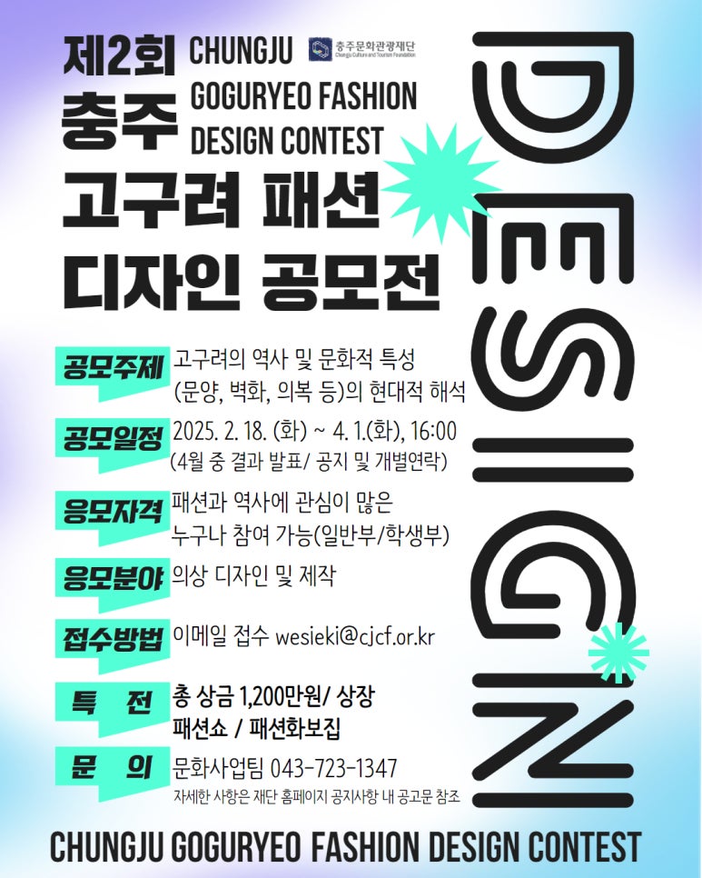 제2회 충주 고구려 패션 디자인 공모전 공모분야 디자인/캐릭터, 기타분야 접수기간2025.02.18 ~ 2025.04.01 D+371 종료 참가자격 제한없음 주최충주문화관광재단 1등상금(상품)100만원~199만원 홈페이지 바로가기 첨부파일 다운로드 유의사항 ※본 내용은 참고 자료로 내용의 오류와 변동에 대해 책임지지 않습니다. (오류 및 변동 신고는 상단의 '제안/오류' 신고를 통해 해주십시오.) ※주최사 사정에 따라 일정 및 내용이 변경될 수 있으니 주최사 홈페이지 등을 통해 관련 안내를 수시로 확인하시기 바랍니다. 상세내용 ■ 제목제2회 충주 고구려 패션 디자인 공모전 ■ 개요 (재)충주문화관광재단은 국내 유일의 고구려비인 충주고구려비를 널리 알리고, 고구려에 대한 관심을 높이기 위해 충주 고구려 패션 디자인 공모전을 개최합니다. 패션 및 역사에 관심 있는 분들의 많은 참여 바랍니다. ■ 기간접수기간 : 2025. 2. 18.(화) ~ 4. 1.(화), 16:00 * 마감 시간 내 이메일 도착 건에 한함 ■ 참가자격<공통사항> - 의상을 디자인 및 제작하여 제출할 수 있는 자 (모델이 착용 후 워킹이 가능할 수 있어야 함) - 개인 또는 팀 참여 가능(최대 3인) - 모든 지원자는 대한민국 국민이거나 영토 내 거주자이어야 함 ※ 제 1회 충주 고구려 패션 디자인 공모전 선정자 재참여 가능 (단, 기존과 동일·유사 디자인 및 동일 부분으로는 참여 불가 <일반부> - 패션업계 종사자 - 패션과 역사에 대한 관심이 많은 자 - 국내·외 패션계열 학과 대학/대학교 졸업생 <학생부> - 국내·외 패션계열 학과 대학/대학교 재학생 - 국내·외 중·고등학교 재학생 * 재학증명서 제출 필수(학생부의 경우 참여자 전원 제출) ■ 참여방법 / 접수방법공모분야 : 의상 디자인 및 제작 공모주제 : 고구려의 역사 및 문화적 특성(문양, 벽화, 의복 등)의 현대적 재해석 <제출 서류 및 규격>1. 일러스트레이션 : 작품 2점의 각 앞·뒷모습2. 제작계획서 : 재단이 제공하는 양식 / 기획 의도 및 창의성 설명(독창성, 유창성 등) / 제작 계획 작성(원단 재질 및 구체적인 제작 계획 필수)3. 제작 포트폴리오 : 팀 1인 또는 개인이 제작한 의상 1벌의 앞, 뒷모습 1장 * 의상 제작 완성을 위한 역량을 보기 위함으로 고구려 패션 디자인 공모전을 위해 제작한 의상이 아닌, 만들어 본 의상의 사진 필요 <제출요령> - 팀으로 참여할 경우 참여조건확인 서약서 및 개인정보 동의서 참여자 전원 각각 작성 필수 - 재학증명서는 별도의 파일로 제출 <제출방법> - 이메일 접수: wesieki@cjcf.or.kr - 지원신청서, 서약서, 동의서 등을 PDF 파일로 변환 - 메일 제목 [고구려패션디자인공모전_응모부분_이름 또는 팀명] 기재 예시) 고구려패션디자인공모전_학생부_김충주 ■ 시상내용 / 혜택 8팀 (총 16개 작품) : - 상금 150만원(제세공과금 포함) / 패션쇼 참여 / 상장 수여 ■ 유의사항<서류 및 저작권, 입상작 소유권 관련> - 1차 서류(일러스트레이션·참가계획서)의 경우 반출하지 않음 - 참가자는 참가작이 제 3자의 저작권을 침해하지 않도록 주의 의무를 다해야 하며, 이로 인한 분쟁 발생 시 모든 법적 책임은 참가자에게 있음 - 입상작과 관련된 저작권 분쟁 등 법적 분쟁 발생 시 모든 법적 책임은 참가자에게 있음 - 입상작에 한하여 저작재산권은 작가에게 속해있으나, 작품의 소유권은 주최 측에 귀속됨 * 2차 저작물작성권(작품집 발간, 기타 홍보를 위한 가공·배포·전시 등)은 주최측이 권한을 행사할 수 있음 <응모 및 시상 제한> - 심사 결과에 따라 당초 선정 규모보다 축소될 수 있음 - 선정 및 작품 제작 과정 포기 시 수상 취소 및 상금 환수 - 국내·외 공개 및 발표된 작품(학생부의 경우 졸업작품으로 참여 불가) - 법률적으로 문제가 있는 작품 - 모방성이 강한 작품(입상 후 표절 사실이 밝혀질 경우 수상 취소 및 상금 환수 ■ 문의(재)충주문화관광재단 문화사업팀 : 043-723-1347 목록