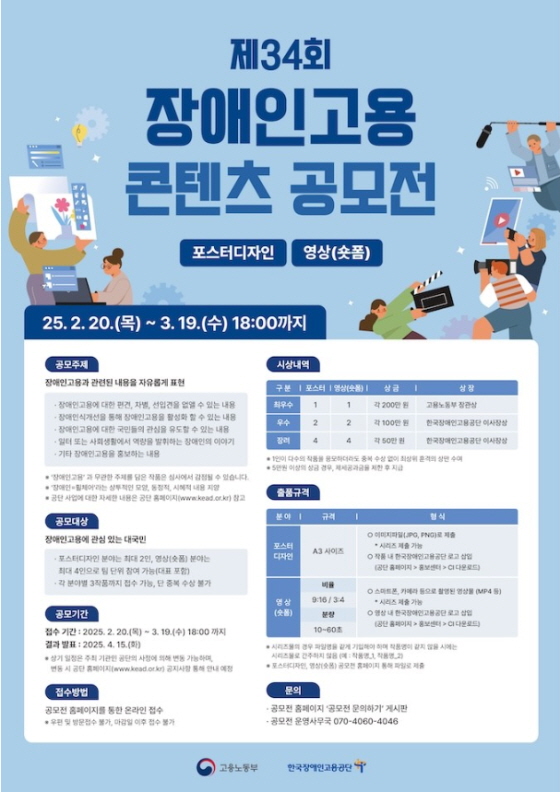 제34회 장애인고용 콘텐츠 공모전 (포스터, 영상) 공모분야 사진/영상, 웹툰/포스터/미술 접수기간2025.02.20 ~ 2025.03.19 D+384 종료 참가자격 제한없음 주최고용노동부 1등상금(상품)200만원~499만원 홈페이지 바로가기 첨부파일 다운로드 유의사항 ※본 내용은 참고 자료로 내용의 오류와 변동에 대해 책임지지 않습니다. (오류 및 변동 신고는 상단의 '제안/오류' 신고를 통해 해주십시오.) ※주최사 사정에 따라 일정 및 내용이 변경될 수 있으니 주최사 홈페이지 등을 통해 관련 안내를 수시로 확인하시기 바랍니다. 상세내용 ■ 제목제34회 장애인고용 콘텐츠 공모전 ■ 기간 - 접수 기간: 2025년 2월 20일(목) ~ 3월 19일(수) 18:00까지 - 결과 발표: 2025년 4월 15일(화) ■ 참가자격장애인고용에 관심 있는 전 국민ㆍ 포스터디자인 부문: 최대 2인ㆍ 영상(숏폼) 부문: 최대 4인(대표 포함)ㆍ 각 부문별 3작품까지 접수 가능 (단, 중복 수상 불가) ■ 참여방법 / 접수방법<공모 주제>장애인고용과 관련된 내용을 자유롭게 표현ㆍ 장애인고용에 대한 편견, 차별, 선입견을 없앨 수 있는 내용ㆍ 장애인식개선을 통해 장애인고용을 활성화 할 수 있는 내용ㆍ 장애인고용에 대한 국민들의 관심을 유도할 수 있는 내용ㆍ 일터 또는 사회에서의 역할을 활발히 하는 장애인의 이야기ㆍ 기타 장애인고용을 홍보하는 내용*장애인과 직접 관련된 특별한 주제를 선정하여 제작할 수도 있음*단순한 슬로건, 일러스트 및 동영상 등의 홍보성 내용 지양*공단 사업에 대한 자세한 내용은 공단 홈페이지(www.kead.or.kr) 참고 <출품 규격>1. 포스터 디자인 - 규격: A3 사이즈 - 형식: JPG, PNG 이미지 파일 제출 - 작품 내 공단 로고 삽입 필수 (공단 홈페이지에서 다운로드 가능) 2. 영상(숏폼) - 비율: 9:16 또는 3:4 - 분량: 10~60초 - 형식: 스마트폰, 카메라 등으로 촬영한 MP4 파일 제출 - 작품 내 공단 로고 삽입 필수 (공단 홈페이지에서 다운로드 가능)*시리즈물의 경우 파일명을 같게 기입해야 하며 작품명이 같지 않을 시에는 시리즈물로 간주하지 않음 (예 : 작품명_1, 작품명_2)*포스터디자인, 영상(숏폼) 공모전 홈페이지 통해 파일로 제출 <접수 방법> - 공모전 홈페이지를 통한 온라인 접수 *우편 및 방문 접수 불가, 마감일 이후 접수 불가 ※ 홈페이지 바로가기 : https://www.keadcontest.com/■ 시상내용 / 혜택포스터, 영상(숏폼) 각 부문 - 최우수 각 1명 : 200만원 및 고용노동부 장관상 - 우수 각 2명 : 100만원 및 한국장애인고용공단 이사장상 - 장려 각 4명 : 50만원 및 한국장애인고용공단 이사장상 ※ 1인이 다수의 작품을 응모하더라도 중복 수상은 불가능하며, 팀원 전체가 상장 및 상금을 수여받음. ※ 5만원 이상의 상금 수령 시, 세금공제 후 지급됨. 목록