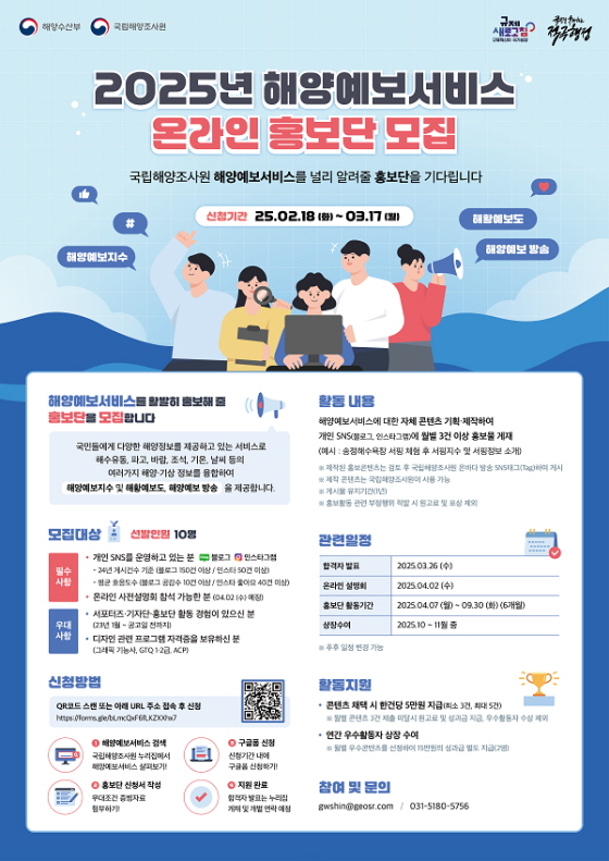 국립해양조사원 2025년 해양예보서비스 온라인 홍보단 모집 접수기간2025.02.18 ~ 2025.03.17 D+386 종료 참가자격 제한없음 주최국립해양조사원 1등상금(상품)기타 홈페이지 바로가기 첨부파일 다운로드 유의사항 ※본 내용은 참고 자료로 내용의 오류와 변동에 대해 책임지지 않습니다. (오류 및 변동 신고는 상단의 '제안/오류' 신고를 통해 해주십시오.) ※주최사 사정에 따라 일정 및 내용이 변경될 수 있으니 주최사 홈페이지 등을 통해 관련 안내를 수시로 확인하시기 바랍니다. 상세내용 ■ 제목국립해양조사원 2025년 해양예보서비스 온라인 홍보단 모집 ■ 기간 - 모집 : 2월 18일(화) ~ 3월 17일(월) - 선발 결과 발표 : 3.26(수) * 국립해양조사원 누리집 공지사항에서 발표하며, 합격자에게는 개별 안내할 예정 - 온라인 사전설명회 : 4.2(수) - 활동기간 : 4.7(월)~9.30(화) - 상장수여 : 10~11월 중 ■ 참가자격(필수사항) 개인 누리소통망(SNS)을 운영하고 있는 분 중 24년 게시건수 및 호응도수 기준 이상을 보유하고 계신 분* (우대사항) 서포터즈 또는 기자단 활동 경험이 있는 경우, 디자인 관련 프로그램(포토샵 등) 사용이 가능한 경우 ※ 모집인원 : 10명 ■ 활동내용 - 일반 국민의 눈높이에 맞춘 해양예보 서비스 관련 누리소통망(SNS) 콘텐츠를 직접 제작 - 해양예보 서비스 관련 실생활 사용후기 등을 월 3회 이상 개인 누리소통망(SNS)에 게시 ■ 지원방법구글폼으로 신청 : https://forms.gle/bLmcQxF6fLKZXXhx7 - QR스캔(포스터 좌측하단)) ■ 참여 혜택 1) 원고료 : 실적에 따라 월 최대 25만 원의 활동비를 제공 * 월 3건 이상 홍보물 게재하여야만 원고료 지급 2) 성과금 : 실적에 따라 우수활동자 추가 성과금(15만원) 지급 3) 시상내역 : 국립해양조사원장상 등 실적에 따라 상장수여 ■ 유의사항 그외 상세사항은 포스터 참조 ■ 문의 - 전화 : 031-5180-5756 - 이메일 : gwshin@geosr.com 목록