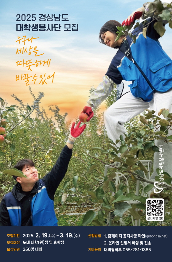 2025 경상남도대학생봉사단 제14기 모집안내 접수기간2025.02.19 ~ 2025.03.31 D+372 종료 참가자격 대학(원)생/청년, 지역한정 주최경상남도자원봉사센터 1등상금(상품)기타 홈페이지 바로가기 첨부파일 다운로드 유의사항 ※본 내용은 참고 자료로 내용의 오류와 변동에 대해 책임지지 않습니다. (오류 및 변동 신고는 상단의 '제안/오류' 신고를 통해 해주십시오.) ※주최사 사정에 따라 일정 및 내용이 변경될 수 있으니 주최사 홈페이지 등을 통해 관련 안내를 수시로 확인하시기 바랍니다. 상세내용 ■ 제목2025 경상남도대학생봉사단 제14기 모집안내 ■ 기간 - 모집기간 / 2025. 2. 19.(수) ~ 3. 19.(수) - 오리엔테이션 - 2025. 3. 24(월) ~ 4.2.(수)이내 진행 예정 ※ 팀별 1회로 진행하며 일시는 선정 후 안내드리겠습니다. - 발대식 - 2025. 4. 5(토) 예정 ■ 참가자격 경상남도내 대학(원)생 및 휴학생 ※ 모집인원 : 250명 내외 ■ 활동내용 팀 활동·전체 활동(환경보존, 지역사회문제, 연계협력, 교육, 홍보관련 자원봉사), 역량 강화 워크숍 등 ■ 지원방법① 센터 홈페이지공지사항 확인② 온라인 신청서 (https://forms.gle/3iNWQdX8vVLJvd1r7) 작성 및 전송 ■ 참여 혜택수료기준 충족 시 수료증서 발급, 우수단원 표창 시상, 자원봉사활동 인증 및 관리 등 ■ 유의사항 OT 및 발대식 불참 시 최종단원으로 미선정될 수 있으니 꼭! 참석 ※ 세부일정 및 진행사항등 다소 변경될 수 있습니다. ■ 문의경상남도자원봉사센터 대외협력부 정재훈대리 : 055-281-1365 목록