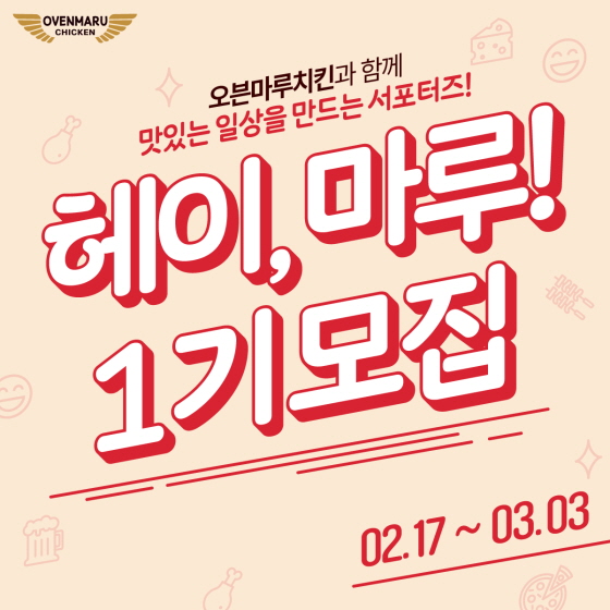 오븐마루치킨 브랜드 서포터즈 헤이 마루 1기 모집 접수기간2025.02.17 ~ 2025.03.03 D+400 종료 참가자격 제한없음 주최(주)오엠푸드 1등상금(상품)기타 홈페이지 바로가기 첨부파일 다운로드 유의사항 ※본 내용은 참고 자료로 내용의 오류와 변동에 대해 책임지지 않습니다. (오류 및 변동 신고는 상단의 '제안/오류' 신고를 통해 해주십시오.) ※주최사 사정에 따라 일정 및 내용이 변경될 수 있으니 주최사 홈페이지 등을 통해 관련 안내를 수시로 확인하시기 바랍니다. 상세내용 ■ 제목오븐마루치킨 브랜드 서포터즈 헤이 마루 1기 모집 ■ 개요20대부터 60대까지 신청 가능! 폭넓은 연령대로 즐거운 활동 해보자구요! ■ 기간 - 모집기간 : 2025.02.17 ~ 2025.03.03. - 활동기간 : 2025.03 ~ 2025.05 (4개월간) ■ 참가자격 - 오븐마루에 관심있는 20 ~ 60대 - 서포터즈 미션을 성실하게 수행하실 분 - SNS 개인 계정 운영자 및 SNS 소통 적극적인 분 - 외식업, FnB 업계에 관심있으신 분 ■ 활동내용<매월 필수 미션 2회 수행>매월 2회 오븐마루치킨에 관한 게시글을 개인 SNS에 포스팅 후 활동 보고서를 작성하는 활동을 하게 됩니다!활동보고서라고 이름은 거창하지만 정말 간단한 보고서니 부담갖지 마세요! <신메뉴 품평회 진행>출시 예정인 신메뉴 관련 품평회를 진행하여 우주 최초 가장 먼저 신메뉴를 맛보실 수 있습니다!얼리어먹터들에게는 최고의 활동이겠죠?! ■ 지원방법구글폼 작성 : https://forms.gle/yRVJoX1KDx7VerE87 ■ 참여 혜택1. 매월 오븐마루치킨 쿠폰 2회 지급!ㄴ 지급된 쿠폰으로 매달 치킨 플렉스 가능! 2. 우수활동자 상금 지급ㄴ 1-3명의 우수활동자를 선정하여 상금을 지급할 예정입니다! 3. 활동 수료자 대상 수료증 발급ㄴ 취업, 스펙 쌓기에 도움되는 대외활동 수료증 발급! 4. 브랜드 정보 우선 제공ㄴ 출시 전 신메뉴 시식 기회 제공! 외에도 많은 활동이 기다리고 있습니다 ~~ 목록