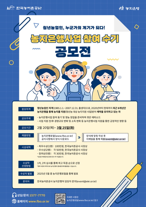 제2회 청년농업인 대상 농지은행사업 참여수기 공모전 공모분야 문학/시나리오, 기타분야 접수기간2025.02.20 ~ 2025.03.25 D+378 종료 참가자격 기타 제한 주최한국농어촌공사 농지은행처 1등상금(상품)100만원~199만원 홈페이지 바로가기 첨부파일 다운로드 유의사항 ※본 내용은 참고 자료로 내용의 오류와 변동에 대해 책임지지 않습니다. (오류 및 변동 신고는 상단의 '제안/오류' 신고를 통해 해주십시오.) ※주최사 사정에 따라 일정 및 내용이 변경될 수 있으니 주최사 홈페이지 등을 통해 관련 안내를 수시로 확인하시기 바랍니다. 상세내용 ■ 제목제2회 청년농업인 대상 농지은행사업 참여수기 공모전 ■ 기간 - 접수 기간 : 2025. 2. 20.(목) ~ 3. 25.(화) - 결과 발표 : 2025년 5월 중 농지은행포털을 통해 발표 ■ 참가자격 ‘20~현재까지 청년농업인 자격(1985.1.1.~2007.12.31. 출생자)으로 농지은행을 통해 농지를 지원(청년농 대상 농지지원사업)받아 계약을 유지하고 있는 자 ■ 참여방법 / 접수방법<공모 주제> - 농지은행사업 참여 동기 및 영농창업을 준비하며 겪은 에피소드 - 사업 지원 전/후 경영규모 변화 및 소득 변화 등 농지은행사업 지원을 통한 긍정적인 영향 등 <접수 방법> - 농지은행 포털 공지사항에서 양식 다운로드 - 양식에 맞춰 작성 후 이메일을 통해 제출 ※ 제출 이메일 : event@ekr.or.kr ■ 시상내용 / 혜택 - 최우수상 1명 : 100만원, 한국농어촌공사 사장상 - 우수상 2명 : 각 50만원, 한국농어촌공사 사장상 - 장려상 5명 : 각 30만원, 한국농어촌공사 사장상 ■ 유의사항 - 공모전에 출품된 작품에 대한 저작권(저작재산권, 저작인격권)은 응모자에게 있으며, 수상 후에도 입상자에게 귀속됨을 원칙으로 합니다. - 주최자는 입상작(최우수상, 우수상, 장려상)에 대하여 비영리 목적으로 3년 동안 비독점적으로 복제, 전시할 수 있습니다. - 수상작은 홍보를 위해 3년간 사보, SNS 게시 등의 방법으로 온라인 등에서 사용될 수 있습니다.(일부 변형 포함) - 응모자는 응모와 동시에 추후 입상 시 공모전 요강에 기재되어 있는 이용 방법 및 조건의 범위 안에서 저작물(입상작) 이용을 허락한 것으로 보고, 입상작의 저작재산권에 대한 이용료는 입상에 따른 시상금(또는 상품)으로 대체될 수 있습니다. - 향후, 주최자는 입상작에 대한 저작재산권(전부 또는 일부)을 양수할 필요가 있거나, 공모전 요강에 공고된 범위를 넘어 입상작을 이용할 경우, 저작자와 별도로 합의하여 정합니다. - 응모자는 공모전의 저작권과 관련한 이의 사항이 있을 경우, 한국농어촌공사 농지은행처 담당자(061-338-5863)를 통해 이의신청할 수 있습니다. - 향후 공모전 출품작 저작권과 관련한 분쟁이 발생할 경우 한국저작권위원회에 조정을 신청하여 해결할 수 있으며, 양 당사자는 원활한 분쟁 해결을 위해 상호 노력합니다. - 응모자는 응모작이 제3자의 저작권, 초상권 등을 침해하지 않도록 주의의무를 다하여야 합니다. - 주최자는 응모작 유출 방지 등 주의의무를 다하겠습니다. - 심사와 관련된 모든 서류는 공개하지 않으며 출품작이 심사 기준에 부합하지 않을 경우, 상금 및 수상 인원 등은 변동될 수 있습니다. - 잘못된 개인정보 기재로 인한 경품 및 상금 수령 불이익의 책임은 응모자에게 있으며 해당 주최 기관 측에서 책임지지 않습니다. - 공모전 참가자는 공모 참가 신청서 및 개인정보수집, 이용, 제공 동의서, 공모전 요강 및 유의사항 확인서를 제출해야 합니다. - 1인당 최대 2개 작품까지 제출할 수 있습니다. - 농지은행사업 참여 여부가 확인되지 않을 경우, 시상이 어려울 수 있으니 반드시 이름, 생년월일, 연락처, 사업 참여 시기를 정확히 기재하여 주시기를 바랍니다. - 관련 서류 미제출 및 허위 기재 등 출품 내용이 사실과 다를 경우 상금 및 수상이 취소될 수 있습니다. - 추후 수상 시 상금에 대한 제세공과금은 수상자가 부담하여야 합니다. ■ 문의 - 전화 : 1577-7770 - 이메일 : event@ekr.or.kr 목록