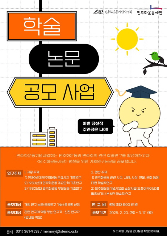 2025년 민주화운동기념사업회 학술논문공모 공모분야 문학/시나리오, 기타분야 접수기간2025.02.20 ~ 2025.03.17 D+385 종료 참가자격 기타 제한 주최민주화운동기념사업회 1등상금(상품)500만원~1천만원 홈페이지 바로가기 첨부파일 다운로드 유의사항 ※본 내용은 참고 자료로 내용의 오류와 변동에 대해 책임지지 않습니다. (오류 및 변동 신고는 상단의 '제안/오류' 신고를 통해 해주십시오.) ※주최사 사정에 따라 일정 및 내용이 변경될 수 있으니 주최사 홈페이지 등을 통해 관련 안내를 수시로 확인하시기 바랍니다. 상세내용 ■ 제목2025년 민주화운동기념사업회 학술논문공모 ■ 개요민주화운동기념사업회는 민주화운동과 민주주의 관련 학술연구를 활성화하고자, ‘<민주화운동사전> 편찬을 위한 기초연구 지원 사업’을 공모하오니, 연구자 여러분의 많은 관심과 참여를 바랍니다. ■ 기간 - 접수 기간: 2월 20일(월) ~ 3월 17일(월) - 결과 발표: 4월 1일(화) / 민주화운동기념사업회 홈페이지 공지 및 개별 통지 ■ 참가자격민주화운동과 민주주의 관련 연구에 역량 있는 연구자 - 국내ㆍ외 학술연구기관(연구소) 및 교육기관에 소속된 관련 분야 연구원 ․ 대학강사 ․ 석 박사(과정생 포함) - 학술지(등재후보지 이상)에 논문 게재가 가능한 연구자 ■ 참여방법 / 접수방법<지정주제> - 1980년대 민주화운동 주요사건 기초연구 (사건 예시: 서울미문화점거농성사건, 인천5.3민주항쟁 등) - 1980년대 민주화운동 주요단체 기초연구 (단체 예시: 민주화운동청년연합(민청련), 민족통일민중운동연합(민통련), 전국학생총연합(전학련), 민주헌법쟁취국민운동본부(국본) 등) - 1980년대 민주화운동 관련 부문운동 기초연구 (부문운동 예시: 학생운동, 노동운동, 재야운동 등) <일반주제> - 민주화운동 관련 사건, 사례, 사상, 조직, 인물, 문화 등에 대한 학술적 연구 - 민주화운동기념사업회 소장 사료(오픈아카이브)를 활용하거나 분석한 학술적 연구 ※ ‘25년 <민주화운동사전> 편찬 사업과 연계된 지정주제 응모자에게는 가산점을 부여 ※ 괄호 안 예시는 참고하되, 제시된 예시 외 지정주제 내에서의 소재선택은 자유롭게 가능 <공모 대상> 개인 연구 논문(공동연구 가능) 총 5편 선정 ※ 공동연구 인원은 2~3인 이내로 할 것 ※ 선정작 내역과 규모는 응모작 개수 및 수준에 따라 조정될 수 있음 <응모 방법> - 제출서류: 논문공모 신청서, 연구계획서(첨부 양식) 각 1부 - 제출방법: 이메일 memory@kdemo.or.kr로 마감시한 내 도착분에 한함. <신청서 및 연구계획서 양식(별첨) 다운로드> - 민주화운동기념사업회 홈페이지(www.kdemo.or.kr) - 기억과전망 원고투고시스템(http://kdemo.jams.or.kr/) ■ 시상내용 / 혜택연구비 : 편당 최대 500만 원 - 정해진 기한 내 진행상황보고서를 2회 이상 제출하고, 중간보고회 참석 및 최종보고서 제출 시 400만 원 지급 - 53호 기억과전망에 투고 후 논문 게재확정 시 게재료 100만 원 추가지급 ■ 유의사항자세한 내용은 홈페이지 공지글의 첨부파일 안내문 참고 ■ 문의 2025 민주화운동기념사업회 학술논문공모 사업 담당자 - 연락처: 031-361-9538 - 이메일: memory@kdemo.or.kr 목록