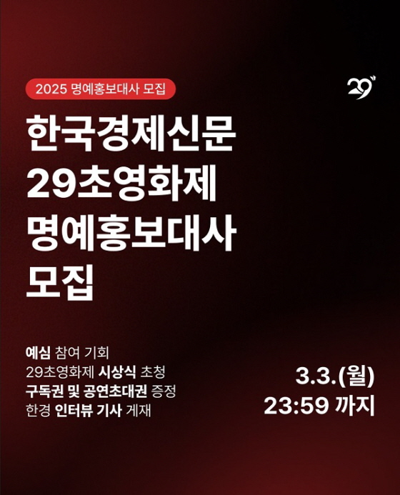 한국경제신문 29초영화제 2025 명예홍보대사 모집 접수기간2025.02.20 ~ 2025.03.03 D+399 종료 참가자격 제한없음 주최한국경제신문 주관29초영화제사무국 1등상금(상품)기타 홈페이지 바로가기 첨부파일 다운로드 유의사항 ※본 내용은 참고 자료로 내용의 오류와 변동에 대해 책임지지 않습니다. (오류 및 변동 신고는 상단의 '제안/오류' 신고를 통해 해주십시오.) ※주최사 사정에 따라 일정 및 내용이 변경될 수 있으니 주최사 홈페이지 등을 통해 관련 안내를 수시로 확인하시기 바랍니다. 상세내용 ■ 제목한국경제신문 29초영화제 2025 명예홍보대사 모집 ■ 개요명예홍보대사는 각자의 개성과 정성이 담긴 콘텐츠로써 29초영화제를 널리 알리고, 더욱 많은 영상인이 영화제에 참여할 수 있도록 독려하는 역할을 맡게 됩니다. ■ 기간-모집기간: 2025.2.20.(목) ~ 2025.3.3.(월)-결과발표: 2025.3.10.(월) 홈페이지 공지 및 개별안내-위 촉 식: (결과발표 이후 별도 안내 예정)-활동기간: 2025.3. ~ 2025.12. ■ 참가자격-영상 또는 영화 관련 SNS(유튜브, 블로그 등) 활동을 활발히 하고 있는 분-매월 1건 이상 29초영화제 관련 콘텐츠를 제작하고 SNS에 업로드할 수 있는 분-(우대) 영상/영화 분야 종사자 또는 인플루언서 ■ 활동내용-29초영화제 홍보콘텐츠 제작 및 개인SNS 업로드 (매월 1건 이상) *콘텐츠 예시: 29초영화제 수상작 및 출품작 소개, 29초영화제 주요 소식 안내 등 *29초영화제 관련 소스는 사무국에서 제공해 드립니다. <29초영화제 홈페이지 및 SNS>-홈페이지: https://www.29sfilm.com/-인스타그램: https://www.instagram.com/29sfilm_official/-유튜브: https://www.youtube.com/@29sfilm_official ■ 지원방법구글폼 접수https://docs.google.com/forms/d/e/1FAIpQLSdptcihTReGSY-EsHN4k1YM163MeVaDCyAnXUnNLG3SVU1GPw/formResponse ■ 참여 혜택[기본 혜택] -29초영화제 홈페이지를 통한 명예홍보대사 운영채널(SNS) 홍보 -29초영화제 예심 참여 기회 제공 (참여 시 소정의 심사료 지급) -29초영화제 시상식 초청 -위촉장 및 29초영화제 굿즈 제공 -믹스오디오(생성형 AI를 활용한 BGM 제작 플랫폼) 2개월 무료이용 쿠폰 발급 -모바일한경 1개월 구독권 증정 -한경아르떼필하모닉 공연초대권 증정 등 [홍보대사장 혜택] – 활동시작 시 선정 -매월 소정의 활동비 지급 *홍보대사장: 홍보대사 활동 관리 및 29초영화제사무국과의 주된 소통 담당 [우수자 혜택] – 활동종료 시 선정 -한경 인터뷰기사(온라인) 게재 또는 활동비 지급 ■ 유의사항- 콘텐츠는 매월 1건 이상 업로드 되어야 하며, 온라인(네이버 카페)을 통한 증빙까지 완료되어야 활동한 것으로 인정됩니다.- 선정 후, 카카오톡 오픈채팅방을 통해 활동안내 및 소통이 이루어집니다.- 활동이 저조한 경우 해촉될 수 있습니다. ■ 문의카카오톡 채널 ‘29초영화제’ 채팅 문의 목록