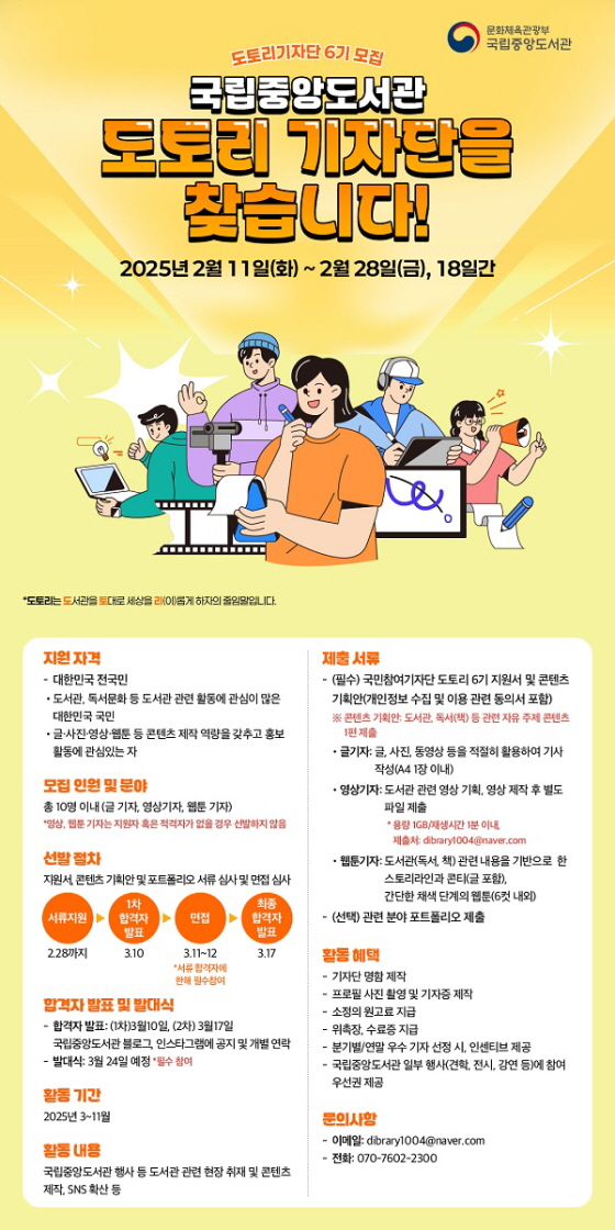 2025 국립중앙도서관 국민참여기자단 도토리 6기 모집 접수기간2025.02.11 ~ 2025.02.28 D+402 종료 참가자격 제한없음 주최국립중앙도서관 1등상금(상품)기타 홈페이지 바로가기 첨부파일 다운로드 유의사항 ※본 내용은 참고 자료로 내용의 오류와 변동에 대해 책임지지 않습니다. (오류 및 변동 신고는 상단의 '제안/오류' 신고를 통해 해주십시오.) ※주최사 사정에 따라 일정 및 내용이 변경될 수 있으니 주최사 홈페이지 등을 통해 관련 안내를 수시로 확인하시기 바랍니다. 상세내용 ■ 제목2025 국립중앙도서관 국민참여기자단 도토리 6기 모집 ■ 개요2025년도 국립중앙도서관 국민참여기자단 도토리6기를 모집합니다.도서관 및 독서문화 등 도서관 관련 활동에 관심이 많고 SNS 글, 사진, 영상 등 디지털 콘텐츠 제작 능력을 보유한 대한민국 국민이라면 누구나 지원 가능합니다! ■ 기간 - 접수기간 : 2025년 2월 11일(화) ~ 2월 28일(금) - 활동 기간 : 2025년 3~11월 - 서류합격자 발표 : 2025년 3월 10일 - 면접 : 3월 11일~12일 / 비대면 온라인 진행 - 최종 합격자 발표 : 3월 17일 / 국립중앙도서관 블로그, 인스타그램에 공지 및 개별 연락 - 발대식 : 2025년 3월 24일 예정 (필수 참석) ■ 참가자격대한민국 국민 - 도서관, 독서문화 등 도서관 관련 활동에 관심이 많은 누구나 - 글·사진·영상·웹툰 등 콘텐츠 제작 역량을 갖추고 홍보 활동에 관심있는 자 <모집인원 및 분야> - 총 10명 이내 - 글기자 / 영상기자 / 웹툰기자: 총 3개 분야 ※ 영상 및 웹툰기자는 지원자 혹은 적격자가 없을 시 선발하지 않음 ■ 활동내용 - 국립중앙도서관 행사 등 도서관 관련 현장 취재 및 콘텐츠 제작, SNS 확산 등 ※ 활동 내용은 도서관의 요청에 따라 일부 변경될 수 있음 * 글기자: A4 2장 이상 (13pt, 줄 간격 160, 이미지 제외), 월 1회 * 영상기자: 1~3분 이내(인트로, 아웃트로 포함), 월 1회 * 웹툰기자: 8~10컷 내외 (표지 포함/인스타그램 발행 기준), 월 1회 ■ 지원방법 - 공식 블로그에서 신청서 양식 다운로드 후, 네이버폼으로 제출 ※ 제출 파일명: 도토리 6기_성명_지원분야_거주지역 예시) 도토리 6기_홍길동_웹툰기자_서울 ※ 네이버폼 : https://form.naver.com/response/D8EvwSJgL4HUAcN1PSmyRQ <제출 서류> - (필수) 국민참여기자단 도토리 6기 지원서 및 콘텐츠 기획안(개인정보 수집 및 이용 관련 동의서 포함)※ 콘텐츠 기획안: 도서관, 독서(책) 등 관련 자유 주제 콘텐츠 1편 제출 * 글기자: 글, 사진, 동영상 등을 적절히 활용하여 기사 작성(A4 1장 이내) * 영상기자: 도서관 관련 영상 기획, 영상 제작 후 별도 파일 제출 (용량 1GB/재생시간 1분 이내, 제출처: dibrary1004@naver.com) * 웹툰기자: 도서관(독서, 책) 관련 내용을 기반으로 한 스토리라인과 콘티(글 포함), 간단한 채색 단계의 웹툰(6컷 내외) - (선택) 관련 분야 포트폴리오 제출 ■ 참여 혜택 1. 기자단 명함 제작 2. 프로필 사진 촬영 및 기자증 제작 3. 소정의 원고료 지급 4. 위촉장, 수료증 지급 5. 분기별/연말 우수 기자 선정 시, 인센티브 제공 6. 국립중앙도서관 일부 행사(견학, 전시, 강연 등)에 참여 우선권 제공 ■ 문의 - 이메일 : dibrary1004@naver.com - 전화 : 070-7602-2300 목록