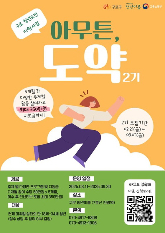 청년도전지원사업 아무튼 기대, 도약 참가 신청 접수기간2025.02.17 ~ 2025.03.07 D+395 종료 참가자격 기타 제한 주최구로 청년이룸 1등상금(상품)기타 홈페이지 바로가기 첨부파일 다운로드 유의사항 ※본 내용은 참고 자료로 내용의 오류와 변동에 대해 책임지지 않습니다. (오류 및 변동 신고는 상단의 '제안/오류' 신고를 통해 해주십시오.) ※주최사 사정에 따라 일정 및 내용이 변경될 수 있으니 주최사 홈페이지 등을 통해 관련 안내를 수시로 확인하시기 바랍니다. 상세내용 ■ 제목청년도전지원사업 아무튼 기대, 도약 참가 신청 ■ 개요 2025 청년도전지원사업 - 소그룹 프로그램을 통한 자신감, 연대감 충족 - 진로탐색 등의 프로그램을 통한 구직 활동 지원 - 프로그램 수료 시, 지원금 제공 등 ■ 기간1. 청년도전지원사업 <아무튼, 기대> - 모집 기간 : 2025. 02.17.(월) ~ 2025. 02.28.(금) (선착순 마감) - 모집 인원 : 총 15명 - 진행 기간 : 승인일 ~ 04.09 (수) ※ 수료시 참여수당 50만원 지급 - 장소 : 구로 청년이룸 (7호선 천왕역 4번 출구 방향 지하 1층) 2. 청년도전지원사업 장기 프로그램 <아무튼, 도약 2기> - 모집 기간 : 2025. 02.21.(금) ~ 2025. 03.07.(금) (선착순 마감) - 모집 인원 : 총 15명 - 진행 기간 : 승인일 ~2025.09.30(화) - 장소 : 구로 청년이룸 (7호선 천왕역 4번 출구 방향 지하 1층) ■ 참가자격 - 6개월 이상 취업 및 교육, 직업 훈련 참여 이력이 없는 만 18세~34세 청년 - 아동복지시설 등에서 퇴소한 5년 이내의 청년 또는 퇴소일을 연장한 만 18세~34세 청년 - 청소년복지시설에서 6개월 이상 보호한 만 18세~34세 청년 - 북한을 이탈한 만 18세~34세 청년 - 이외에도 지자체 및 운영기관 기준 하에 참여가 인정될 수 있는 청년(유선 문의 시 정확하게 안내 가능) ■ 지원방법고용24 홈페이지 혹은 구글폼을 통한 접수<아무튼 기대 구글폼 참가 신청>https://docs.google.com/forms/d/e/1FAIpQLSe0IDkAWZ83NMnyTXyiSdD2g-hpzvKYDqYtZMOG_HVfao1i7g/viewform <아무튼, 도약 2기 구글폼 참가 신청>https://docs.google.com/forms/d/1kbKcKPhnWCIHF_yNOXlxsM3s8ACidMyZna6yQygmzbU/viewform?edit_requested=true ■ 참여 혜택- 수료 후 참여수당 지급 (아무튼 기대 50만원 / 아무튼 도약 최대 350만원) ■ 유의사항기타 자세한 내용은 주최측에 문의가 필요합니다. ■ 문의 - Tel : 070-4913-1906 / 070-4913-3809 - E-mail : eroom.youth.ch@gmail.com - 카카오톡플러스친구 : '구로청년도전지원사업' 검색 후 , 채팅문의 ※ 신청서를 제출해주시면 담당자가 확인 후 개별 연락드립니다! (신청서 제출 후 영업일 기준 3일 이내 회신) 목록