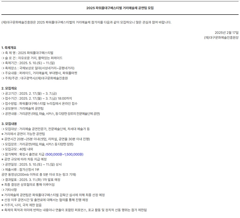 2025 파워풀대구페스티벌 거리예술제 공연팀 모집 접수기간2025.02.17 ~ 2025.03.07 D+394 종료 참가자격 제한없음 주최대구광역시 주관(재)대구문화예술진흥원 1등상금(상품)100만원~199만원 홈페이지 바로가기 첨부파일 다운로드 유의사항 ※본 내용은 참고 자료로 내용의 오류와 변동에 대해 책임지지 않습니다. (오류 및 변동 신고는 상단의 '제안/오류' 신고를 통해 해주십시오.) ※주최사 사정에 따라 일정 및 내용이 변경될 수 있으니 주최사 홈페이지 등을 통해 관련 안내를 수시로 확인하시기 바랍니다. 상세내용 ■ 제목2025 파워풀대구페스티벌 거리예술제 공연팀 모집 ■ 기간 - 접수기간 : 2025. 2. 17.(월) ~ 3. 7.(금) 18:00까지 - 공연일정 : 2025. 5. 10.(토) ~ 11.(일) 상시 - 결과발표 : 2025. 3. 11.(화) 1차 발표 예정 ※ 최종 결정은 상호협의로 통해 이루어짐 ■ 참가자격거리예술 공연전문가, 전문예술단체, 차세대 예술가 등 - 거리에서 공연이 가능한 공연팀 - 공연시간 20분~25분 이내(셋업, 리허설, 공연을 30분 이내 진행) ◯ 모집장르 : 거리공연(마임, 마술, 서커스 등 다양한 장르)◯ 모집규모 : 40팀 내외 ■ 지원방법제출서류 : 참가신청서 1부 (파워풀대구페스티벌 누리집에서 다운로드)공연 동영상 (200mb 이하로 총 5분 이내 또는 링크 기재) 파워풀대구페스티벌 누리집에서 온라인 접수https://www.pwf.or.kr/Street-Festival?menuId=MENU_0000000228 ■ 참여 혜택확정시 출연료 지급 (500,000원~1,500,000원)※ 공연 규모에 따라 차등 지급 예정 ■ 유의사항※ 거리예술제 공연팀은 파워풀대구페스티벌 감독단 심사에 의해 최종 선정 예정※ 선정 이후 공연시간 및 출연료에 대해서는 협의를 통해 진행 예정※ 거주지, 나이, 국적 제한 없음※ 축제의 목적과 의미에 반하는 내용이나 연출이 포함된 퍼포먼스, 포교 활동 및 정치적 선동 행위는 참가 제한됨 - 해당 공연과 관련된 음원 및 연출과 관련된 저작권 및 지식재산권 관련 법적 책임은 참가자에게 있음 - 공연은 축제의 슬로건 및 취지에 맞게 구성되어야 하며, 축제의 목적과 의미에 반하는 내용과 연출은 참가에 제한이 있음 - 신청서 제출 시 허위기재, 작성누락, 자격요건 미비 및 제출 서류 미비 시 배제될 수 있으며, 추가 자료 요청이나 전화 인터뷰가 있을 수 있음 - 제출된 공연계획서 외 연출은 심사 시 감점 요소가 될 수 있음 - 자격요건에 부합하지 않는 단체(개인), 제출서류 및 자료가 미비한 단체는 배제될 수 있으며, 필요시 추가자료 요청 및 전화 인터뷰 예정 - 공연 일정은 선정된 단체(개인)을 대상으로 조율하여 감독단이 최종 결정하며 변경될 수 있음 - 사진 및 영상 촬영에 대한 사항은 모든 참가자가 동의한 것으로 간주하며, 해당 자료는 홍보 등 공익 목적에 사용될 수 있음 ■ 문의 - 홈페이지 : www.pwf.or.kr - 이메일 : festival@dgfca.or.kr - 연락처 : 축제지원팀 053-430-5694 목록