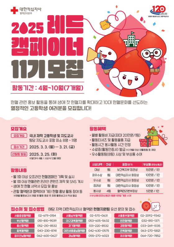 2025년 레드캠페이너 11기 모집 접수기간2025.03.03 ~ 2025.03.21 D+380 종료 참가자격 청소년 주최대한적십자사 1등상금(상품)기타 홈페이지 바로가기 첨부파일 다운로드 유의사항 ※본 내용은 참고 자료로 내용의 오류와 변동에 대해 책임지지 않습니다. (오류 및 변동 신고는 상단의 '제안/오류' 신고를 통해 해주십시오.) ※주최사 사정에 따라 일정 및 내용이 변경될 수 있으니 주최사 홈페이지 등을 통해 관련 안내를 수시로 확인하시기 바랍니다. 상세내용 ■ 제목2025년 레드캠페이너 11기 모집 ■ 개요레드캠페이너는 대한적십자사의 고등학생 헌혈 서포터즈로 2012년 1기부터 시작되어2024년 10기까지 운영되고 있습니다. 각 지역의 혈액원과 협력해서 활동하는 ‘레드캠페이너’는 다양한 헌혈 관련 활동을 통해 생애 첫 헌혈자를 확대하고 헌혈인식 개선 등을 위한 홍보 역할을 하며 헌혈문화를 확산하는 중요한 미션을 수행하게 됩니다. ■ 기간 - 접수기간 : 2025. 3. 3.(월) ~ 3.21.(금) - 선발팀 발표 : 본부 홈페이지 3.25.(화) 공지 - 활동기간 : 2025년 4월 ~ 10월 - 발대식 : 2025년 4월 중 - 수료식, 시상 및 인증서 발급 : 2025년 12월 중 예정 ※ 활동보고서 제출 : 매월 말까지 본부 홈페이지 [레드캠페이너-활동보고서] 게시판 제출 ※ 최종 활동보고서 제출 : 10월 24일까지 해당 혈액원 헌혈지원팀에 제출 ■ 참가자격 국내 재학 고등학생 및 지도교사 (팀당 지도교사 포함 최소 8~11명) ■ 활동내용 1. 월 1회 이상 오프라인 헌혈캠페인을 통해 헌혈과 생애첫헌혈자 모집을 위한 홍보 실시 2. 월 1회 이상 헌혈관련 온라인 콘텐츠 제작 및 SNS 게시를 통한 헌혈 홍보 실시 ※ (SNS 계정) 팀별 SNS 계정 생성 또는 기존 활동 중인 개인 SNS 계정 활용 가능 / (활동 SNS) 유튜브, 인스타그램, 네이버블로그, 틱톡 등 3. 혈액관리본부 홈페이지 [레드캠페이너-활동게시판]에 활동게시물 게시 4. 캠페인 활동을 기획하고 자체 홍보물을 제작하여 캠페인 시 활용 5. 혈액원과 협의를 통해 기타 헌혈 홍보 활동 참여 6. 매월 활동보고서를 본부 홈페이지 [레드캠페이너-활동보고서] 게시판으로 제출 7. 활동 종료 후 최종 활동보고서(PPT 또는 한글문서) 작성 후 해당 혈액원 제출 ■ 지원방법접수처 : 해당 지역 대한적십자사 혈액원 헌혈지원팀 유선 문의 및 접수 ■ 참여 혜택 1. 우수활동팀(8팀)* 선정 보건복지부장관상, 대한적십자사 회장상 또는 혈액관리본부장상 수여 * 대상 1팀, 최우수상 1팀, 우수상 1팀, 장려상 1팀, 봉사상 4팀 상장수여 및 부상품 지급 2. 팀 활동비 지급 (월 활동보고서 제출 후, 지도교사를 통해 활동지원비 지급) 3. 활동 종료 후 수료팀 레드캠페이너 활동 인증서 발급 4. 봉사활동 시간 인정(실제 헌혈캠페인 참여 시간 / 온라인 활동 제외) 5. 지원 물품 제공(단체티셔츠, 생애첫헌혈서약서, 활동배너 등) ■ 문의해당 지역 대한적십자사 혈액원 헌혈지원팀 ※ 포스터 연락처 참조 목록