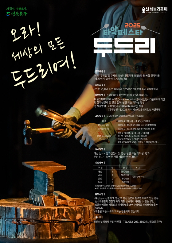 2025 타악페스타 두드리 참여단체 모집 공모분야 로고송/음악 접수기간2025.02.21 ~ 2025.03.21 D+380 종료 참가자격 기타 제한 주최울산쇠부리축제 추진위원회 1등상금(상품)200만원~499만원 홈페이지 바로가기 첨부파일 다운로드 유의사항 ※본 내용은 참고 자료로 내용의 오류와 변동에 대해 책임지지 않습니다. (오류 및 변동 신고는 상단의 '제안/오류' 신고를 통해 해주십시오.) ※주최사 사정에 따라 일정 및 내용이 변경될 수 있으니 주최사 홈페이지 등을 통해 관련 안내를 수시로 확인하시기 바랍니다. 상세내용 ■ 제목2025 타악페스타 두드리 참여단체 모집 ■ 기간 - 접수기간 : 2025. 2. 21.(금) ~ 3. 21(금) - 1차 결과 발표 : 2025. 3. 25.(화) 누리집 및 개별 통보 - 오리엔테이션 : 2025. 3. 29.(토) 비대면 온라인 진행 - 리허설 : 2025. 5. 9.(금) ~ 10.(토) - 경연 : 2025. 5. 10.(토) 14:00~ - 시상식 : 2025. 5. 10.(토) 17:00~ - 앵콜공연(대상 수상팀) : - 경연 : 2025. 5. 11.(일) 18:00~ ■ 참가자격 6인 이상(최대 10인 내외)의 전문예술단체, 아마추어 예술 동아리 ※ 선정 규모 : 10 단체 ■ 참여방법 / 접수방법<공모 내용> - '쇠'와 '두드림'을 주제로 하는 음악 경연대회 (타악기, 금속악기, 탭댄스 등 ‘두드림’을 기반으로 하는 융,복합 창작작품) - 10분 내외(최대 15분)의 1개 작품 <지원 방법> - 참가신청서 1부 (울산쇠부리축제 누리집에서 양식 다운로드) - 10분 내외의 실연 또는 리허설 영상 - 이메일(ussf1@soeburi.org) 접수 / 현장접수 불가 ※ 이메일명 : [2025 타악페스타_두드리]_참가단체명 ■ 시상내용 / 혜택 상장/상패 수여 - 대상 1팀 : 200만원 - 금상 2팀 : 각 100만원 - 은상 2팀 : 각 50만원 - 동상 5팀 : 각 30만원 ※ 본선 참가팀에게는 제작지원금(20만원) 지급 예정 ※ 대상 수상팀은 제21회 울산쇠부리축제 폐막행사에 앵콜공연 필수 ■ 유의사항 - 예선 심사 내용(참가신청서 및 영상)과 본선 실연이 현격한 차이가 있을 경우 심사위원의 결정에 따라 최종 심사에서 배재될 수 있습니다. - 출품한 작품의 작품성이 현저히 낮을 경우 수상작을 선정하지 않을 수 있습니다. - 제출된 모든 서류와 자료는 반환되지 않습니다. ■ 문의 - 울산쇠부리축제 추진위원회 052-293-3500 (일, 월 휴무) 목록