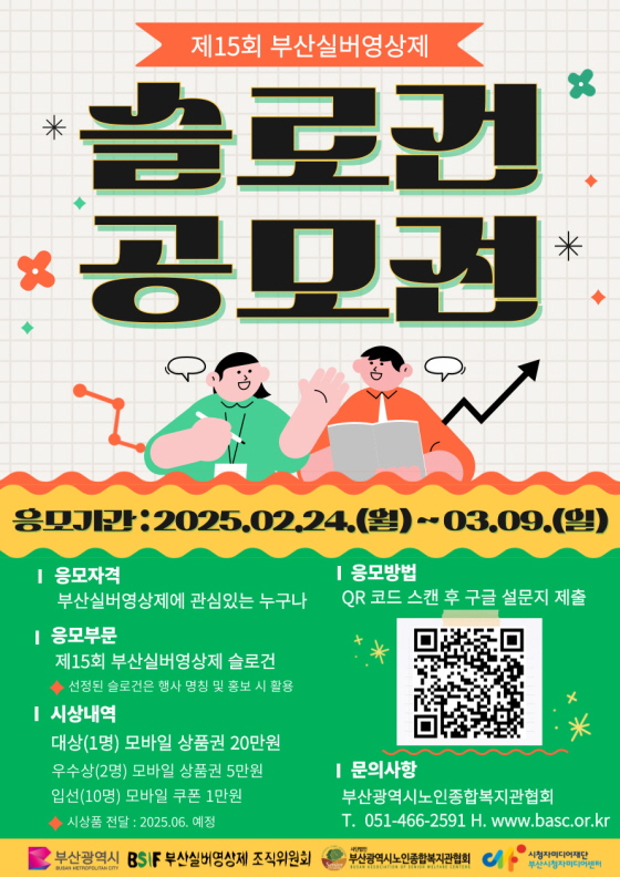 2025년 제15회 부산실버영상제 슬로건 공모전 공모분야 네이밍/슬로건 접수기간2025.02.24 ~ 2025.03.09 D+393 종료 참가자격 제한없음 주최부산광역시, 사단법인부산광역시노인종합복지관협회 1등상금(상품)기타 홈페이지 바로가기 첨부파일 다운로드 유의사항 ※본 내용은 참고 자료로 내용의 오류와 변동에 대해 책임지지 않습니다. (오류 및 변동 신고는 상단의 '제안/오류' 신고를 통해 해주십시오.) ※주최사 사정에 따라 일정 및 내용이 변경될 수 있으니 주최사 홈페이지 등을 통해 관련 안내를 수시로 확인하시기 바랍니다. 상세내용 ■ 제목2025년 제15회 부산실버영상제 슬로건 공모전 ■ 개요1. 부산광역시노인종합복지관협회에서는 부산실버영상제 조직위원회와 함께 노인에 대한 부정적인 인식을 개선하고, 다양한 세대와 소통할 수 있는 신 노인문화 정착 사업 제15회 부산실버영상제를 개최합니다.2. 제15회 부산실버영상제를 맞아 「슬로건 공모전」을 아래와 같이 진행하오니 많은 관심과 참여 부탁드립니다. ■ 기간 - 접수기간 : 2025.02.24.(월)~03.09.(일) - 선정일자 : 2025.04.04.(금) 협회 홈페이지를 통해 발표 ■ 참가자격 부산실버영상제에 관심 있는 누구나 ■ 참여방법 / 접수방법◯ 응모부문 : 제15회 부산실버영상제 슬로건 ※ 선정된 슬로건은 행사 명칭 및 홍보 시 사용 ◯ 신청방법 : 구글 설문지 제출 (http://eurl.kr/Ny5iR / QR코드) ■ 시상내용 / 혜택 1) 대 상 : 1명 (모바일 상품권 20만원) 2) 우수상 : 2명 (모바일 상품권 5만원) 3) 입 선 : 10명 (모바일 쿠폰 1만원) ※ 시상품의 경우 6월 전달 예정 ■ 문의 남지혜 팀장 (전화 : 051-466-2591) 목록