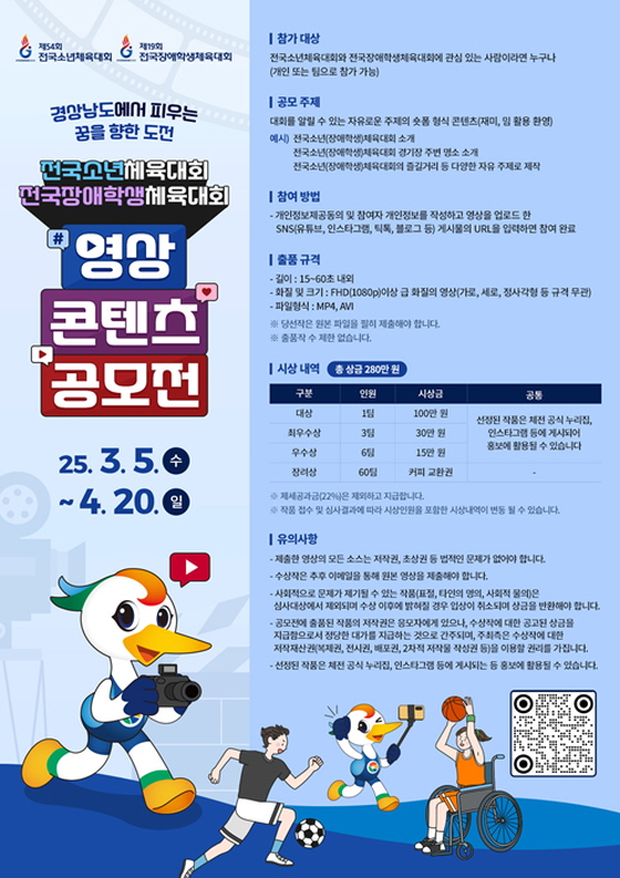 전국소년체육대회 전국장애학생체육대회 영상 콘텐츠 공모전 공모분야 사진/영상 접수기간2025.03.05 ~ 2025.04.20 D+351 종료 참가자격 제한없음 주최대한체육회, 대한장애인체육회 1등상금(상품)100만원~199만원 홈페이지 바로가기 첨부파일 다운로드 유의사항 ※본 내용은 참고 자료로 내용의 오류와 변동에 대해 책임지지 않습니다. (오류 및 변동 신고는 상단의 '제안/오류' 신고를 통해 해주십시오.) ※주최사 사정에 따라 일정 및 내용이 변경될 수 있으니 주최사 홈페이지 등을 통해 관련 안내를 수시로 확인하시기 바랍니다. 상세내용 ■ 제목전국소년체육대회 전국장애학생체육대회 영상 콘텐츠 공모전 ■ 기간 - 접수 일정 : 2025. 03. 05.(수) ~ 2025. 04. 20.(일) - 최종 발표 : 2025. 04. 25.(금) 모집 홈페이지 내 확인 및 입상자 개별 연락 ■ 참가자격 - 전국소년체육대회와 전국장애학생체육대회에 관심 있는 사람이라면 누구나 (개인 또는 팀으로 참가 가능) ■ 참여방법 / 접수방법<공모 주제> - 대회를 알릴 수 있는 자유로운 주제의 숏폼 형식 콘텐츠(재미, 밈 활용 환영)(예시) * 전국소년(장애학생)체육대회 소개 * 전국소년(장애학생)체육대회 경기장 주변 명소 소개 * 전국소년(장애학생)체육대회의 즐길거리 등 다양한 자유 주제로 제작 <제출 형식> - 길이 : 15~60초 내외 - 화질 및 크기 : FHD(1080p)이상 급 화질의 영상(가로, 세로, 정사각형 등 규격 무관) - 파일 형식 : MP4, AVI ※ 당선작은 원본 파일을 필히 제출해야 합니다. ※ 출품작 수 제한 없습니다. <참여 방법> - 개인정보제공동의, 참여자 개인정보를 작성하여 영상을 업로드 한 SNS(유튜브, 인스타그램, 틱톡, 블로그 등) 게시물의 URL을 입력하면 참여 완료 ■ 시상내용 / 혜택 - 대상 1팀 : 100만원 - 최우수상 3팀 : 30만원 - 우수상 6팀 : 15만원 - 장려상 60팀 : 커피 교환권 ■ 유의사항 - 제출한 영상의 모든 소스는 저작권, 초상권 등 법적인 문제가 없어야 합니다. - 수상작은 추후 이메일을 통해 원본 영상을 제출해야 합니다. - 사회적으로 문제가 제기될 수 있는 작품(표절, 타인의 명의, 사회적 물의)은 심사대상에서 제외되며, 수상 이후에 밝혀질 경우 입상이 취소되며 상금을 반환해야 합니다. - 공모전에 출품된 작품의 저작권은 응모자에게 있으나, 수상작에 대한 공고된 상금을 지급함으로서 정당한 대가를 지급하는 것으로 간주되며, 주최 측은 수상작에 대한 저작재산권(복제권, 전시권, 배포권, 2차적 저작물 작성권 등)을 이용할 권리를 가집니다. ■ 문의 공모전 홈페이지 카카오톡 문의하기를 통해 문의 목록