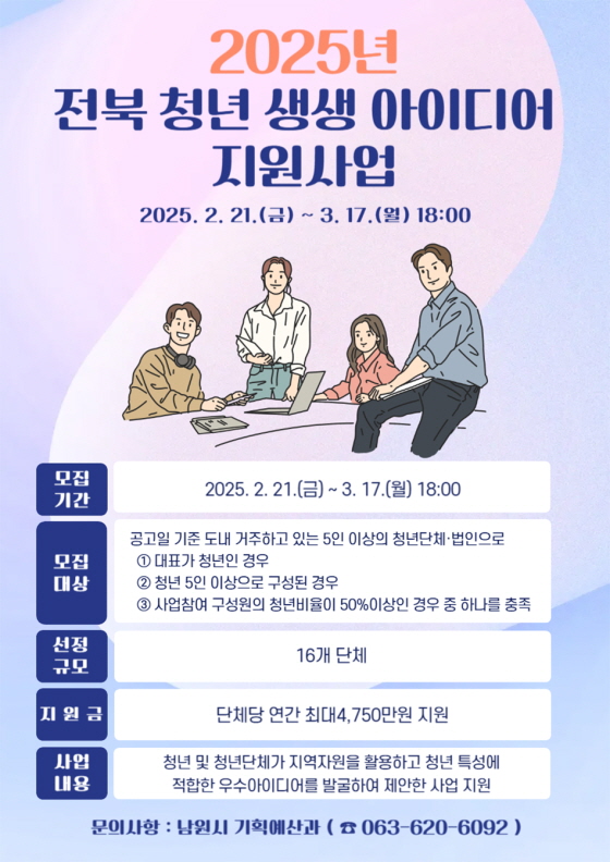 2025년 전북 청년 생생 아이디어 지원사업 공모 공모분야 창업/사업 지원 접수기간2025.02.21 ~ 2025.03.17 D+385 종료 참가자격 지역한정 주최남원시 1등상금(상품)기타 홈페이지 바로가기 첨부파일 다운로드 유의사항 ※본 내용은 참고 자료로 내용의 오류와 변동에 대해 책임지지 않습니다. (오류 및 변동 신고는 상단의 '제안/오류' 신고를 통해 해주십시오.) ※주최사 사정에 따라 일정 및 내용이 변경될 수 있으니 주최사 홈페이지 등을 통해 관련 안내를 수시로 확인하시기 바랍니다. 상세내용 ■ 제목2025년 전북 청년 생생 아이디어 지원사업 공모 ■ 개요청년이 구상·제안한 사업을 적극적으로 지원하기 위한 「2025년 전북 청년 생생아이디어 지원사업」에 참여할 청년단체를 모집하오니, 많은 관심 바랍니다. ■ 기간 - 접수기간 : 2025. 2. 21.(금) ~ 3. 17.(월) 18:00 - 발표심사 : 2025. 4월(예정) - 결과발표 : 2025. 4월(예정) * 시·군 공문 발송 및 공고예정 ■ 참가자격공고일 기준 도내 거주하고 있는 5인 이상의 청년단체·법인으로 ① 대표가 청년인 경우 ② 청년 5인 이상으로 구성된 경우 ③ 사업참여 구성원의 청년비율이 50%이상인 경우 중 하나를 충족 ※ 자세한 요건은 공고문 참조 ※ 선정규모 : 16개 단체 ■ 참여방법 / 접수방법◯ 사업내용 : 청년 및 청년단체가 지역자원을 활용하고 청년 특성에 적합한 우수아이디어를 발굴하여 제안한 사업 지원 ◯ 공모주제 : 전북 청년문제 해결을 위한 참여형 청년정책 사업 - 청년 일자리(취·창업) 창출 및 지원 사업 - 청년 주거 부담 완화 방안 - 청년 인구 유입 또는 청년의 결혼, 출산, 보육 등 저출산 극복 방안 - 청년의 문화 창작 및 향유 지원 사업 - 기존 도 청년정책 보완 및 개선 방안 등 ◯ 접수방법 : 남원시 기획예산과 접수(메일 접수 / 공고문붙임1 참조) * 고유번호증, 사업자등록증 등에 기재된 소재지 ○ 제출서류 : (서식3)사업 신청서, (서식4)사업별 계획서, (서식5)개인정보 동의서, 단체 및 법인 증빙서류 사본 1부(법인설립허가증, 법인등기부등본, 사업자등록증, 협동조합 신고필증 또는 설립인가증, 고유번호증 중 해당서류) ■ 시상내용 / 혜택지원금 : 단체당 연간 최대4,750만원 지원 ○ (제품 고도화 및 신규 아이템 개발) 발굴 아이템 고도화, 지속 가능성을 유지할 수 있는 우수아이템 개발 - (분야) 식품, 상품, 관광, 교육, 공연예술, IT, 서비스, 기타 등 - 개발비, 재료비, 시설장비‧공간 임차료 등 ○ (전문가 컨설팅) 청년단체(기업) 내·외부 역량 진단 및 성장전략 도출, 청년단체(기업) 도약을 위한 사업방향 및 단계별 방안 제시 - 전문가 활용, 역량강화, 인증․시험, 외주용역 ○ (홍보 지원) 단체(기업)에서 개발한 제품, 서비스 등 홍보 활동 소요 경비 - 디자인 개발, 온․오프라인 광고, 판로 개척 등 ■ 유의사항 - 제출된 서류는 공개·반환하지 않으며, 참여신청서 상의 기재착오 또는 누락이나 연락불능 등으로 인하여 발생하는 불이익은 일체 참여자의 책임임 - 본 공고문은 사정에 의하여 변경될 수 있으며, 변경된 사항은 도 홈페이지(www.jeonbuk.go.kr)에 공고함 ■ 문의남원시 기획예산과 (063-620-6092) 목록