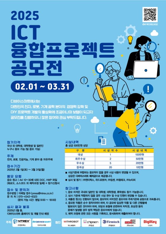 2025 ICT 융합 프로젝트 공모전 공모분야 기획/아이디어/마케팅, 게임/어플/프로그램 접수기간2025.02.01 ~ 2025.03.31 D+371 종료 참가자격 제한없음 주최(주)엔티렉스, 디바이스마트 1등상금(상품)100만원~199만원 홈페이지 바로가기 첨부파일 다운로드 유의사항 ※본 내용은 참고 자료로 내용의 오류와 변동에 대해 책임지지 않습니다. (오류 및 변동 신고는 상단의 '제안/오류' 신고를 통해 해주십시오.) ※주최사 사정에 따라 일정 및 내용이 변경될 수 있으니 주최사 홈페이지 등을 통해 관련 안내를 수시로 확인하시기 바랍니다. 상세내용 ■ 제목2025 ICT 융합 프로젝트 공모전 ■ 개요 디바이스마트에서는 대한민국 전자, 로봇, 기계 공학 분야의 경쟁력 강화 및 DIY 프로젝트 개발의 활성화에 조금이나마 보탬이 되고자 공모전을 진행하오니 많은 참여와 관심 부탁드립니다 ■ 기간 - 접수기간 : 2025년 2월 1일(토) ~ 3월 31일(월) - 결과 발표 : 2025년 5월 중, 디바이스마트 홈페이지 및 개별 안내 예정 ■ 참가자격국내외 대학생, 대학원생 및 일반인 누구나 응모 가능 (팀 응모 가능) ■ 참여방법 / 접수방법<공모 주제>전자, 로봇, 인공지능, 기계 분야 중 자유주제 <응모 요령>◌ 응모원고: A4 10~30매 내외 DOC, HWP 파일(회로도, 소스코드 외 제작 과정 일체) + 참가 신청서 <접수 방법>◌ 접수 : 이메일 접수 (press@ntrex.co.kr) ■ 시상내용 / 혜택 - 대상 1 100만원 - 최우수상 2 50만원 - 우수상 5 20만원 - 장려상 20 10만원 ▶ 시상기준에 부합하는 응모작이 없을 경우 시상 내용이 변경될 수 있으며, 상금은 디바이스마트 예치금으로 제공됩니다. ▶ 심사 및 평가: ㈜엔티렉스, 위드로봇㈜, ㈜칩센, ㈜펌테크, ㈜뉴티씨 ■ 유의사항<원고 작성 유의사항>1. 파일 형식 : DOC, HWP 중 택 1 2. 작성 분량 : A4 10~30매 내외(최대 글자 크기 12 point)3. 아래의 작성 목록을 기준으로 원고를 작성하여 주시기 바랍니다.- 작성 목록(최대한 자세하게 기술)1. 작품 제목2. 작품 개요3. 작품 설명3-1 주요 동작 및 특징3-2 전체 시스템 구성3-3 개발 환경(개발 언어, Tool, 사용 시스템 등) 4. 단계별 제작 과정5. 사용한 제품 리스트 (제품명, 제품 링크 포함)6. 기타(회로도, 소스코드, 참고문헌 등)4. 원고 응모 시 총 4개의 파일 (①+②+③+④)을 접수합니다. ①: 최종 원고②: 최종 원고에 사용한 자료(이미지, 회로도, 소스코드 등 원본)를 압축한 파일③: 공모전 참가신청서④: 작품에 사용한 부품명과 디바이스마트 상품코드 리스트 파일 <제출 자료 주의사항> - 이미지 파일은 직접 촬영하거나 제작한 원본 이미지로 파일 확장자: jpg, tiff, pdf, png, bmp / 이미지 해상도: 300 DPI 이상의 이미지를 제출하시길 바랍니다. (해상도가 낮거나 식별 불가한 이미지는 사용 불가) - 소스코드는 이미지 파일이 아닌 TEXT 형식의 원본 파일로 제출해주시길 바랍니다. - 4번의 4개 파일 모두 누락 없이 제출 해주시길 바랍니다. - 주의사항 미숙지로 인한 책임은 제출자에게 있습니다 ■ 문의Tel. 070-4342-6323 (문의 가능 시간: 평일 9:00 ~ 18:00) 목록
