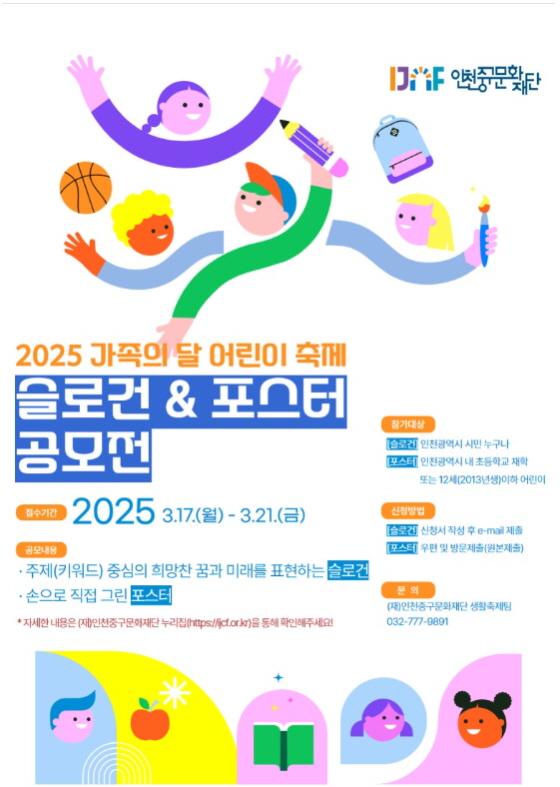 2025 가족의 달 어린이 축제 슬로건 및 포스터 공모전 공모분야 네이밍/슬로건, 웹툰/포스터/미술 접수기간2025.03.17 ~ 2025.03.21 D+381 종료 참가자격 지역한정 주최인천중구문화재단 1등상금(상품)기타 홈페이지 바로가기 첨부파일 다운로드 유의사항 ※본 내용은 참고 자료로 내용의 오류와 변동에 대해 책임지지 않습니다. (오류 및 변동 신고는 상단의 '제안/오류' 신고를 통해 해주십시오.) ※주최사 사정에 따라 일정 및 내용이 변경될 수 있으니 주최사 홈페이지 등을 통해 관련 안내를 수시로 확인하시기 바랍니다. 상세내용 ■ 제목2025 가족의 달 어린이 축제 슬로건 및 포스터 공모전 ■ 기간 - 접수기간 : 2025. 3. 17.(월) ~ 2025. 3. 21.(금) 18:00까지 - 수상자 발표 : 2025. 3. 28.(화) / (예정) - 시상식 및 전시회 : 2025. 5. 3.(토) (예정)/ 축제 행사장 현장 ■ 참가자격 - 슬로건 : 인천광역시 시민 누구나(거주지 기준) - 포스터 : 인천광역시 내 초등학교 재학 또는 12세 이하 어린이 ■ 참여방법 / 접수방법<슬로건>접수방법 : E-mail 접수(방문제출 불가) 신청서 서식 다운로드 - (재)인천중구문화재단 홈페이지(참여알림▶공지사항) - 제출서식 : 【서식1】, 【서식3】 담당자 이메일 : yts@ijcf.or.kr (마감당일 18:00 도착분(限) <포스터>접수방법 : 우편 및 방문 제출(원본 제출) 우편접수 : (우22314) 인천광역시 중구 신포로27번길 83-1. 3층 생활축제팀 앞 ※ 마감일 소인분까지 인정 및 착불 발송 시 반송 제출서식 : 포스터 원본, 【서식2】, 【서식3】 방문접수(지역 택1) - [원도심] (재)인천중구문화재단 3층 생활축제팀 - [영종권] 영종역사관 1층 안내데스크 ■ 시상내용 / 혜택 분 야구 분시상 수부상 및 혜택슬로건(14)*상장 없음최우수상1점문화상품권(10만원)우수상3점문화상품권(5만원)장려상10점문화상품권(1만원)포스터(24)대 상1점상장 및 문화상품권(20만원)※본 축제 메인 홍보물 사용최우수상3점상장 및 문화상품권(10만원)우 수 상5점상장 및 문화상품권(5만원)장 려 상15점상장 및 문화상품권(3만원) ■ 유의사항1. 출품 수는 개인당 1점으로 제한2. 지정 형식 또는 규격을 준수하지 않을 경우 심사에서 제외3. 내⋅외부 상황에 따라 시상을 축소하거나 시상하지 않을 수 있음4. 공모전의 응모작에 대한 저작권은 응모자에게 귀속됨5. 응모작품은 축제 종료일 기점 3개월 이내에 재단 사무실을 직접 방문하여 반환받으실 수 있으며, 이후 모두 폐기조치 됨 (※ 반환과 관련된 비용이 발생하는 경우 응모자가 부담) <저작권확인>1. 응모작은 순수 창작물이어야 하며, 시상 이후에라도 표절 등 본인이 창⋅제작한 것이 아닌 것으로 밝혀질 경우 당선을 취소하고 부상품 전액 환수 (※ 저작자 표시 작성)2. 응모작이 타 공모전의 수상작품일 경우에도 당선을 취소하고 상금 전액 환수 3. 응모작품에 대한 저작권 등 분쟁에 따른 모든 문제에 대하여는 응모자가 책임을 부담 <이용허락>1. 응모작품은 이용허락 동의서에 근거하여 축제 당일 현장 야외전시 활용 예정 (※ 이용허락 동의서 작성 필수)2. 수상작품은 이용허락 동의서에 근거하여 2차저작물작성 및 제3자제공을 진행 예정 (※ 이용허락 동의서 작성 필수) ■ 문의재단법인 인천중구문화재단 생활축제팀(070-4123-8945) 목록