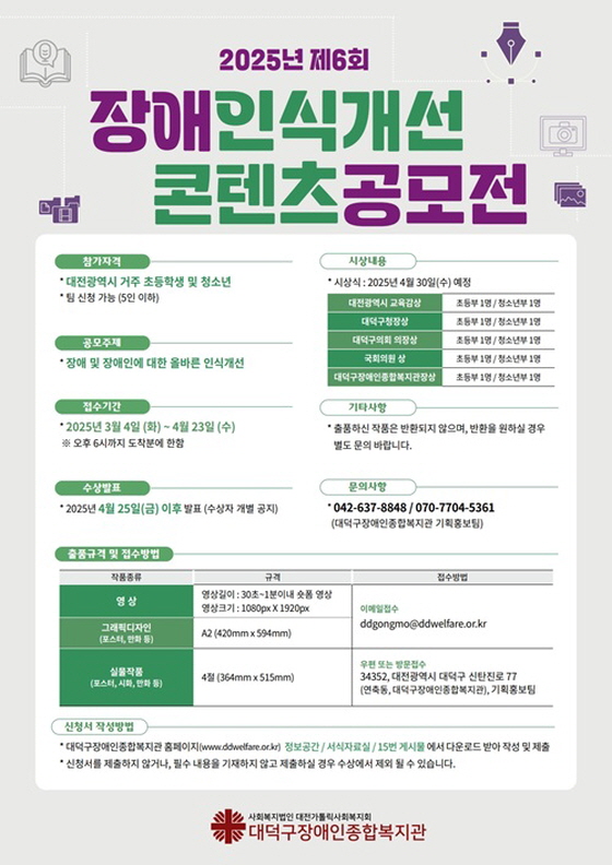 2025년 제6회 장애인식개선 콘텐츠 공모전 공모분야 사진/영상, 웹툰/포스터/미술, 디자인/캐릭터 접수기간2025.03.04 ~ 2025.04.23 D+348 종료 참가자격 지역한정 주최대덕구장애인종합복지관 1등상금(상품)기타 홈페이지 바로가기 첨부파일 다운로드 유의사항 ※본 내용은 참고 자료로 내용의 오류와 변동에 대해 책임지지 않습니다. (오류 및 변동 신고는 상단의 '제안/오류' 신고를 통해 해주십시오.) ※주최사 사정에 따라 일정 및 내용이 변경될 수 있으니 주최사 홈페이지 등을 통해 관련 안내를 수시로 확인하시기 바랍니다. 상세내용 ■ 제목2025년 제6회 장애인식개선 콘텐츠 공모전 ■ 기간 - 접수기간 : 2025년 3월 4일(화) ~ 4월 23일(수) - 오후 6시까지 도착분에 한함 - 결과발표 : 2025년 4월 25일(금) 이후 발표 - 수상자 개별공지 ■ 참가자격대전광역시 거주 또는 대전광역시 내 초등학생 및 청소년(팀 신청 가능 : 5인 이하) ■ 참여방법 / 접수방법<공모 주제> 장애 및 장애인에 대한 올바른 인식개선 <신청서 작성 방법> - 대덕구장애인종합복지관 홈페이지의 “정보공간 -> 서식자료실 -> 15번 게시물” 에서 다운로드 받아 작성 및 제출 - 신청서를 제출하지 않거나, 필수 내용을 기재하지 않고 제출하실 경우 수상에서 제외될 수 있습니다. <출품 규격 및 접수 방법>1. 영상 - 30초 ~ 1분 이내 숏폼 영상 - 1080 x 1920px - 이메일 접수 : ddgongmo@ddwelfare.or.kr 2. 그래픽 디자인 - A2 (420mm x 594mm) - 이메일 접수 : ddgongmo@ddwelfare.or.kr 3. 실물작품(포스터,시화,만화 등) - 4절 (364mm x 515mm) - 우편 또는 방문 접수 : 대전 대덕구 신탄진로 77 (연축동, 대덕구장애인종합복지관), 기획홍보팀 ■ 시상내용 / 혜택 - 대전광역시 교육감상 : 초등부 1명, 청소년 1명 - 대덕구청장상 : 초등부 1명, 청소년 1명 - 대덕구의회 의장상 : 초등부 1명, 청소년 1명 - 국회의원 상 : 초등부 1명, 청소년 1명 - 대덕구장애인종합복지관장상 : 초등부 1명, 청소년 1명 ■ 유의사항 - 출품하신 작품은 반환되지 않으며, 반환을 원하실 경우 별도 문의 바랍니다. ■ 문의 대덕구장애인종합복지관 기획홍보팀 (대표 : 042-637-8848 / 직통 : 070-7704-5361) 목록