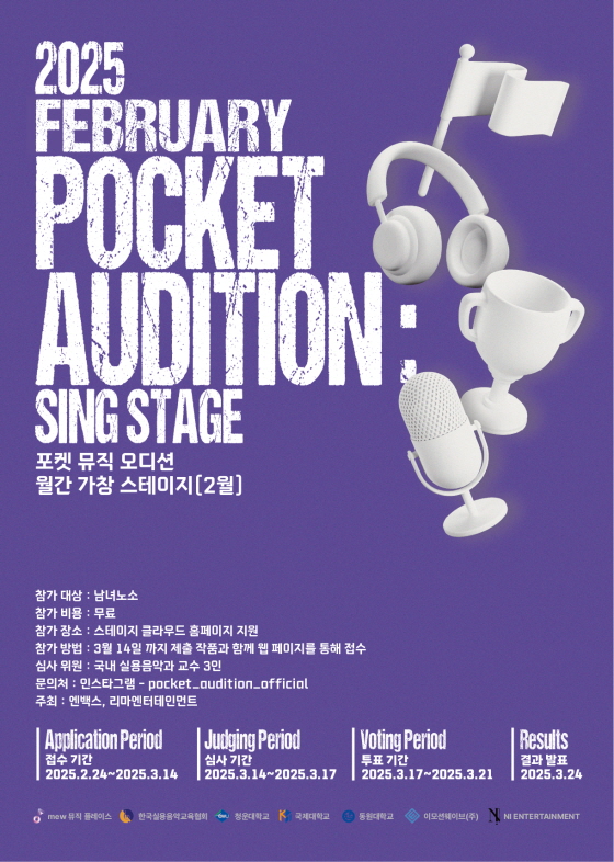 2025 포켓 뮤직 오디션 월간 가창 스테이지 2월 공모분야 로고송/음악 접수기간2025.02.24 ~ 2025.03.14 D+388 종료 참가자격 제한없음 주최(주)엔백스, (주)리마엔터테인먼트 1등상금(상품)기타 홈페이지 바로가기 첨부파일 다운로드 유의사항 ※본 내용은 참고 자료로 내용의 오류와 변동에 대해 책임지지 않습니다. (오류 및 변동 신고는 상단의 '제안/오류' 신고를 통해 해주십시오.) ※주최사 사정에 따라 일정 및 내용이 변경될 수 있으니 주최사 홈페이지 등을 통해 관련 안내를 수시로 확인하시기 바랍니다. 상세내용 ■ 제목2025 포켓 뮤직 오디션 월간 가창 스테이지 2월 ■ 기간 - 접수 기간 : 02.24.~03.14. - 투표 기간 : 03.17.~03.21. - 결과 발표 : 03.24. ■ 참가자격 음악을 좋아하는 누구나 ■ 참여방법 / 접수방법<공모 주제> - 스테이지 클라우드 홈페이지를 통해 지원 신청 - 내가 좋아하는 노래를 부르고 첨부 파일로 업로드 - 자작곡 / 기성곡 / 라이브연주/음원 관계 없이 자유롭게 신청 가능 <접수 방법> - 스테이지 클라우드 홈페이지를 통한 지원 신청서 제출 - https://stagecloud.muta.live/audition - 음질이 깨끗한 음원 첨부(mp3, wav) ■ 시상내용 / 혜택 - 2025년 06월(예정) 포켓 오디션 상반기 정규 EP 앨범 발매 지원 ■ 문의 인스타그램 : pocket_audition_official 채널 DM 목록