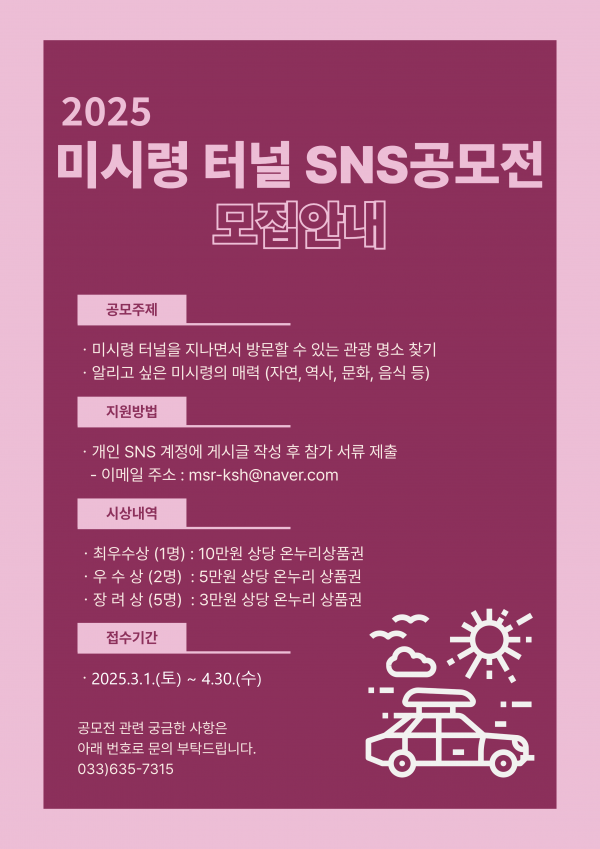 미시령터널 SNS 공모전 공모분야 문학/시나리오 접수기간2025.03.01 ~ 2025.04.30 D+342 종료 참가자격 제한없음 주최미시령동서관통도로(주) 1등상금(상품)기타 홈페이지 바로가기 첨부파일 다운로드 유의사항 ※본 내용은 참고 자료로 내용의 오류와 변동에 대해 책임지지 않습니다. (오류 및 변동 신고는 상단의 '제안/오류' 신고를 통해 해주십시오.) ※주최사 사정에 따라 일정 및 내용이 변경될 수 있으니 주최사 홈페이지 등을 통해 관련 안내를 수시로 확인하시기 바랍니다. 상세내용 ■ 제목미시령터널 SNS 공모전 ■ 개요미시령 터널에 인접한 지역의 역사ㆍ문화ㆍ관광명소 등 다양한 주제들을 대상으로 「2025 미시령 터널 SNS 공모전」을 개최하오니 많은 관심과 적극적인 참여 바랍니다. ■ 기간 - 접수기간 : 2025. 3. 1. ~ 4. 30. - 수상발표 : 2025. 5월 초(개별 통보, 미시령동서관통도로(주) 홈페이지 게시) ■ 참가자격전 국민 누구나 ■ 참여방법 / 접수방법4. 공모내용○ 공모주제 : 미시령 터널을 지나면서 방문할 수 있는 관광명소 찾기 - 알리고 싶은 미시령의 매력(자연, 역사, 문화, 음식, 등)○ 공모분야 : 4개 SNS 매체(유튜브, 페이스북, 인스타그램, 블로그)○ 출품 수 : 1인당 총 5편 응모 가능(2편 이상 제출 시 각 편 별도 평가) 5. 응모방법 : 이메일 접수(msr-ksh@naver.com) 6. 제출서류○ 붙임1. 참가신청서 1부○ 붙임2. 개인정보 수집 및 이용에 관한 동의서 1부 ※ 미시령동서관통도로(주) 홈페이지에서 서식 다운로드 후 작성 제출 ※ 이메일 제목은 [2025 미시령 터널 SNS 공모전_본인 이름]으로 표기 ※ 다수 작품 신청 시 각각의 참가신청서 작성 7. 응모안내○ 응모작은 “전체 공개, 댓글·공감 허용, 검색 허용” 할 수 있도록 공개 설정○ 본인이 순수 창작한 작품을 개인 SNS 계정에 게시. ○ 업로드 시 필수 해시태그 #미시령 터널 SNS 공모전, #미시령 터널, #울산바위 작성 ○ 콘텐츠 출품규정 (공고 시작일 이후 제작한 콘텐츠만 가능) 분 야공모형식 및 규격비 고동영상(유튜브)- 장르 자유(다큐, 드라마, 취재, 애니메이션등)- 영상장비 제한 없음- wmv, avi, mp4등 동영상 파일 형식- 해상도 30p(1920*1080픽셀)이상본인 계정에응모작 게시블로그(페이스북,인스타그램,블로그)- 본인 SNS 계정에 본인이 직접 취재·체험한 내용 (본인 SNS 계정에 게시한 순수창작물에 한함)- 블로그 사진은 5장 이상 포함 작성- 원본 권장 해상도 3840×2560픽셀 이상, 1MB 이상- 포스팅 제목 앞에 <미시령 터널 SNS 공모전> 기재 ※ 최종 수상작만 원본 전체 사진 제출샘플 이미지파일 1매 제출(권장해상도 확인용) ※ 출품 규격에 맞지 않는 출품작은 탈락 또는 감점 처리 ■ 시상내용 / 혜택 - 최우수상(1명) : 10만원 상당 온누리상품권 지급 - 우 수 상(2명) : 5만원 상당 온누리상품권 지급 - 장 려 상(5명) : 3만원 상당 온누리상품권 지급 ■ 유의사항 ○ 제출된 서류 및 작품은 일체 반환하지 않으며 제출서류 미비, 접수 기간(시간) 이외 제출, 출품작 규격 미준수 시 심사에서 제외 ○ 모든 응모작은 2025.3.1.(접수 시작일)부터 2025.4.30.(접수 마감일)까지 제작한 본인의 순수창작물이어야 함. ○ 작품의 전체 또는 일부가 이미 유포된 것을 포스팅하거나 공모 취지에 적합하지 않은 광고성, 상업성 글은 심사 대상에서 제외됨 ○ 모든 응모작은 제3자의 지적재산권(음원, 영상, 사진, 이미지, 캐릭터, 폰트 등), 초상권 및 타인의 명예훼손, 사실과 무관한 컴퓨터그래픽 이미지 합성, 타인의 저작물 및 명의 도용 등 일체의 법적 문제가 없어야 하며, 이와 관련하여 모든 법적 책임은 참가자 본인이 부담하여야 함. ※ 항공촬영의 경우 관련 법규 준수작품에 한하며(미준수로 인해 발생되는 모든 책임은 출품자에게 있음), 관련 증빙서류 제출이 필요한 작품의 경우 반드시 증빙자료 첨부 ○음원 사용 시 저작권에 문제없는 음원을 사용해야 하며, 영상물의 끝에는 반드시 음원제목과 출처를 명시해야 함(한국음악저작권협회 문의 : www.komca.or.kr) ○ 선정된 작품은 본인 계정에서 삭제 또는 비공개로 할 수 없음 ○ 응모작과 관련한 분쟁이 발생 할 경우 일체의 법적 책임은 응모자에게 있음 ○ 심사점수는 비공개로 하며, 심사 결과에 대해 어떠한 이의도 제기할 수 없음 ○ 최종 수상작은 사용된 이미지는 원본 파일을 제출하며, 영상일 경우 무자막본을 제출 ○ 반사회적, 폭력성, 선정성이 내포된 작품은 출품 불가 및 수상 제외 ○ 서류 제출 후 유선 확인 필수 ○ 수상작에 대한 저작권은 미시령동서관통도로(주)와 공동으로 소유하며, 미시령터널의 홍보자료로 활용될 수 있음(필요에 따라 수정 또는 변형하여 사용가능하며, 상금 외 별도의 이용료를 지급하지는 않음) ■ 문의미시령동서관통도로(주) (전화 : 033-635-7315) 목록