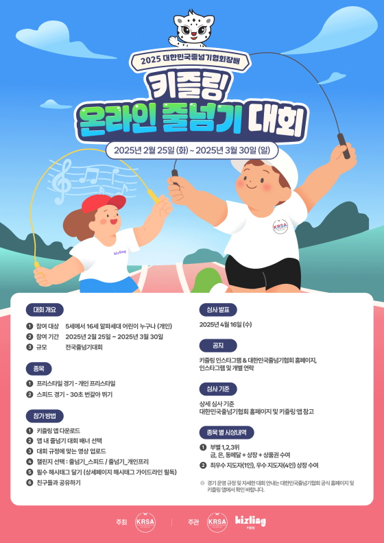2025 대한민국줄넘기협회장배 키즐링 온라인 줄넘기대회 접수기간2025.02.25 ~ 2025.03.30 D+373 종료 참가자격 청소년, 기타 제한 주최대한민국줄넘기협회 1등상금(상품)기타 홈페이지 바로가기 첨부파일 다운로드 유의사항 ※본 내용은 참고 자료로 내용의 오류와 변동에 대해 책임지지 않습니다. (오류 및 변동 신고는 상단의 '제안/오류' 신고를 통해 해주십시오.) ※주최사 사정에 따라 일정 및 내용이 변경될 수 있으니 주최사 홈페이지 등을 통해 관련 안내를 수시로 확인하시기 바랍니다. 상세내용 ■ 제목2025 대한민국줄넘기협회장배 키즐링 온라인 줄넘기대회 ■ 기간접수기간: 2025. 2. 25. (화) 09:00 ~ 3.30. (일) 까지 발표일: 2025. 4. 16. (수) ■ 참가자격5세 ~ 16세 알파세대 어린이 누구나(개인)(2018 ~ 2009년생까지) ■ 대회 방법<종목> ① 스피드 경기 - 30초 번갈아 뛰기 ② 프리스타일 경기 - 개인 프리스타일 <참가방법>키즐링 앱 다운로드앱 내 줄넘기 대회 배너 선택대회 규정에 맞는 영상 업로드챌린지 선택 : 줄넘기_스피드 / 줄넘기_개인프리필수 해시태그 달기 (상세페이지 해시태그 가이드라인 필독)친구들과 공유하기 ◯ 참가비 : 무료 ■ 참여 혜택 - 부별 1, 2, 3위 : 금, 은, 동메달 + 상장 + 상품권 수여 - 최우수지도자(1인), 우수지도자(4인) 상장수여 목록