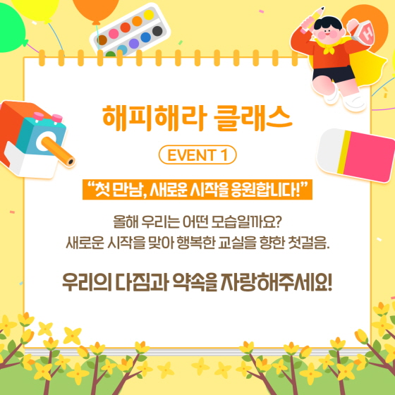 해피해라 클래스 캠페인 EVENT1 (행복한 교실 만들기 캠페인) 접수기간2025.03.04 ~ 2025.03.21 D+382 종료 참가자격 청소년, 기타 제한 주최대교문화재단 1등상금(상품)기타 홈페이지 바로가기 첨부파일 다운로드 유의사항 ※본 내용은 참고 자료로 내용의 오류와 변동에 대해 책임지지 않습니다. (오류 및 변동 신고는 상단의 '제안/오류' 신고를 통해 해주십시오.) ※주최사 사정에 따라 일정 및 내용이 변경될 수 있으니 주최사 홈페이지 등을 통해 관련 안내를 수시로 확인하시기 바랍니다. 상세내용 ■ 제목해피해라 클래스 캠페인 EVENT1 (행복한 교실 만들기 캠페인) ■ 개요첫 만남, 새로운 시작을 응원합니다올해, 우리는 어떤 모습으로 함께할까요?새로운 시작을 맞아 행복한 교실을 향한 첫걸음!우리의 다짐과 약속을 공유하고 자랑해 주세요! ■ 기간접수기간 : 25. 3. 4.(화) ~ 3. 21.(금) ■ 참가자격모든 선생님과 학생 ■ 참여방법 선생님과 학생들이 다짐과 약속 만들기 -> 대교문화재단 SNS(페이스북 or 인스타그램) 팔로우 -> 해시태그와 함께 다짐과 약속 SNS 게시글 업로드 -> 이벤트 게시물에 '참여 완료' 댓글 달기 ※ 필수 해시태그#해피해라클래스 #눈높이교육상 ※ TIP : 우리반의 모습을 함께 업로드 시 당첨확률 UP ■ 시상내용 / 혜택- 베스트 다짐상 : 편의점 상품권 5만원 (10팀)- 베스트 포토상 : 배달의 민족 5만원 (10팀) 목록
