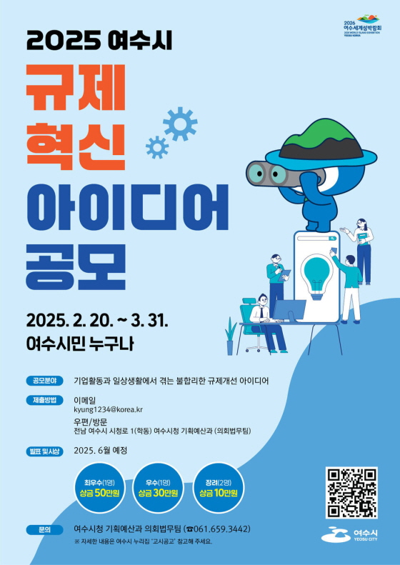 2025년 여수시 규제혁신 아이디어 공모 공모분야 기획/아이디어/마케팅, 정책 제안 접수기간2025.02.20 ~ 2025.03.31 D+372 종료 참가자격 지역한정 주최여수시 1등상금(상품)100만원 이하 홈페이지 바로가기 첨부파일 다운로드 유의사항 ※본 내용은 참고 자료로 내용의 오류와 변동에 대해 책임지지 않습니다. (오류 및 변동 신고는 상단의 '제안/오류' 신고를 통해 해주십시오.) ※주최사 사정에 따라 일정 및 내용이 변경될 수 있으니 주최사 홈페이지 등을 통해 관련 안내를 수시로 확인하시기 바랍니다. 상세내용 ■ 제목2025년 여수시 규제혁신 아이디어 공모 ■ 개요 시민생활과 생업현장에 숨어있는 불합리한 규제 및 기업활동을 저해하는 규제 등을 적극 발굴·개선하기 위하여 2025년 여수시 규제혁신 아이디어 공모전을 개최합니다. ■ 기간 - 접수 기간 : 2025. 2. 20. ~ 3. 31.(40일간) ■ 참가자격여수시민, 관내 기업인·소상공인 등 누구나 ■ 참여방법 / 접수방법◯ 공모분야 : 시민 생활불편, 기업의 경영활동 저해, 신산업 분야 등 규제 애로 ◯ 공모방법 : 제안서 제출(방문, 우편, 전자우편kyung1234@korea.kr) ■ 시상내용 / 혜택 - 최우수(1명) 50만원, 우수(1명) 30만원, 장려(2명) 각 10만원 ※ 시상금은 여수사랑상품권으로 지급 ■ 문의여수시청 기획예산과 의회법무팀 : 061-659-3442 목록