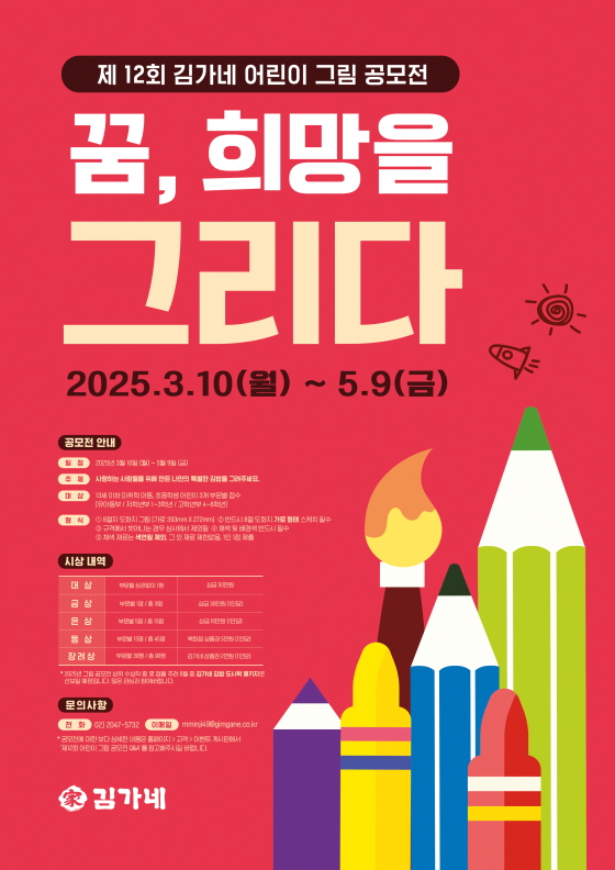 제12회 김가네 어린이 그림 공모전 공모분야 웹툰/포스터/미술 접수기간2025.03.10 ~ 2025.05.09 D+333 종료 참가자격 청소년, 기타 제한 주최(주)김가네 1등상금(상품)100만원 이하 홈페이지 바로가기 첨부파일 다운로드 유의사항 ※본 내용은 참고 자료로 내용의 오류와 변동에 대해 책임지지 않습니다. (오류 및 변동 신고는 상단의 '제안/오류' 신고를 통해 해주십시오.) ※주최사 사정에 따라 일정 및 내용이 변경될 수 있으니 주최사 홈페이지 등을 통해 관련 안내를 수시로 확인하시기 바랍니다. 상세내용 ■ 제목제12회 김가네 어린이 그림 공모전 ■ 기간 - 접수기간 : 2025년 3월 10일(월) ~ 5월 9일(금) (우편 마감일 소인 유효) - 결과 발표 : 2025년 5월 23일(금) 오후 6시 – 김가네 홈페이지 ■ 참가자격 13세 이하 미취학 아동에서 부터 초등학생 어린이로 3개 부문별로 접수 (유아동부/저학년부 1~3학년 / 고학년부 4~6학년) ■ 참여방법 / 접수방법<공모 주제> 사랑하는 사람들을 위해 나만의 특별한 김밥을 그려주세요. <제출 형식> - 8절 도화지 그림 (가로394mm*세로272mm) - 반드시 8절 도화지 가로 형태 스케치 필수 - 규격에서 벗어나는 경우 심사에서 제외됨. - 채색 및 배경색 반드시 필수 - 채색 자료는 색연필 제외, 그 외 재료 제한없음. - 1인 1점 제출 <접수 방법> - 우편 접수 (반드시 작품과 신청서 함께 동봉) ※ 신청서 출력이 어려운 경우 출품할 그림 뒷면에 정해진 양식을 수기로 작성하여 제출 (양식은 홈페이지 공고문 참조) - 접수처 : (우 : 05544) 서울시 송파구 위례성대로6 현대토픽스 3층 김가네 어린이 그림공모전 담당자 앞 ■ 시상내용 / 혜택 - 대상 1명 : 50만원 - 금상 부문별 1명 총 3명 : 30만원 - 은상 부문별 5명 총 15명 : 10만원 - 동상 부문별 15명 총 45명 : 백화점상품권 5만원 - 장려상 부문별 30명 총 90명 : 김가네 외식상품권 2만원권 ■ 유의사항 - 참가신청서(인적사항 필수) 누락 시 심사에서 제외됨. - 작품의 저작권, 소유권, 사용권은 김가네에 귀속됨. - 접수된 작품의 반환은 어려움, 3년 이후 반환 요청 간으 - 배송 중 발생된 훼손은 주최측에서 책임지지 않음. ■ 문의 - 전화 : 02)2047-5732 - 이메일 : mminji49@gimgane.co.kr 목록
