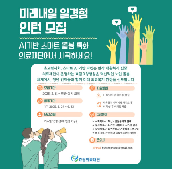 효림의료재단 미래내일 일경험 인턴 모집 접수기간2025.02.06 ~ 2025.03.23 D+380 종료 참가자격 대학(원)생/청년, 기타 제한 주최효림의료재단 1등상금(상품)기타 홈페이지 바로가기 첨부파일 다운로드 유의사항 ※본 내용은 참고 자료로 내용의 오류와 변동에 대해 책임지지 않습니다. (오류 및 변동 신고는 상단의 '제안/오류' 신고를 통해 해주십시오.) ※주최사 사정에 따라 일정 및 내용이 변경될 수 있으니 주최사 홈페이지 등을 통해 관련 안내를 수시로 확인하시기 바랍니다. 상세내용 ■ 제목효림의료재단 미래내일 일경험 인턴 모집 ■ 개요미래내일 일경험인턴 모집! AI기반 스마트 돌봄특화 의료재단에서 시작하세요!초고령 사회의 답은 '스마트 AI 기반 파킨슨 환자 재활복지'에 있습니다.일산효림요양병원은 '스마트 AI 기반 파킨슨 환자 재활복지' 집중 의료재단입니다.효림요양병원은 혁신적인 노인 돌봄 체계를 구축하며, 청년 인재들과 함께 미래 의료·복지 환경을 선도하고 있습니다.단순한 인턴이 아닙니다! 노인 돌봄의 미래를 만들어갈 혁신가를 찾습니다! ■ 기간 - 모집기간 : 2025. 2. 6. ~ 상시모집 ■ 참가자격 - 재학생 및 휴학생 가능관련 전공자 우대 (졸업 예정자 및 기졸업자) - 노인의료·복지 혁신에 관심 있는 청년 - 문제 발견과 해결에 도전 정신을 가진 분 - 새 기술과 돌봄방법에 대한 열려있는 분 ■ 활동내용<모집 분야> - 사회복지사 : 혁신적인 노인 돌봄 체계를 함께 설계할 인재 - 물리치료사 : AI 기반 재활치료 시스템을 익히고 성장할 인재 - 작업치료사 : 파킨슨 환자의 기능 회복을 돕는 전문가로 성장할 인재 - 보건의료정보관리사(의무기록사) : 미래형 의료정보 관리 시스템을 경험할 인재 ※ 노인의료·복지 분야에 관심 있는 20~30대 신입 청년을 대상으로 합니다. <근무 조건> - 근무지: 효림요양병원 (경기도 일산 서구 소재, 3호선 주엽역 4번출구에서 도보 1~2분 거리) - 근무 기간 : 3개월 (1기 : 3. 24. ~ 6. 13.) - 근무 시간 : 오후 12:30 ~ 6:00 (주 5일) - 급여 : 시급 14,000원 (정부지원사업_청년 미래내일 일경험 인턴 수당 지급) ■ 지원방법 구글폼 직접 접수 : https://forms.gle/3dTXtwAFJtffChit5 완료하시면 아래 비밀 댓글로 1기 000 신청 완료했습니다~ 라고 달아주세요~ ^^ (예시 : 1기 주세호 구글폼 신청 완료했습니다~) - 서류 검토 후 개별 연락하여 면접 진행 ■ 참여 혜택시급 14,000원 급여 외 - AI 기반 스마트 돌봄 시스템 실무 경험 - 노인의료·복지 혁신 프로젝트 직접 참여 - 멘토링 & 네트워킹 기회 제공 - 인턴십 종료 후 정규직 전환 가능 - 개별 연구 및 성장 프로젝트 진행 가능 ■ 문의 - 010-4130-0041 인턴십 관련 문자 또는 카톡으로 메세지 주시면 저희가 상담 전화를 드립니다! (전화는 자제부탁드립니다.) 목록