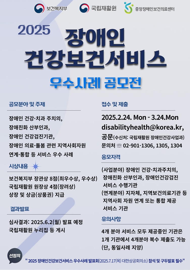 2025 장애인건강보건서비스 우수사례 공모전 공모분야 기타분야 접수기간2025.02.24 ~ 2025.03.24 D+380 종료 참가자격 제한없음 주최보건복지부 주관국립재활원 1등상금(상품)기타 홈페이지 바로가기 첨부파일 다운로드 유의사항 ※본 내용은 참고 자료로 내용의 오류와 변동에 대해 책임지지 않습니다. (오류 및 변동 신고는 상단의 '제안/오류' 신고를 통해 해주십시오.) ※주최사 사정에 따라 일정 및 내용이 변경될 수 있으니 주최사 홈페이지 등을 통해 관련 안내를 수시로 확인하시기 바랍니다. 상세내용 ■ 제목2025 장애인건강보건서비스 우수사례 공모전 ■ 기간 - 접수기간 : ′25.2.24(월)∼3.24(월) 17:00 - 수상 후보작 공개 : ′25.5.21(수) ~ ′25.5.30(금) 국립재활원 누리집 등 홈페이지 공개 - 결과발표 : ′25.6.2(월) 국립재활원 등 누리집 게시 및 개별통보 - 우수사례 발표회 및 시상식 개최 : ′25.7.17(목) (대한상공회의소 B2 중회의실 A) ■ 참가자격관련 분야 서비스 수행기관 - 사업분야 : 장애인 건강ž치과주치의, 장애친화 산부인과, 장애인 건강검진기관 - 연계분야 : 지자체, 지역보건의료기관 등 ■ 참여방법 / 접수방법<공모주제> 2025 장애인건강보건서비스 우수사례 공모전 – 장애인 건강 보건 향상을 위한 장애인 건강·치과 주치의 기관, 장애친화 산부인과, 장애인 건강검진기관 등 사업 서비스 제공 및 자원 연계 우수사례– 지역사회 특성에 맞춘 효과적인 서비스 기획 및 실행을 통한 장애인 의료·돌봄 관련 건강 증진 및 회복 사례 등 <접수방법>공문 또는 이메일 제출 - (공문 수신처) 국립재활원 장애인건강사업과 - (이메일) disabilityhealth@korea.kr ※ (사업수행기관) 각 사업 서비스 우수사례 응모 ※ (연계사례) 2개 이상의 기관이 공동으로 수행한 연계/통합사례의 경우 주관기관이 접수하고, 선정되는 경우 주관기관에 상장 및 상금 수여 ※ 장애인 건강·치과 주치의, 장애친화 산부인과, 장애인 건강검진기관 사업 서비스를 모두 수행하는 기관의 경우, 동일기관에서 4개 세부 분야 복수 제출 가능함. 단, 동일사례 지양 <제출서류> 홈페이지 공고문 첨부파일(제출양식) 붙임 1~2 필수 제출 - (필수) 우수사례 공모전 신청서 및 사례기술서 1부(붙임 1 참조, 개인정보 수입·이용 동의서 포함) ※ 한글 워드프로세서 파일(파일형식 .hwp 또는 .hwpx)제출. 글자 폰트는 함초롬 바탕 또는 함초롬 돋움, 13포인트, 줄 간격 160%. 그림 등이 추가 되는 경우 별도 파일 제출(파일형식 .jpg 또는 .png) - (필수) 윤리서약서 1부(붙임 2 참조) ■ 시상내용 / 혜택 - 최우수상 보건복지부 장관상 상장, 상금 50만원에 상당하는 상품권 지급 4점 - 우수상 보건복지부 장관상 상장, 상금 30만원에 상당하는 상품권 지급 4점 - 장려상 국립재활원 원장상 상장, 상금 20만원에 상당하는 상품권 지급 4점 ■ 유의사항 - (제출 및 수상 제한) 다음의 사항에 해당하는 경우는 제출 불가 및 심사에서 제외되며, 수상작 발표, 시상 이후에도 수상 취소 또는 상금이 환수될 수 있음 ⋅ 제출자가 직접 경험하지 않은 미경험사례는 제출 금지⋅ 표절 불법복제 무단 인용 등 타인의 지식재산권을 침해한 경우⋅ 제출유의사항 및 작성안내 등에 명시된 요건에 적합하지 않은 경우 - (제출서류 관련 안내) 제출서류상의 책임은 제출기관과 제출자에게 있으며, 서류미비·허위기재의 경우 심사에서 제외될 수 있음.⋅ 사무국에서 접수한 제출서류는 추가 보완, 수정이 불가함⋅ 수상작 발표 후 2개월 이내 개별요청시 반환가능하며, 이후에는 일괄 폐기됨 - (연계·통합사례) 2개 이상의 기관이 공동으로 수행한 연계/통합사례의 경우 주관기관이 접수하고, 선정되는 경우 주관기관에 상장 및 상금 수여 – (추가자료제출) 수상작에 한하여 우수사례 발표회를 위하여 추가 자료를 요청할 수 있으며, 주최·주관기관이 요청하는 날짜까지 제출하여야 함. * 수상작 발표대상자에 한하여 개별 연락 예정 - (권리안내) 제출한 자료에 대한 저작권 일체(저작인격권, 저작재산권)는 출품자·기관(제출자 등)에 있으며, 수상작에 한하여 주최·주관기관은 비영리 목적을 위한 비독점적 저작물 이용 허락*을 받을 수 있음. 출품작과 관련된 저작권, 명예훼손 등 분쟁 발생 시 모든 책임은 응모자에게 있음. * 저작물 이용 허락 범위: 사례집 발간, 보도자료 등 수상작 정보제공 웹서비스 등 기타 비영리 목적 사업홍보를 위한 제출자료의 일부 복제, 가공, 인쇄, 배포, 전시, 공중송신 등 ** 본 공모전에 입상 및 상금 수령에 동의할 경우, 주최·주관기관에서 자료 이용을 허락한 것으로 봄. 주최·주관기관은 비독점적, 비영리·공익적 목적으로 상기 이용 허락 범위 내에서 저작물을 이용할 수 있음 ■ 문의국립재활원 장애인건강사업과 02-901-1306, disabilityhealth@korea.kr ⋅ (장애인 주치의) 02-901-1305 ⋅ (장애친화 산부인과, 장애인 건강검진기관) 02-901-1304 목록