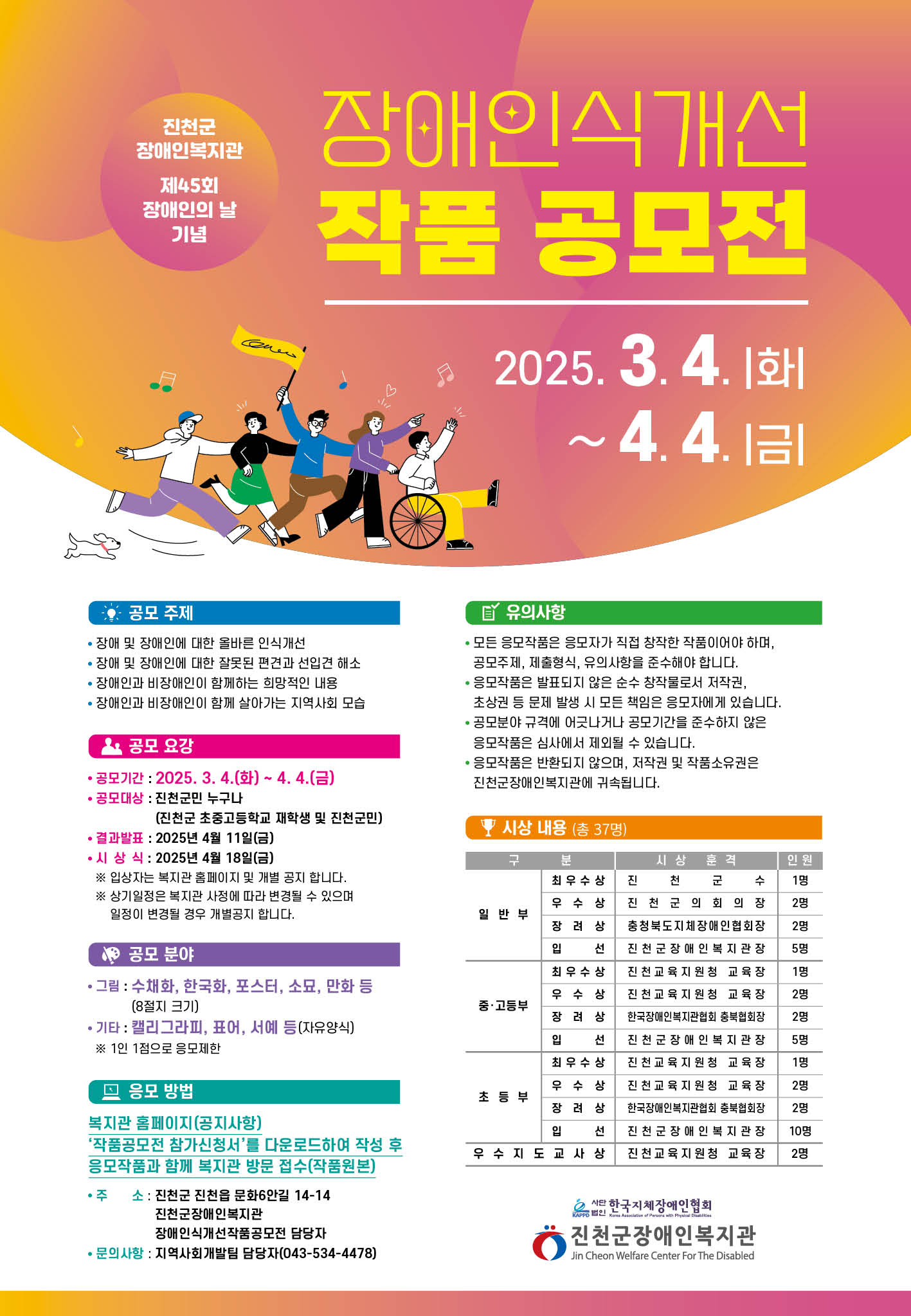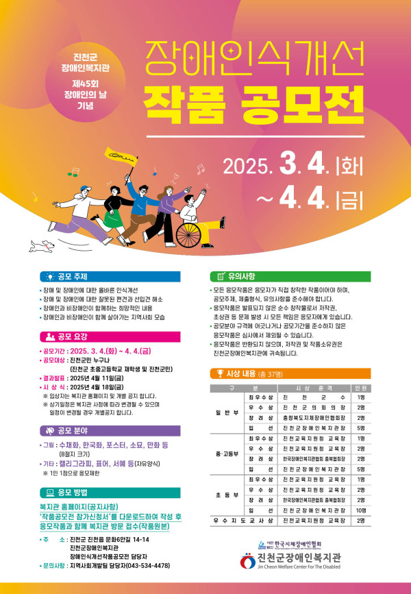 제45회 장애인의 날 기념 장애인식개선 작품공모전 공모분야 네이밍/슬로건, 웹툰/포스터/미술, 캘리그라피/서예 접수기간2025.03.04 ~ 2025.04.04 D+369 종료 참가자격 지역한정 주최진천군장애인복지관 1등상금(상품)기타 홈페이지 바로가기 첨부파일 다운로드 유의사항 ※본 내용은 참고 자료로 내용의 오류와 변동에 대해 책임지지 않습니다. (오류 및 변동 신고는 상단의 '제안/오류' 신고를 통해 해주십시오.) ※주최사 사정에 따라 일정 및 내용이 변경될 수 있으니 주최사 홈페이지 등을 통해 관련 안내를 수시로 확인하시기 바랍니다. 상세내용 ■ 제목제45회 장애인의 날 기념 장애인식개선 작품공모전 ■ 기간· 공모기간 : 2025년 3월 4일(화) ~ 4월 4일(금) 18:00 까지 · 결과발표 : 2025년 4월 11일(금)· 시상식 : 2025년 4월 18일(금) ※ 입상결과는 복지관 홈페이지 공지 및 입상자 개별 공지 됩니다 . ※ 상기일정은 복지관 사정에 따라 변경 될 수 있습니다. 일정이 변경 될 경우 개별공지 합니다 . ■ 참가자격· 공모대상 : 진천군민 누구나, 진천군 초·중·고등학교 재학생 ■ 참여방법 / 접수방법<공모주제> · 장애 및 장애인에 대한 올바른 인식개선· 장애 및 장애인에 대한 잘못된 편견과 선입견 해소· 장애인과 비장애인이 함께하는 희망적인 내용· 장애인과 비장애인이 함께 살아가는 지역사회 모습 <공모분야>· 그림 : 수채화, 한국화, 포스터, 소묘, 카툰 등 (8절지 크기)· 기타 : 캘리그라피, 표어, 서예 등 (자유양식)※ 1인 1점으로 응모제한 <응모방법>복지관 홈페이지 (공지사항) '작품공모전 참가신청서 '를 다운로드하여 작성 후 응모작품과 함께 복지관 방문접수 (원본)· 주 소 : 진천군 진천읍 문화 6 안길 14-14, 진천군장애인복지관· 홈페이지 : http:// www.jcwelfare.kr· 문 의 : 지역사회개발팀 담당자 (☎ 043-534-4478) ■ 시상내용 / 혜택 - 포스터 또는 공고문 참조 ■ 유의사항· 모든 응모작품은 응모자가 창작한 작품이어야 하며, 공모주제, 제출형식, 유의사항을 준수해야 합니다.· 응모작품은 발표되지 않은 순수 창작물로서 저작권, 초상권 등 문제 발생 시 모든 책임은 응모자에게 있습니다.· 공모분야 규격에 어긋나거나 공모기간을 준수하지 않은 응모작품은 심사엣 제외될 수 있습니다.· 응모작품은 반환되지 않으며, 저작권 및 작품소유권은 진천군장애인복지관에 귀속됩니다. 목록