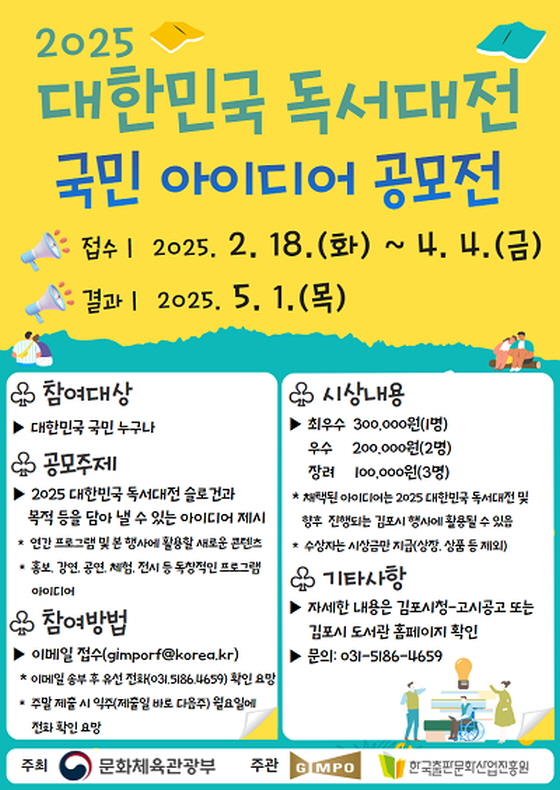 2025 대한민국 독서대전 국민 아이디어 공모전 공모분야 기획/아이디어/마케팅 접수기간2025.02.18 ~ 2025.04.04 D+369 종료 참가자격 제한없음 주최김포시 1등상금(상품)100만원 이하 홈페이지 바로가기 첨부파일 다운로드 유의사항 ※본 내용은 참고 자료로 내용의 오류와 변동에 대해 책임지지 않습니다. (오류 및 변동 신고는 상단의 '제안/오류' 신고를 통해 해주십시오.) ※주최사 사정에 따라 일정 및 내용이 변경될 수 있으니 주최사 홈페이지 등을 통해 관련 안내를 수시로 확인하시기 바랍니다. 상세내용 ■ 제목2025 대한민국 독서대전 국민 아이디어 공모전 ■ 기간 - 접수기간: 2025. 2. 18.(화) ~ 2025. 4. 4.(금) 18:00(시간 엄수) ※ 공모 마지막날 마감시간은 사업담당자 메일 수신시간 기준 ■ 참가자격 대한민국 독서대전에 관심있는 국민 누구나 ■ 참여방법 / 접수방법<공모주제> 2025 대한민국 독서대전 김포의 슬로건과 목적 등을 담아낼 수 있는 아이디어 제시 - 연간 프로그램 및 본 행사에서 활용할 새로운 콘텐츠 - 홍보 및 강연, 공연, 체험, 전시 등 독창적인 프로그램 아이디어 ▶ 슬로건: 책으로, 새로고침▶ 목 적: 책을 통해, 더 나은, 새로운 삶으로 나아갈 계기 마련▶ 주제 - 새로 알다: 책을 통해 새로운 세계를 배우고 깨닫다 - 새로 심다: 독서의 씨앗을 심고 습관으로 키우다 - 새로 잇다: 책을 통해 사람과 사람, 생태를 잇다 - 새로 펴다: 책 속의 이야기를 축제, 체험, 공연 등을 통해 현실로 펴다 <접수방법>이메일 접수‣ 이메일주소 : gimporf@korea.kr ※ 이메일 송부 후 유선(☎031-5186-4659) 전화 확인 요망 ※ 주말 제출 시 익주(제출일 바로 다음 주) 월요일에 전화 확인 요망‣ 이메일 제목에 ‘2025 대한민국 독서대전 국민 아이디어 공모’표기‣ 모든 서류에 반드시 이름을 정자로 자필 기재할 것 <제출서류> 제안서, 개인정보 수집‧이용 및 제공 동의서, 서약서 각 1부 ■ 시상내용 / 혜택 구 분인 원시상금비 고최우수1명30만원수상자는시상금만 지급(상장, 상품 등 제외)우 수2명각 20만원장 려3명각 10만원합 계6명100만원• 동일인의 제안이 다수 선정된 경우 최상위 등급 1건에 대하여만 시상• 등급에 해당하는 제안이 없을 경우 미선정할 수 있음 ■ 유의사항 - 선정된 아이디어는 2025 대한민국 독서대전 연간 프로그램 및 본 행사 (9. 19. ~ 9. 21.) 진행 시 활용될 수 있음 - 또한 선정된 아이디어는 지역독서대전 포함 향후 5년(2026~2030) 이내 아이디어 활용 및 프로그램 운영에 반영할 수 있음 - 아이디어의 저작권은 응모자에게 있으나 2025 대한민국 독서대전 행사 및 향후 5년 이내의 행사 진행 시 취지, 목적을 달성하기 위해 필요한 한도 내에서 변형‧보완하여 활용할 수 있음 - 제출서류는 일체 반환하지 않으며, 제출 후 변경 또는 수정할 수 없음 - 타 공모전에서 시상 또는 수상 경력한 사실이 있는 아이디어거나, 표절로 밝혀진 경우 수상 취소되며 시상내역을 환수함 - 제출 아이디어와 관련하여 저작권, 특허권, 표절, 도용, 모방 등으로 인해 발생하는 모든 민‧형사상 문제에 대한 책임은 본인(참가자)에게 있음 - 심사점수는 공개하지 않으며 심사위원 구성‧기준‧결과에 대해 이의를 제기할 수 없음 - 개인정보 기재 착오로 인해 수상자에게 연락이 불가할 경우 책임은 본인에게 있음 - 동일 내용이 접수된 경우 먼저 접수된 제안을 우선 심사함 - 동일인의 이름으로 2건 이내 제출 가능하며 수상은 상위 제안 1건만 가능함 - 공모 일정 및 심사내용, 시상내역 등은 변경될 수 있음 - 제안자는 공모전의 원활한 운영을 위해 인적사항을 제공하고 활용하는 것에 동의해야 함 ■ 문의김포시 교육문화국 도서관과 독서대전 T/F팀 (031-5186-4659) 목록