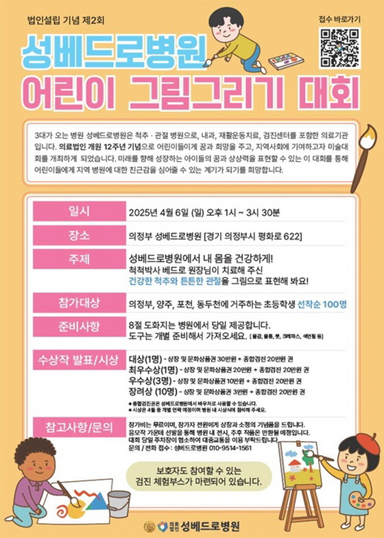 성베드로병원 어린이 그림그리기 대회 공모분야 웹툰/포스터/미술 접수기간2025.02.10 ~ 2025.03.14 D+390 종료 참가자격 청소년, 기타 제한 주최성베드로병원 1등상금(상품)기타 홈페이지 바로가기 첨부파일 다운로드 유의사항 ※본 내용은 참고 자료로 내용의 오류와 변동에 대해 책임지지 않습니다. (오류 및 변동 신고는 상단의 '제안/오류' 신고를 통해 해주십시오.) ※주최사 사정에 따라 일정 및 내용이 변경될 수 있으니 주최사 홈페이지 등을 통해 관련 안내를 수시로 확인하시기 바랍니다. 상세내용 ■ 제목성베드로병원 어린이 그림그리기 대회 ■ 기간 - 접수기간 : 3월 14일까지 선착순 접수 (조기 마감될 수 있습니다.) - 대회일자 : 2025년 4월 6일 (일) 오후 1시~3시 30분 ■ 참가자격 - 의정부, 양주, 포천, 동두천에 거주하는 초등학생 선착순 100명 ■ 참여방법 / 접수방법<대회 주제> 성베드로병원에서 내 몸을 건강하게! 척척박사 베드로 원장님이 치료해 주신 건강한 척추와 튼튼한 관절을 그림으로 표현해 봐요! <준비물> 8절 도화지는 병원에서 당일 제공하며, 회화도구(물감, 붓, 크레파스, 색연필 등)은 개별 준비해오시면 됩니다. <대회방법> - 대회일 4월 6일 성베드로병원으로 방문하여 대회 참가 - 오후 1시부터 3시 30분까지 그림을 그려 제출하면 됩니다. <사전접수 링크>https://docs.google.com/forms/d/e/1FAIpQLSeq1JRbnuanyyKdz8lsyXD4sAETjDHIC7ku5UN4xdlMGMcqUw/viewform ■ 시상내용 / 혜택 - 대상(1명) : 상장 및 문화상품권 30만원 + 종합검진 20만원권 - 최우수상(1명) : 상장 및 문화상품권 20만원 + 종합검진 20만원권 - 우수상(3명) : 상장 및 문화상품권 10만원 + 종합검진 20만원권 - 장려상(10명) : 상장 및 문화상품권 3만원 + 종합검진 20만원권 * 종합검진권은 성베드로병원에서 바우처로 사용할 수 있습니다. * 시상은 4월 중 개별 연락 예정이며 병원 내 시상식에 참석해 주세요. ※ 참가자 전원에게 상장과 기념품을 제공합니다. ■ 유의사항 대회 당일 주차장이 협소할 수 있으니 대중교통 이용을 부탁드립니다. ■ 문의 의료법인성베드로병원 010-9514-1561 목록