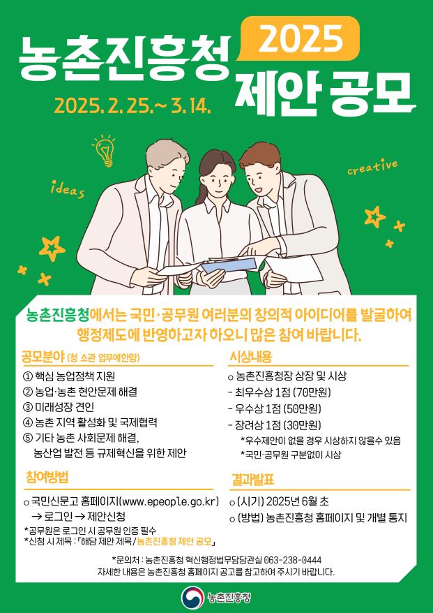 2025년 농촌진흥청 국민·공무원 제안 공모 공모분야 기획/아이디어/마케팅, 정책 제안 접수기간2025.02.25 ~ 2025.03.14 D+390 종료 참가자격 제한없음 주최농촌진흥청 1등상금(상품)100만원 이하 홈페이지 바로가기 첨부파일 다운로드 유의사항 ※본 내용은 참고 자료로 내용의 오류와 변동에 대해 책임지지 않습니다. (오류 및 변동 신고는 상단의 '제안/오류' 신고를 통해 해주십시오.) ※주최사 사정에 따라 일정 및 내용이 변경될 수 있으니 주최사 홈페이지 등을 통해 관련 안내를 수시로 확인하시기 바랍니다. 상세내용 ■ 제목2025년 농촌진흥청 국민·공무원 제안 공모 ■ 기간기간: 2025. 2. 25.(화) ~ 3. 14.(금) ■ 참가자격 대한민국 국민·공무원 누구나 ■ 참여방법 / 접수방법○ 분야: 핵심 농업정책 지원 등 5개 분야(농촌진흥청 소관 업무에 한함) ① 핵심 농업정책 지원 * 디지털육종·스마트농업 기술혁신, 기후변화·탄소감축 대응, 식량안보 및 친환경·안전 강화 등② 농업·농촌 현안문제 해결 * 밭농업기계화 촉진, 농산물 수급안정·생산비 절감 지원, 병해충 대응 서비스 등③ 미래성장 견인 * 첨단·정밀농업 확산, 그린바이오 혁신기술 개발, 푸드테크 성장 지원 등④ 농촌 지역 활성화 및 국제협력 * 농업·농촌 활력 제고 방안, 농업인 안전재해 예방, 국제기술협력 및 농식품 수출 지원 등⑤ 기타 농촌 사회문제 해결, 농산업 발전 등 규제혁신을 위한 제안 * 농업인 부담 완화 및 국민불편 해소를 위한 영농현장 규제개선, 품목별 영농현장 기술지원 애로사항, 농작업 안전 향상 및 재해예방, 농촌복지 향상 및 치유농업 육성 등 ○ 방법: 국민신문고 홈페이지를 통한 온라인 접수 - 국 민 : 국민신문고(www.epeople.go.kr) 접속 → 로그인→ 일반제안신청 - 공무원 : 국민신문고(www.epeople.go.kr) 접속 → 로그인(공무원 인증) → 공무원제안 신청 * 신청 시 제목:「해당 제안 제목 / 농촌진흥청 제안 공모」 ■ 시상내용 / 혜택 최우수 1점(70만원), 우수 1점(50만원), 장려 1점(30만원) ※ 행정안전부 중앙우수제안 추천 및 행정제도 등 반영 ■ 유의사항▶국내 사례 복사(표절 등) 제출 시 심사에서 제외▶제안서 양식(붙임)에 따라 작성하되, 현황 및 문제점·개선방안·기대효과 등을 구체적으로 작성▶제출된 제안서 및 관련 서류는 선정 여부에 관계없이 일체 반환하지 않으며, 선정 제안에 대한 모든 권리는 농촌진흥청에 귀속됨▶동일(유사) 내용 제안이 중복 접수 시 먼저 접수된 제안을 우선 심사 선정▶제안 내용의 표절 등 기타 부정한 방법으로 발생한 일체의 책임은 제출자에게 있으며, 시상 이후 발견 시 입상 취소 및 시상금 환수 조치▶동일인이 다수 접수 가능하나, 동일인의 제안이 다수 선정된 경우 최상위 등급 1건에 대해서만 시상금 및 상장 지급▶공동제안의 경우 주제안자와 부제안자의 역할에 따른 기여도에 따라 시상금 지급▶향후 활용 과정에서 주최 측에 의하여 내용이 보완·수정될 수 있음▶접수된 제안 중 우수 제안이 없을 경우 시상을 하지 않을 수 있음▶공모전으로 제출된 제안은 행정제도 등에 반영되지 않을 수 있음▶제안자의 성명, 전화번호 등 개인정보를 제대로 기재하지 않아 입상 사실 등을 알릴 수 없는 경우 시상하지 않을 수 있음▶접수 제안은 온라인 투표 및 사전공시(대국민 공개검증) 등을 위해 외부에 공개될 수 있음▶접수 마감 이후에는 추가 접수 및 수정이 불가함▶기타 명시되지 않은 사항에 대해서는「국민 제안 규정」및「공무원 제안 규정」,「행정기관의 공모전 운영에 관한 규정」에 따라 처리함▶본 공모전에 제안을 제출한 자는 위의 모든 내용에 동의한 것으로 간주함 ■ 문의농촌진흥청 혁신행정법무담당관실 (063-238-0444) 목록