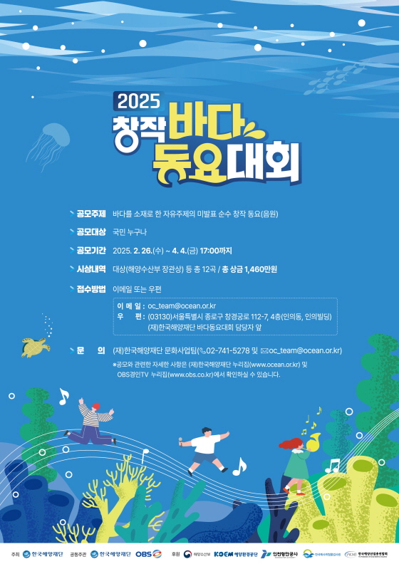 2025년 창작 바다동요대회 공모분야 로고송/음악 접수기간2025.02.26 ~ 2025.04.04 D+370 종료 참가자격 제한없음 주최(재)한국해양재단 주관(재)한국해양재단, ㈜OBS경인TV 후원/협찬해양수산부, 해양환경공단, 인천항만공사, 한국해사위험물 검사원, 한국해양산업총연합회 1등상금(상품)200만원~499만원 홈페이지 바로가기 첨부파일 다운로드 유의사항 ※본 내용은 참고 자료로 내용의 오류와 변동에 대해 책임지지 않습니다. (오류 및 변동 신고는 상단의 '제안/오류' 신고를 통해 해주십시오.) ※주최사 사정에 따라 일정 및 내용이 변경될 수 있으니 주최사 홈페이지 등을 통해 관련 안내를 수시로 확인하시기 바랍니다. 상세내용 ■ 제목2025년 창작 바다동요대회 ■ 기간 - 접수기간 : 2025. 2. 26.(수) ~ 4. 4.(금) 17:00까지 - 본선 진출 예정작 발표 : 4월 22일 17시 이후 예정 / 누리집 공고 및 개별 안내 - 본선(무대 심사) : 5월 17일 토요일 / OBS경인TV 스튜디오 예정 ■ 참가자격국민 누구나 * 본선(무대심사) 시 가창자(팀)는 초등학교 학령기 이하 어린이로 제한 ■ 참여방법 / 접수방법<공모주제> 바다를 소재로 한 자유주제의 미발표 창작동요(음원) <출품수> 작곡자 1인(팀)당 2곡 이내 * 가창형태(독창 및 중창) 구분 상관없이 총 2곡 이내로 제한 <응모방법>이메일 또는 우편 - 이메일 : oc_team@ocean.or.kr - 우편 : (03130) 서울특별시 종로구 창경궁로 112-7, 4층 (재)한국해양재단 바다동요대회 담당자 앞 * 우편 접수 시 참가 신청서 및 악보는 인쇄하여 제출해야 하며, 음원은 저장장치(USB 등)에 저장하여 제출 ** 출품을 위해 응모된 서류 및 저장장치(USB 등)는 반환하지 않음 <제출서류>1. 참가신청서 - 참가신청서 1부(참가신청서는 1곡당 1부씩 제출) * (재)한국해양재단 누리집 또는 OBS경인TV 누리집에서 다운로드하여 작성 ** 참가신청서 내 가창 형태(독창 또는 중창) 기재 필수 2. 악보 - 제목, 가사 및 피아노 반주가 포함된 PDF 형식의 파일 1부 * 악보에 작사자 및 작곡자 표기 금지 ** 피아노 반주가 포함된 악보에는 빠르기, 키, 코드 기재 필수 3. 음원 - 320kbps 음질 이상의 AR 음원 파일(wave 또는 mp3 형식) 1개 * 가창 반드시 포함하여 음원 제출(미디 반주 가능) ※ 제출서류 및 첨부파일(악보 및 AR 파일 등) 누락 시 무효 접수로 처리 ※ 본선 진출 시, 초등학교 학령기 이하 어린이로만 구성된 가창자(팀) 명단, 본선 경연용 MR 파일(미디 반주 가능) 및 최종 AR 파일 제출 필수 ■ 시상내용 / 혜택 - 대상 1곡 : 해양부장관상 및 트로피, 상금 400만원 - 금상 1곡 : 상장 및 상금 300만원 - 은상 2곡 : 상장 및 상금 각 150만원 - 동상 3곡 : 상장 및 상금 각 70만원 - 장려상 5곡 : 상장 및 상금 50만원 * 상금은 일부 세금을 제한 후 지급 ** 시상규모 및 상격은 응모작품의 수준 등에 따라 변경될 수 있음 ■ 유의사항<접수 및 가창 관련 등> ■ 이메일 응모 시 메일제목 및 파일명 작성요령 - 메일제목 : 2025년 바다동요대회_노래제목_작곡자 <예) 2025년 바다동요대회_바다_이해양> - 파일명 : 노래제목_작곡자_제출서류 <예) 바다_이해양_악보> * 공모요강에 기재된 이메일(oc_team@ocean.or.kr) 외의 다른 이메일 접수는 무효접수로 처리 ■ 작곡자 및 작사자 연락처에는 본인의 연락처와 연락 가능한 비상연락처를 필수로 기재 * 연락처는 응모 및 본선 진출 안내 등 중요한 공지를 연락하기 위함. 또한, 본선 진출 후에는 작곡자의 연락처와 이메일 주소로 연락 예정 ■ 접수 시, 가창 형태는 독창 또는 중창 형태로만 기재 * 본선 진출 이후 가창 형태(독창 또는 중창) 변경 불가 ** 가창자 명단은 향후 본선 진출 시, 주최 측에 최종 가창자 명단 필수 제출 ■ 예선 가창은 아동, 성인 등 제한 없으나 본선(무대심사)에서는 초등학교 학령기 이하 어린이로만 구성 필수(중창의 경우 최대 10명까지로 제한) ■ 본선(무대심사)에서 1명(팀)의 가창자는 1곡만 부를 수 있음 * 다른 곡에 중복 참가 불가 ■ 본선 진출곡 악보는 인쇄 또는 배포용으로 사용되므로 정확하게 검수된 악보파일 제출 <저작권 관련 사항 등> ■ 기성 문학작품을 가사로 사용하는 경우에는 원작자의 작품사용 승인을 얻어야 하며, 응모할 때 반드시 참가신청서의 서류들과 함께 사용승낙서류를 필수 제출 * 별도의 정해진 사용승낙서류 양식은 없으나, 작품사용을 승인한다는 내용 기재 ■ 응모작은 이전에 방송, 인터넷 매체, 책, 신문 등에 발표된 적이 없고, 다른 동요제에 발표한 적도 없는 본인의 순수창작곡(편곡음악 응모 불가)으로 제출 * 저작권 등록이 되어 있지 않아야 하며, 저작권신탁관리단체 등에 신탁되지 않은 작품이어야 함 ** AI 활용 관련 프로그램 등으로 제작된 곡은 접수 불가 *** 표절 또는 무단 인용 시 참가 자격 박탈 및 법적책임을 져야하며, 수상 이후에라도 위반 사항이 발견될 경우 수상 취소 및 부상 환수 조치 ■ 응모된 작품에 대한 저작권은 응모자에게 있으며, 저작권 등 문제(제3자 저작권 침해 등) 발생 시 수상이 취소될 수 있고, 모든 책임은 응모자에게 있음 * 저작권 관련 등 문제 발생 시, 수상자는 상장과 상금을 반환하고 일체의 법적 책임 부담 ■ 본선 진출 예정작은 표절 제보 등 공개검