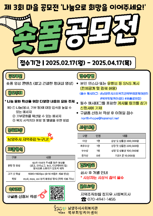 제 3회 마을 공모전 나눔으로 희망을 이어주세요 숏폼 공모전 공모분야 사진/영상 접수기간2025.02.17 ~ 2025.04.17 D+357 종료 참가자격 지역한정 주최남양주시사회복지관 북부희망케어센터 1등상금(상품)100만원 이하 홈페이지 바로가기 첨부파일 다운로드 유의사항 ※본 내용은 참고 자료로 내용의 오류와 변동에 대해 책임지지 않습니다. (오류 및 변동 신고는 상단의 '제안/오류' 신고를 통해 해주십시오.) ※주최사 사정에 따라 일정 및 내용이 변경될 수 있으니 주최사 홈페이지 등을 통해 관련 안내를 수시로 확인하시기 바랍니다. 상세내용 ■ 제목제 3회 마을 공모전 나눔으로 희망을 이어주세요 숏폼 공모전 ■ 기간 - 접수기간 : 2025.02.17(월) ~ 2025.04.17(목) ■ 참가자격남양주시 지역주민 누구나! ■ 참여방법 / 접수방법<공모 내용> 숏폼 영상 콘텐츠(짧고 간결한 형태의 영상) <공모 주제> 나눔 문화 확산을 위한 다양한 내용의 모든 주제예) - 나눔(봉사, 기부 등)에 대한 인식을 높일 수 있는 메세지 - 기부문화를 확산할 수 있는 메세지 - 복지 사각지대 예방 및 발굴을 위한 방법 등 <제출 형식> 분량 및 유형 : 60초 이내의 주제를 담은 영상물(광고, 브이로그, 뉴스, 다큐멘터리 등) 형식으로 스토리가 있도록 제작 - 크기 및 화질 : 1080*1920px (9:16 비율의 세로 영상) - 파일 : mp4, mov, avi 등의 동영상 형식 (자막 사용 가능) <지원 방법> - 제출형식 맞춰 영상 제작 후 -> 포스터 QR코드 접수 -> 구글폼 신청서 작성 후 이메일 접수 (north-hope@hanmail.net) - 필수 해시태그를 포함하여 본인 인스타 또는 유튜브 등 SNS 게시(전체공개 및 검색 허용) ■ 시상내용 / 혜택 - 대상 1명 : 상장 및 상품권 300,000원 - 최우수상 1명 : 상장 및 상품권 200,000원 - 우수상 1명 : 상장 및 상품권 100,000원 - 참가상 5명 : 기프티콘 10,000원 ■ 유의사항 - 수상 작품의 저작재산권 및 사용권은 남양주시사회복지관 북부희망케어센터에 귀속됩니다. 또한 수상작은 홍보 및 공적인 용도로 활용하기 위해 수정, 변경, 재가공될 수 있습니다. - 수상 작품의 법정분쟁(초상권 침해, 타인의 명예 훼손, 지적재산권, 저작권 침해 등)에 관한 문제가 발생할 경우 참여자 본인에게 민형사상의 법적 책임이 있습니다. - 타인의 저작물인 경우에는 심사 대상에서 제외되며 수상 후 위반 사실이 확인되었을 경우 수상 취소 및 시상내역이 환수될 수 있습니다. - 공고 내용은 주최 측의 사정에 의해 사전 공지 후 변경될 수 있습니다. ■ 문의남양주시사회복지관 북부희망케어센터 정지우 사회복지사 (070-4941-1455) 목록