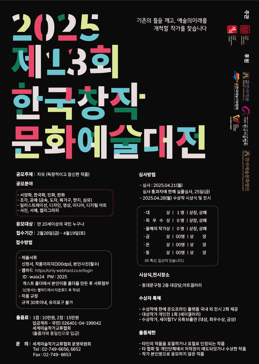 2025 제13회 한국창작 문화예술대전 공모분야 사진/영상, 웹툰/포스터/미술, 디자인/캐릭터, 캘리그라피/서예 접수기간2025.02.28 ~ 2025.04.21 D+353 종료 참가자격 제한없음 주최세계미술작가교류협회 1등상금(상품)기타 홈페이지 바로가기 첨부파일 다운로드 유의사항 ※본 내용은 참고 자료로 내용의 오류와 변동에 대해 책임지지 않습니다. (오류 및 변동 신고는 상단의 '제안/오류' 신고를 통해 해주십시오.) ※주최사 사정에 따라 일정 및 내용이 변경될 수 있으니 주최사 홈페이지 등을 통해 관련 안내를 수시로 확인하시기 바랍니다. 상세내용 ■ 제목2025 제13회 한국창작 문화예술대전 ■ 기간 - 접수기간 : 2025 2월28일(금) - 2025년 4월19일(토) ■ 참가자격 만 20세이상의 국민 누구나 ■ 참여방법 / 접수방법◯ 공모주제 : 자유(독창적이고 참신한 작품) ◯ 공모분야 : 서양화, 한국화, 민화, 판화, 조각, 공예,일러스트레이션, 디자인, 영상, 미디어, 디지털아트, 사진, 서예, 캘리그라피 <접수방법> - 제출서류 : 신청서, 작품이미지(300dpi), 본인사진(필수) - 웹하드 https://only.webhard.co.kr/login ID : waia24 PW : 2025 게스트 폴더에서 본인이름 폴더를 만든 후 서류첨부 (신청서는 웹하드에서 다운로드 후 작성) - 작품 규정 : 규격 30호이내, 유리표구 불가 <출품료> - 1점 : 10만원, 2점 : 15만원 - 입금계좌 : 국민) 026401-04-199042, 세계미술작가교류협회(출품자와 동일인으로 입금) <심사방법> - 심사 : 2025.04.21(월) / 심사 통과자에 한해 실물심사, 25일(금) - 2025.04.28(월) 수상작 시상식 및 전시 ■ 시상내용 / 혜택 · 대상 1 명 / 상장, 상패 · 최우수상 0 명 / 상장, 상패 · 올해의 작가상 0 명 / 상장, 상패 · 금상 00명 / 상장 · 은상 00명 / 상장 · 동상 00명 / 상장 · 특선 00명 / 상장 · 입선 00명 / 상장 ※ 시상식, 전시장소 : 동대문구청 2층 대강당,아트갤러리 ※ 수상자 특혜 - 수상작에 한에 온오프라인 플랫폼 국내 외 전시 2회 제공 - 대상작가 개인전 1회 (세미갤러리) - 수상작가, 세미협TV 유튜브출연 (대상, 최우수상, 금상) ■ 유의사항<출품제한>- 타인의 작품을 표절하거나 표절로 인정되는 작품- 타 협회 및 개인단체에서 저작권이 매도되었거나 수상한 작품- 작가 본인명으로 응모하지 않은 작품 ■ 문의세계미술작가교류협회 운영위원회Tel. 02-749-6656, 6652Fax. 02-749-6653 목록