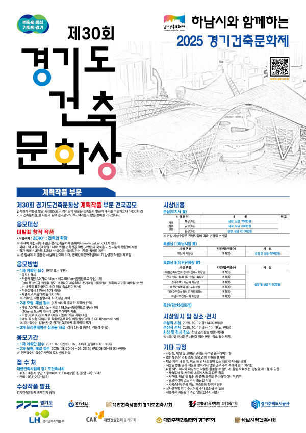 제30회 경기도 건축문화상 공모전 공모분야 건축 설계/건축디자인 접수기간2025.04.15 ~ 2025.07.09 D+274 종료 참가자격 기타 제한 주최경기건축문화제 추진위원회 주관대한건축사협회 경기도건축사회, 경기도 1등상금(상품)500만원~1천만원 홈페이지 바로가기 첨부파일 다운로드 유의사항 ※본 내용은 참고 자료로 내용의 오류와 변동에 대해 책임지지 않습니다. (오류 및 변동 신고는 상단의 '제안/오류' 신고를 통해 해주십시오.) ※주최사 사정에 따라 일정 및 내용이 변경될 수 있으니 주최사 홈페이지 등을 통해 관련 안내를 수시로 확인하시기 바랍니다. 상세내용 ■ 제목제30회 경기도 건축문화상 공모전 ■ 기간<사용승인 건축물 부문>• 1차 접수 : 4월15일(화)~25일(금)• 2차 접수 : 5월12일(월)~20일(화) (예정)<계획작품 부문>• 1차 계획안 접수 : 7월2일(수)~9일(수) (평일09:00~18:00)• 2차 모형,패널 접수 : 8월20일(수)~26일(화) (예정)(평일09:00~18:00)※ 우편접수시 접수기간안에 도착분에 한함. ■ 응모부문 및 대상본 행사에 기 출품된 사실이 없어야 하며, 한국건축문화대상에서 기 입상된 작품은 제외함<사용승인 건축물 부문>• 2022. 1. 1~ 2024.12.31 사이 사용승인된 경기도 소재 건축물※ 신청자격 : 출품건축물의 건축물대장에 명시되어 있는 대표 설계자, 시공자, 건축주이어야 함※ 1인이 다수 작품 출품시 상위 1개 작품만 수상작으로 선정 <계획작품 부문(미발표 창작 작품)> - 작품주제 : ‘ ZERO⁺ : 건축의 확장 ’※ 주제에 대한 세부내용은 경기건축문화제 홈페이지(www.gaf.or.kr)에서 참조 • 국내ㆍ외 대학교(대학원․대학 포함) 건축전공 학생(대한민국 국적을 가진 사람에 한함)의 작품 • 작가 명의는 3인을 초과할 수 없으며, 참여작가는 1작품 참여로 제한 ■ 응모방법<사용승인 건축물 부문>• 1차 (이메일(269-6131@hanmail.net) 접수)- 정해진 서식에 따른 사진첩 파일(서식은 경기건축문화제 홈페이지에서 확인)- 응모신청서- 건축물대장 1부- 건축사사무소 개설신고 확인증 사본 1부- 제출자료 이용허락 동의서 1부※ 사진첩 출력은 주최측에서 일괄제작하며, 설계자,시공자,건축주 정보 제외• 2차 (이메일(269-6131@hanmail.net) 접수)(1차 심사를 통과한 작품에 한함)- 패널(90㎝× 90㎝) 출력용 이미지파일 (패널은 주최측에서 일괄 제작)- 건축물 현황도 1부• 3차 본상후보작 현장심사 <계획작품 부문>• 1차 계획안 접수(방문 또는 우편)- 응모신청서- 작품계획안 A2(가로 42㎝ × 세로 59.4㎝-종방향으로 구성) 1매(5㎜ 폼 보드에 테두리 없이 부착하여 제출하되, 전개과정, 설계개념, 작품의 의도를 파악할 수 있는 내용을 표현하여야 하며 패널 축소판이 아님) - 작품설명서 1부(A4 10매 이내)- 제출자료 이용허락 동의서 1부※ 계확안, 작품설명서에 학교,성명 제외• 2차 모형,패널 접수(1차 심사를 통과한 작품에 한함)- 패널 A0(가로 84.1㎝ × 세로 118.9㎝-종방향으로 구성) 1매(10㎜ 폼 보드에 테두리 없이 부착하여 제출)- 모형(가로 80㎝ × 세로 80㎝ × 높이 50㎝ 이내) 1점- 패널 및 모형 이미지 및 작품설명서 파일 메일접수(269-6131@hanmail.net)• 3차 프리젠테이션 심사용 자료(2차 심사를 통과한 작품에 한함) ■ 시상내용 / 혜택 계획작품 부문 대상 : 상장 및 상금 700만원 등 다수 시상 ※ 자세한 시상 내용은 공고문 참조 ■ 유의사항- 사진첩, 패널 및 모형은 규정된 규격을 준수하여야 함- 입선작 등은 주최 측의 동의 없이 반출이 불가함- 패널 제작 시 유리, 비닐 등 반사 성질이 있는 재료의 사용을 금함- 지정된 반출 일에 작품을 찾아가지 않을 경우 주최 측에서 임의 처리함- 다음 어느 하나에 해당하는 작품은 출품할 수 없으며, 출품 무효 또는 입상을 취소할 수 있음 • 제출도서 및 서류의 내용이 사실과 다른 작품 • 사진첩, 패널 및 모형 등 출품 규격을 준수하지 아니한 경우 • 응모자격이 없는 자가 출품한 작품 • 사용승인부문에 위법 건축물이 확인된 경우- 심사결과에 따라 수상작품 수가 조정될 수 있음- 제출자료 이용동의 조건 있음(접수시 제출) ■ 문의경기건축문화제 집행위원회(전화 031-269-6131) 목록