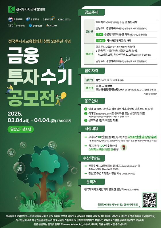 전국투자자교육협의회 창립 20주년 기념 금융투자수기 공모전 공모분야 문학/시나리오 접수기간2025.03.04 ~ 2025.04.04 D+370 종료 참가자격 제한없음 주최전국투자자교육협의회 1등상금(상품)100만원 이하 홈페이지 바로가기 첨부파일 다운로드 유의사항 ※본 내용은 참고 자료로 내용의 오류와 변동에 대해 책임지지 않습니다. (오류 및 변동 신고는 상단의 '제안/오류' 신고를 통해 해주십시오.) ※주최사 사정에 따라 일정 및 내용이 변경될 수 있으니 주최사 홈페이지 등을 통해 관련 안내를 수시로 확인하시기 바랍니다. 상세내용 ■ 제목전국투자자교육협의회 창립 20주년 기념 금융투자수기 공모전 ■ 기간 - 응모기간 : ‘25. 3. 4 ~ `25. 4. 4. (17:00까지) - 수상작 발표 : 전국투자자교육협의회 홈페이지(www.kcie.or.kr) 및 수상자 개별 통지(5월중) ※ 수상작은 전국투자자교육협의회 홈페이지에 게재 및 홍보에 활용될 수 있음 - 시상식 : 창립20주년 기념행사당일(’25.6.9) ■ 참가자격 - 성인(’06.12.31. 이전 출생자) - 초·중·고 재학생 또는 동일연령 청소년(‘07.1.1.~’18.12.31. 기간 중 출생자) ※ 개인단위로 참가 ■ 참여방법 / 접수방법<공모주제>1. 일반인 - 투자자교육수강(온라인, 집합) 및 실천사례 - 교사 : 금융경제교육 운영 사례(정규수업, 동아리 등) - 학부모 : 자녀금융투자교육 사례 - 금융투자 경험사례(투자동기, 성공·실패 사례 및 원인분석) 2. 청소년 - 금융투자교육(온라인,집합,체험관) 체험담 : 금융투자체험관 등 체험관 교육, 늘봄, 학교방문교육, 온라인콘텐츠 교육(교육내용 및 교훈 등) - 금융투자 경험사례(투자동기, 성공·실패 사례 및 원인분석) <응모방법> 이메일(kcie@kofia.or.kr) 제출 ※ 참가신청서(개인정보제공동의서 포함) 및 금융투자수기 <제출형태> A4용지 1~3매 이내, 글씨크기 12point, 줄간격 160%, 문서파일 또는 스캔파일 제출 <제출 시 유의사항>※ 응모자별 1편의 작품만 제출※ 참가신청서 및 개인정보제공동의서와 같이 제출※ 개인정보제공동의서는 서명*하여 제출(서명누락시 미제출로 간주) * 일반인부분과 청소년부분 별도 양식으로, 청소년부분은 참가학생 및 보호자 서명필수※ 탑재된 작성양식 파일을 참고하여 금융투자수기를 작성하여 제출※ 보조 설명으로 필요시 사진 첨부 가능 (예) 교사 교육장면, 개발한 교보재 등(페이지수에서 제외)※ 파일명 : ‘공모부문(일반인 또는 청소년)_이름_출생연도_제목’ ※ 이메일 제목 : ‘공모부문(일반인 또는 청소년)_이름_출생연도’※ 작품 내용에 개인 정보(이름, 학교)가 드러나지 않도록 유의 ■ 시상내용 / 혜택 - 우수작 10인(일반인 5인, 청소년 5인) 각 50만원(세전, 제세공과금 포함) ※ 참가자 중 100명 추첨(단, 주제에 부합하는 작품에 한함) 스타벅스 쿠폰(1만원권) 제공 ■ 유의사항 ※ 공모전 심사기준 및 평가결과는 비공개이며 응모자는 결과에 대해 이의를 제기할 수 없음 ※ 접수된 작품은 반환하지 않으며, 저작권은 응모자에게 있으나 수상작은 전국투자자교육협의회에서 공적인 용도(홈페이지 등 게재 및 홍보, 일부편집, 금융교육시 제3자 사용 등)로 사용할 수 있음 ※ 표절시비, 저작권법 위반 등에 대한 법적 책임은 응모자에게 있음 ※ 이미 수상했던 작품 또는 타인 작품 모방, 대리 작성된 작품은 수상에서 제외하거나 시상 후라도 취소(상금은 환수) 가능 ※ 작품 내용에 개인 정보가 포함되지 않도록 유의 ※ 심사결과에 따라 적합한 작품이 없을 경우 시상을 안 하거나 축소할 수도 있음 ※ 수상자가 연락불능 등으로 시상이 불가능한 경우 수상 포기로 간주 ※ 상금에 대한 제세공과금은 수상자가 부담 ※ 공모전 일정은 주최 측의 사정에 의해 변경될 수 있음 ■ 문의전국투자자교육협의회 공모전 담당자(02-2003-9845) 목록