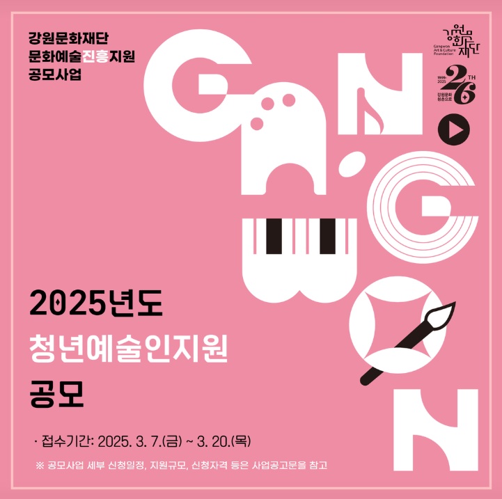 강원문화재단 2025년도 청년예술인지원 공모 (원로예술인지원, 문화예술공간 조성 공모) 공모분야 창업/사업 지원 접수기간2025.03.07 ~ 2025.03.20 D+387 종료 참가자격 지역한정 주최(재)강원문화재단 1등상금(상품)500만원~1천만원 홈페이지 바로가기 첨부파일 다운로드 유의사항 ※본 내용은 참고 자료로 내용의 오류와 변동에 대해 책임지지 않습니다. (오류 및 변동 신고는 상단의 '제안/오류' 신고를 통해 해주십시오.) ※주최사 사정에 따라 일정 및 내용이 변경될 수 있으니 주최사 홈페이지 등을 통해 관련 안내를 수시로 확인하시기 바랍니다. 상세내용 ■ 제목강원문화재단 2025년도 청년예술인지원 공모 ■ 개요‘원로예술인지원 공모’와 ‘문화예술공간 조성 공모’도 같은 접수 기간으로 시행하고 있습니다.해당 내용은 강원문화재단 공고를 확인 부탁드립니다. - 2025년도 원로예술인지원(원로예술공연지원) 공모http://www.gwcf.or.kr/ko/culture-business/business-top/business.html?bbsId=BBSMSTR_000000000002&nttId=52383&pageIndex=1&action=read - 2025년도 원로예술인지원(원로예술아카이빙전시지원) 공모http://www.gwcf.or.kr/ko/culture-business/business-top/business.html?bbsId=BBSMSTR_000000000002&nttId=52384&pageIndex=1&action=read - 2025년도 문화예술공간 조성 및 활성화지원 신규단체 공모http://www.gwcf.or.kr/ko/culture-business/business-top/business.html?bbsId=BBSMSTR_000000000002&nttId=52379&pageIndex=1&action=read ■ 기간 - 신청기간 : 2025. 3. 7.(금) 9:00 ~ 2025. 3. 20.(목) 18:00 ■ 참가자격공고일 기준 도내에 주소지를 둔 45세 이하(1980. 1. 1. 이후 출생)이면서, 아래의 자격요건을 충족하는 청년예술인 ※ 학업이 주된 신분인 예술인(학부 재학, 학부 휴학, 학부 수료 등)은 지원제외 대상 <자격요건> - 문학 : 해당분야에서 등단 또는 문학상 수상한 자로, 최근 3년간(2022년~2024년) 발간 활동 경력이 있는 자※ 희곡분야의 경우, 희곡분야 등단한 자 또는 본인 작품이 공연을 통해 발표된 자 - 시각 : 해당분야에서 최근 3년간(2022년~2024년) 개인전, 기획전, 그룹전 등 활동 경력이 있는 자※ 평론, 졸업작품전 제외 - 공연 : 해당분야에서 최근 3년간(2022년~2024년) 공연 활동 경력이 있는 자※ 졸업작품전 제외 ■ 참여방법 / 접수방법◯ 사업내용 : 도내 청년예술인 창작활동 발표지원 ◯ 지원분야 : 6개 분야(문학, 시각, 연극, 음악, 무용, 전통) ◯ 신청방법 : 국가문화예술지원시스템(NCAS)을 통한 온라인 신청 <제출서류 및 서류제출 시 유의사항>홈페이지 공고문 참조 <의무사항> - 사업계획에 따른 창작물 발표 - 재단 지원 프로그램 참여 ※ 의무 참여 프로그램 중 3개 이상 미참여할 경우 2026년도 청년예술인지원 지원대상에서 제외 자세한 신청, 지원 등에 대한 내용은 홈페이지 공고문을 필히 참조 바랍니다. ■ 시상내용 / 혜택 - 지원규모: 최대 1천만원 / 예상선정건수: 14건 내외 ※ 최종 선정 건수는 변동될 수 있음 ■ 유의사항 - 강원문화재단은 예술인의 신청내용을 신뢰하고 존중합니다. 신청 주체인 예술인께서는 신청 절차 및 제출자료, 지원금 관리 규정 등을 충분히 숙지하시어 필수 제출자료 미제출 등으로 인한 불이익을 받지 않도록 책임감 있게 신청해주시기 바라며, 신청서 제출 시 해당 규정 등에 동의한 것으로 간주합니다. - 지원신청서 작성 전 국가문화예술지원시스템(NCAS)에서 신청인 기본정보를 최신 정보로 수정해주시기 바랍니다. ※ 국가문화예술지원시스템(NCAS) 로그인 ⟶ 마이페이지 ⟶ 비밀번호 확인 → 마이페이지 정보 수정 ⟶ 저장 ※ 정보를 미작성하거나 허위 작성할 경우 심의 시 불이익이 발생할 수 있음 - 지원신청액은 재단에서 정한 금액 범위 내에서 신청하여야 합니다. - 접수마감일에는 신청자가 많아 접속시간이 오래 걸릴 수 있으므로 여유를 두고 신청해 주시기 바랍니다. - 단체 성격의 사업으로 판단 시 심의에서 제외되며, 최종 선정 후 발견 시 차기년도 지원 사업 신청자격이 상실됩니다. - 제출된 신청서는 접수 마감 후 수정이 불가하며, 최종지원 결정 후에는 지원신청서에 작성한 사업목적 및 기획의도 등의 과도한 변경은 불가합니다. ※ 최종선정 후 불가피하게 변경이 필요할 경우 반드시 재단과 협의 - 선정 후라도 지원 자격 비해당 등의 사실이 밝혀질 시 선정이 취소될 수 있습니다. - 지원신청자는 사업수행과 관련하여 재단에서 시행하는 워크숍, 모니터링, 만족도 조사 등 발생 시 협조·참석하여야 합니다. - 재단 지원사업 간 중복 수혜는 불가합니다 ■ 문의강원문화재단 예술지원팀 033-240-1343 목록