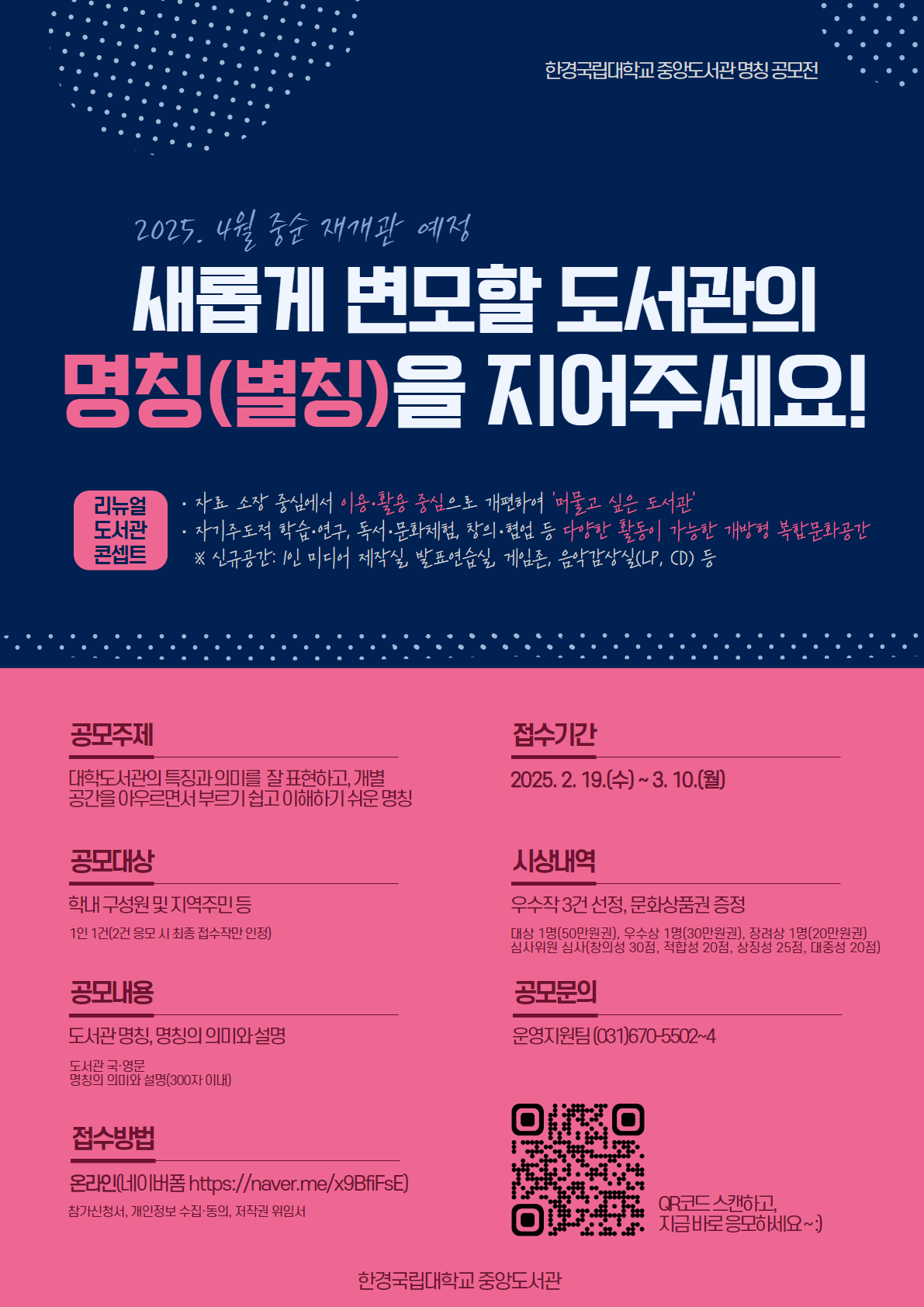 한경국립대학교 중앙도서관 명칭 공모전 공모분야 네이밍/슬로건 접수기간2025.02.19 ~ 2025.03.10 D+397 종료 참가자격 제한없음 주최한경국립대학교 1등상금(상품)기타 홈페이지 바로가기 첨부파일 다운로드 유의사항 ※본 내용은 참고 자료로 내용의 오류와 변동에 대해 책임지지 않습니다. (오류 및 변동 신고는 상단의 '제안/오류' 신고를 통해 해주십시오.) ※주최사 사정에 따라 일정 및 내용이 변경될 수 있으니 주최사 홈페이지 등을 통해 관련 안내를 수시로 확인하시기 바랍니다. 상세내용 ■ 제목한경국립대학교 중앙도서관 명칭 공모전 ■ 개요2025. 4월 중순 재개관 예정새롭게 변모할 한경국립대학교 도서관의 명칭(별칭)을 지어주세요! [리뉴얼 도서관 콘셉트]ㅇ 자료 소장 중심에서 이용·활용 중심으로 개편하여 '머물고 싶은 도서관'ㅇ 자기주도적 학습·연구, 독서·문화체험, 창의·협업 등 다양한 활동을 지원하는 개방형 복합문화공간※ 신규 공간: 1인 미디어 제작실, 발표연습실, 게임존, 음악감상실(LP, CD) 등 ■ 기간 - 접수 기간: 2025. 2. 19.(수)~3. 10.(월) ■ 참가자격학내 구성원 및 지역주민 등 ■ 참여방법 / 접수방법<공모주제> 도서관 내 개별 공간을 아우르면서 부르기 쉽고 이해하기 쉬운 명칭- 미래지향적인 대학도서관의 특징과 의미를 잘 표현할 수 있고 누구나 공감할 수 있는 명칭 <공모내용> 도서관 명칭, 명칭의 의미와 설명(300자 이내 / 1인 1건만 신청 가능) <접수방법> 온라인 네이버폼 : https://naver.me/x9BfiFsE ■ 시상내용 / 혜택 - 대상 1명(문화상품권 50만원) - 우수상 1명(문화상품권 30만원) - 장려상 1명(문화상품권 20만원) ■ 유의사항◦ 1인 1건만 인정(2건 이상 신청 시, 최종 제출 1건만 인정), 순수 창작물이어야 함◦ 개인정보 오기 등으로 발생하는 불이익은 응모자 책임으로 함 ◦ 동일한 명칭이 다수 접수된 경우, 가장 먼저 접수된 명칭만 유효 처리함◦ 공모작 심사점수는 공개하지 않음◦ 심사결과에 따라 수상작 전부 또는 일부를 선정하지 않을 수 있음◦ 수상작이 이미 사용되고 있거나, 상표출원, 기타 법적 문제 등이 발생할 경우 수상 무효 및 시상품 환수◦ 저작권 등 분쟁에 따른 모든 민·형사상 책임은 수상자에게 있음◦ 수상작에 대한 저작권, 사용권 등 일체의 권리는 한경국립대학교 중앙도서관에 귀속됨◦ 수상작은 최종 명칭으로 반영되지 않거나 수정·보완될 수 있음 ■ 문의한경국립대학교 중앙도서관 운영지원팀 (031) 670-5502~4 목록