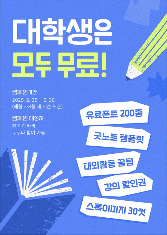 대학생활 레벨업! 산돌구름 캔(Can)퍼스 캠페인 접수기간2025.02.25 ~ 2025.06.30 D+286 종료 참가자격 대학(원)생/청년 주최산돌 1등상금(상품)기타 홈페이지 바로가기 첨부파일 다운로드 유의사항 ※본 내용은 참고 자료로 내용의 오류와 변동에 대해 책임지지 않습니다. (오류 및 변동 신고는 상단의 '제안/오류' 신고를 통해 해주십시오.) ※주최사 사정에 따라 일정 및 내용이 변경될 수 있으니 주최사 홈페이지 등을 통해 관련 안내를 수시로 확인하시기 바랍니다. 상세내용 ■ 제목대학생활 레벨업! 산돌구름 캔(Can)퍼스 캠페인 ■ 개요산돌구름과 함께라면 뭐든 할(Can) 수 있다!산돌구름이 엄선한 대학생활 필수 폰트 사용하고, 우리 모두 레벨업해요. ■ 기간 - 캠페인 기간: 2025.02.25. - 2025.06.30. - 폰트 사용 기간: 2025.02.25. - 2025.08.31. ■ 참가자격전국 대학생 누구나 참여 가능 ■ 지원방법산돌구름 홈페이지 이벤트 공지글을 통해서 신청https://www.sandollcloud.com/CanpusCampaign?utm_source=website&utm_medium=main&utm_campaign=canpuscampaign&utm_content=season6&utm_term=can6_mainbanner ■ 지원 혜택산돌구름 유료폰트 200종대학생활 필수템 증정&할인템플릿 25종&꿀팁 2종유토이미지 콘텐츠 30컷 <대학생 회원 인증 방법>1. 산돌구름 웹사이트 로그인 후 마이페이지 → 회원정보수정 → 학생회원 인증에서 [학생인증] 버튼 클릭2. [카카오 톡학생증 인증] 또는 [인증정보 직접 입력] 중 선택3. 대학생 구분 확인 후 학교명 / 전공(주 전공) / 학년 및 학기 입력해 인증 완료하기 ※ [인증정보 직접 입력] 시 별도 학생증 및 재학증명서 제출이 필요합니다. <폰트 사용 방법>1. 산돌구름 로그인 후 캔퍼스 캠페인 페이지에서 [폰트 쿠폰 다운로드] 버튼 클릭2. 산돌구름* 설치 후 [내 폰트 관리]에서 폰트 활성화 해 사용 ※ 기존 산돌구름 사용자의 경우, 산돌구름으로 최신 업데이트 시 더욱 원활히 사용하실 수 있습니다. ※ PC에서 설치 가능(모바일·앱에서는 설치 불가) <유토 이미지 사용 관련>대학생 회원 인증하면 스톡이미지 사이트 유토이미지의 사진·일러스트·아이콘·그래픽·모션그래픽·영상 30컷이 무료!사이트 이용기간 동안 무료 재다운로드 할 수 있어, 원본관리 걱정도 없어요* 제공 상품은 과제·대외활동 및 외부 납품용도로 활용 가능한 [유토이미지 베이직샵 30컷] 무료이용권입니다.한 가지 더! 유토이미지 쿠폰 등록자의 경우, 추후 유토이미지 플랜 구매 시 특별 할인 또는 상품권 증정 혜택을 드립니다.(구매 시기에 따라 혜택 상이, 자세한 사항 유토이미지 고객지원센터 문의) <유토이미지 쿠폰 사용하기>1. 산돌구름 대학생 회원 인증 후 캔퍼스 캠페인 폰트 쿠폰 다운로드 완료2. [유토이미지 쿠폰 다운로드] 버튼 클릭해 쿠폰 코드 확인3. 유토이미지 회원가입 후 로그인4. 유토이미지 마이존>쿠폰함에서 쿠폰 코드 등록해 사용 ※ 유토이미지 회원가입 시, 반드시 이메일 란에 산돌구름ID(이메일 형식)를 기재해 주세요.타 이메일 기재 시 산돌구름 대학생 회원 확인이 어려우므로 쿠폰 사용이 중단될 수 있습니다. ex : 산돌구름ID sandoll@sandoll.co.kr 일 시 → 유토이미지 이메일 주소란에 sandoll@sandoll.co.kr기재 ■ 유의사항<유료폰트 사용>산돌구름 캔(Can)퍼스 캠페인 폰트는 대학생 회원(산돌구름 ID 기준)당 시즌별 1회만 다운로드 가능합니다.대학생 회원이 아닐 시 폰트 쿠폰 다운로드가 제한됩니다. 반드시 대학생 회원 인증을 해주세요.산돌구름 폰트는 사용범위 제한 없이 상업용으로도 활용 가능합니다. <유토이미지 쿠폰>유토이미지 쿠폰은 산돌구름 대학생 회원에게 제공되며, 캔퍼스 캠페인 폰트 쿠폰 다운로드까지 완료해야 혜택 이용이 가능합니다.반드시 대학생 회원 인증 및 폰트 쿠폰 다운로드를 해주세요.부적격자의 경우 쿠폰 사용이 중단될 수 있습니다. 산돌구름 대학생 회원임을 확인할 수 있도록, 가입시 이메일 입력란에 산돌구름ID(이메일 형식)를 반드시 기재해 주세요.유토이미지 쿠폰 사용을 위해서는 별도 서비스 가입이 필요하며, 신규 가입자에 한해 쿠폰을 사용할 수 있습니다.사용범위 및 라이선스는 유토이미지 내 베이직플랜 표준라이선스 규정을 따릅니다.유토이미지 쿠폰 사용 문의사항은 유토이미지 고객지원센터(02-2138-7944)로 문의해 주세요. <캠페인 유의사항>산돌구름 캔(Can)퍼스 캠페인은 시즌제로 진행되며, 매년 2월·8월 새 시즌이 시작됩니다.시즌별 제공되는 폰트의 종류는 상이할 수 있으므로 반드시 폰트 사용 기간 만료 전, PDF·JPG 등 이미지 형태로 제작을 완료해 주세요.산돌구름 캔(Can)퍼스 캠페인은 대학생 회원 누구나 참여 가능하며, 일반회원 및 초중고 학생회원·기업회원·비회원은 참여가 제한됩니다. 이용을 위해, 먼저 로그인해 주세요.대학생 회원 인증은 마이페이지 → 회원정보 수정 → 학생회원 인증에서 가능합니다. 초중고 학생회원의 경우 폰트안심학교를 이용해 주세요.산돌구름 캔(Can)퍼스 캠페인 폰트는 대학생 회원(산돌구름 ID 기준)당 시즌별 1회만 다운로드 가능합니다.부적절한 방법으로 대학생 회원 전환 시 산돌구름 서비스 이용이 제한될 수 있습니다. 목록
