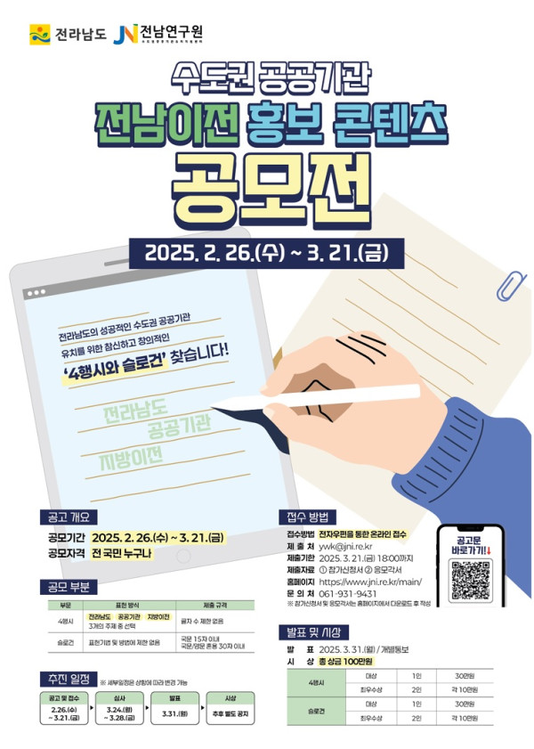 수도권 공공기관 전남이전 홍보 콘텐츠 공모전 (4행시, 슬로건) 공모분야 네이밍/슬로건 접수기간2025.02.26 ~ 2025.03.21 D+387 종료 참가자격 제한없음 주최전남연구원 1등상금(상품)100만원 이하 홈페이지 바로가기 첨부파일 다운로드 유의사항 ※본 내용은 참고 자료로 내용의 오류와 변동에 대해 책임지지 않습니다. (오류 및 변동 신고는 상단의 '제안/오류' 신고를 통해 해주십시오.) ※주최사 사정에 따라 일정 및 내용이 변경될 수 있으니 주최사 홈페이지 등을 통해 관련 안내를 수시로 확인하시기 바랍니다. 상세내용 ■ 제목수도권 공공기관 전남이전 홍보 콘텐츠 공모전 ■ 기간 - 공모기간 : 2025. 2. 26.(수) ~ 3. 21.(금) 18:00까지 - 결과발표 : 3.31.(월) / 개별통보 ■ 참가자격전 국민 누구나 ■ 참여방법 / 접수방법<공모주제> 성공적인 수도권 공공기관 유치를 위한 아이디어 제안 ※ 참고자료(https://www.jni.re.kr/cms/bbs/cms.php?dk_cms=news_03_04&dk_id=15) <공모 부문 및 제출 규격> 부문표현 방식제출 규격4행시 - 3개의 주제 중 선택 전라남도 / 공공기관 / 지방이전 - 글자 수 제한 없음슬로건 - 표현기법 및 방법에 제한 없음 - 국문 15자 이내 - 국문/영문 혼용 30자 이내 ○ 접수방법 : 전자우편(이메일)을 통한 온라인 접수 - 제 출 처 : ywk@jni.re.kr - 제출자료 : ① 참가신청서 ② 응모각서 ※ 참가신청서 및 응모각서는 홈페이지에서 다운로드 후 작성 ■ 시상내용 / 혜택4행시, 슬로건 각 대상 1명, 최우수상 2명씩 선정 - 대상 1명 : 30만원 - 최우수상 2명 : 각 10만원 ■ 문의 061-931-9431 목록