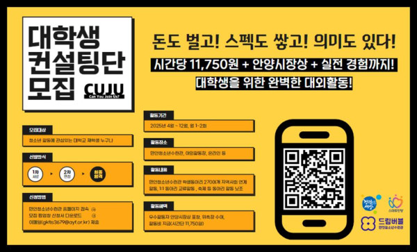 학생동아리 CUJU 대학생컨설팅단 모집 (시급 11,750원 / 전국 대학생 누구나 참여 가능) 접수기간2025.02.24 ~ 2025.03.26 D+383 종료 참가자격 대학(원)생/청년 주최안양시만안청소년수련관 1등상금(상품)기타 홈페이지 바로가기 첨부파일 다운로드 유의사항 ※본 내용은 참고 자료로 내용의 오류와 변동에 대해 책임지지 않습니다. (오류 및 변동 신고는 상단의 '제안/오류' 신고를 통해 해주십시오.) ※주최사 사정에 따라 일정 및 내용이 변경될 수 있으니 주최사 홈페이지 등을 통해 관련 안내를 수시로 확인하시기 바랍니다. 상세내용 ■ 제목학생동아리 CUJU 대학생컨설팅단 모집 ■ 개요청소년과 함께 성장할 대학생 컨설팅단 모집! ■ 기간 - 신청 기간 : 2025. 2. 24.(월) ~ 3. 26.(수) - 면접 일정 : 2025년 3월 29일(토) - 활동기간 : 2025년 4월~12월 (활동장소 : 만안청소년수련관 등) ■ 참가자격청소년 활동에 관심 있는 대학생 누구나 ■ 활동내용 - 만안청소년수련관 학생동아리(270여개) 지역사회 연계활동 - 1:1 동아리 교류활동 지원, 축제 등 동아리 활동 보조 ■ 지원방법 만안청소년수련관 홈페이지 공지사항에서 신청서 다운로드 후 이메일 제출 - 제출 이메일 : gkfls3679@ayf.or.kr ■ 참여 혜택- 공식 위촉장 수여- 우수 활동자 안양시장상 표창- 활동비 지급 (시간당 11,750원) ■ 문의 활동사업팀 : 031-470-4723 목록