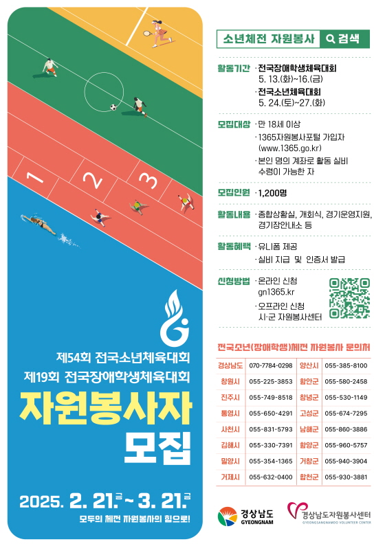2025 전국 소년/장애학생 체전 자원봉사자 모집 접수기간2025.02.21 ~ 2025.03.21 D+388 종료 참가자격 제한없음 주최경상남도자원봉사센터 1등상금(상품)기타 홈페이지 바로가기 첨부파일 다운로드 유의사항 ※본 내용은 참고 자료로 내용의 오류와 변동에 대해 책임지지 않습니다. (오류 및 변동 신고는 상단의 '제안/오류' 신고를 통해 해주십시오.) ※주최사 사정에 따라 일정 및 내용이 변경될 수 있으니 주최사 홈페이지 등을 통해 관련 안내를 수시로 확인하시기 바랍니다. 상세내용 ■ 제목2025 전국 소년/장애학생 체전 자원봉사자 모집 ■ 개요오는 5월, 경남에서 펼쳐지는 제 54회 전국소년체육대회·제 19회 전국장애학생체육대회를 함께할 자원봉사자를 모집합니다!여러분들의 많은 관심과 참여 부탁드립니다 :D ■ 기간-모집기간: 25.2.21.(금)~3.21.(금) <활동기간> *전국장애학생체육대회: 25. 5. 13.(화)~16.(금) *전국소년체육대회: 25. 5. 24.(토)~27.(화) ■ 참가자격만 18세 이상 성인 누구나 - 1365자원봉사포털 가입자(www.1365.go.kr) - 본인 명의 계좌로 활동 실비 수령 가능한 자 ■ 활동내용활동분야: 종합상황실, 개회식, 경기운영지원, 경기장안내소 등 ■ 지원방법 *온라인 신청 gn1365.kr *오프라인 신청 시·군 자원봉사센터 ■ 참여 혜택 *유니폼 제공 *실비 지급 및 인증서 발급 ■ 문의경상남도자원봉사센터 및 시·군자원봉사센터 목록