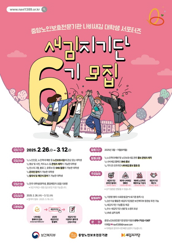중앙노인보호전문기관 대학생 서포터즈 새김지기단 6기 모집 접수기간2025.02.26 ~ 2025.03.12 D+397 종료 참가자격 대학(원)생/청년 주최중앙노인보호전문기관 1등상금(상품)기타 홈페이지 바로가기 첨부파일 다운로드 유의사항 ※본 내용은 참고 자료로 내용의 오류와 변동에 대해 책임지지 않습니다. (오류 및 변동 신고는 상단의 '제안/오류' 신고를 통해 해주십시오.) ※주최사 사정에 따라 일정 및 내용이 변경될 수 있으니 주최사 홈페이지 등을 통해 관련 안내를 수시로 확인하시기 바랍니다. 상세내용 ■ 제목중앙노인보호전문기관 대학생 서포터즈 새김지기단 6기 모집 ■ 기간 - 지원기간 : 2025.2.26.(수) ~ 2025.3.12.(수) - 최종 선정결과 발표 : 2025.3.19.(수) - 새김지기단 온라인 발대식 : 2025.3월 말 - 제7회 나비새김 캠페인 : 2025.6월(두 달간) - 제9회 노인학대 예방의 날 기념식 : 2025.6.13.(금) - 새김지기단 해단식 : 2025.11월 예정 ■ 참가자격‘노인인권’, ‘노인학대예방’ 홍보 사업에 관심있는 대학생 100명 ■ 활동내용 - 새김지기단 발대식 및 해단식 참석 - 제7회 나비새김 캠페인 활동 - 제9회 노인학대 예방의 날 기념식 참여 - 새김지기단 온·오프라인 활동미션 진행 ■ 지원방법① 나비새김(navi1389.or.kr) 홈페이지‘새김지기단’ 클릭② 새김지기단 지원하기 탭 클릭③ 신청서 작성 팀(2~5명)으로 신청 가능④ 신청서 제출 ■ 참여 혜택 - 우수 새김지기 포상 - 단체복, 단원증, 나비새김 기념품 등 제공 - 특강(복지 분야, 마케팅 등 선발된 새김지기단 의견 수렴하여 진행) - 1년 활동 완료 시 기관장 명의 수료증 발급 (캠페인과 발대식 필수 참석) - 2년 이상 활동한 새김지기는 보건복지부 장관상 추천 가능 - 기타 vms 실적 등록 ■ 문의중앙노인보호전문기관 운영지원과02-3667-1389 (내선 4번) 목록