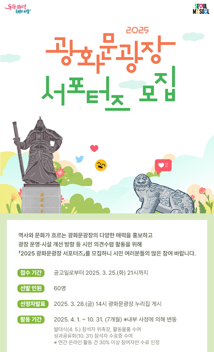 2025 광화문광장 홍보 서포터즈 모집 접수기간2025.02.25 ~ 2025.03.25 D+384 종료 참가자격 지역한정 주최서울특별시 1등상금(상품)기타 홈페이지 바로가기 첨부파일 다운로드 유의사항 ※본 내용은 참고 자료로 내용의 오류와 변동에 대해 책임지지 않습니다. (오류 및 변동 신고는 상단의 '제안/오류' 신고를 통해 해주십시오.) ※주최사 사정에 따라 일정 및 내용이 변경될 수 있으니 주최사 홈페이지 등을 통해 관련 안내를 수시로 확인하시기 바랍니다. 상세내용 ■ 제목2025 광화문광장 홍보 서포터즈 모집 ■ 개요역사와 문화가 흐르는 광화문광장의 다양한 매력을 홍보하고 광장 운영·시설 개선 방향 등 시민 의견수렴 활동을 위해 「2025 광화문광장 서포터즈」를 모집하니 시민 여러분들의 많은 참여 바랍니다. ■ 기간 - 접수 기간 : 공고일로부터 2025. 3. 25.(화) 21시까지 - 선정자발표 : 2025. 3. 28.(금) 14시 광화문광장 누리집 게시 - 활동 기간 : 2025. 4. 1. ~ 10. 31. (7개월) - 발대식(4. 5.) 참석자 위촉장, 활동물품 수여 - 성과공유회(10. 31) 참석자 수료증 수여 ※ 연간 온라인 활동 건 30% 이상 참여자만 수료 인정 ■ 참가자격 ① 광화문광장 홍보 및 개선에 관심 있는 서울시민(성인, 만19세이상) ※ 서울 소재 직장·학교·봉사 등 서울 생활권자 가능 ② SNS를 운영하며 온라인 매체를 통해 홍보 수행이 가능한 자 ※ 공개 계정의 SNS(인스타그램, 페이스북, 유튜브, 블로그) 보유자 <우대조건> ① 광화문광장 관련 활동 이력 보유(광화문포럼, 시민참여단, 광화문운영위 등) ② 공기관, 기업 안내 , 시민기자 등 봉사, 서포터즈 활동 이력 보유 ■ 활동내용가. 활동 내용을 콘텐츠화해서 개인 SNS 게시(이미지, 내용, 보도자료 등 제공)나. 광화문광장 주관 행사 안내 활동 참여다. 광화문광장 개선점 등 시민 의견 온·오프라인 모니터링라. 안전하고 쾌적한 광화문광장 사용을 위한 캠페인 ■ 지원방법<접수 방법> 이메일 접수 ghm2022@seoul.go.kr ① 지원서, 활동계획서는 워드로 작성하여 pdf 변환 후 첨부 ※ 이메일 주소, 이름 등 자필로 알아볼 수 없게 작성하여 제출 시 불이익이 있을 수 있음 ② 활동 시 사용할 본인 이메일로 신청서 제출(필수) ※ 선정 시 발송된 이메일과 실명이 주소록에 저장되므로 대리 접수 불가 ③ 확인 가능한 본인 SNS 링크를 메일 본문에 포함 <제출 서류>① 지원서 ② 활동계획서 ③ 개인정보 수집·활용 동의서 ④ 활동확인서 ※ 파일 제목은 ‘2025 서포터즈_000(실명)’으로 제출 ex. 2025 서포터즈_서우리 ※ 활동확인서는 해당자에 한해 제출. 활동확인서 검토 후 우대 점수 부여 <서식 다운로드 채널> ① 광화문광장 누리집 > 광장소식 > 공지사항 ② 서울시 누리집 > 서울소식 > 공고 > 고시공고 ③ 내손안에서울 > 공모 ■ 참여 혜택가. 소정의 활동비(원고료, 미션 수행, 회의비 등) 지급나. 위촉장, 수료증 수여 및 수료 후 활동 확인서 발급 ※ 2025년 온라인 홍보 미션 전체 활동의 30% 이상 참여자만 수료 해당다. 활동 물품 제공(에코백, 텀블러, 수첩 등)라. 서포터즈 맞춤형 역량 강화 교육 실시마. 우수 활동자 서울시장 상장 수여 ※ 서울특별시 표창 조례 제6조에 따른 표창 금지 대상자 제외 ■ 선정 제외 및 해촉 대상 - SNS, 활동계획서 내용이 종교·정치적으로 편중되는 경우 - 허위로 경력, 활동확인서를 제출하는 경우 - 영리 등 개인의 이익을 목적으로 서포터즈 활동을 이용하는 경우 - 동일 내용의 무한 반복, 타인의 글을 복사하여 게시하는 경우 - 기타 저작권 등 문제 발생 시 협의하여 제외·해촉 처리 ■ 문의- 카카오톡 문의 가능 (카카오톡 ID : ideabrick)- 이메일 : ghm2022@seoul.go.kr ※ 문의 시간은 평일 10~17시로 한함. 회의나 부재 시 순차적으로 답변 목록