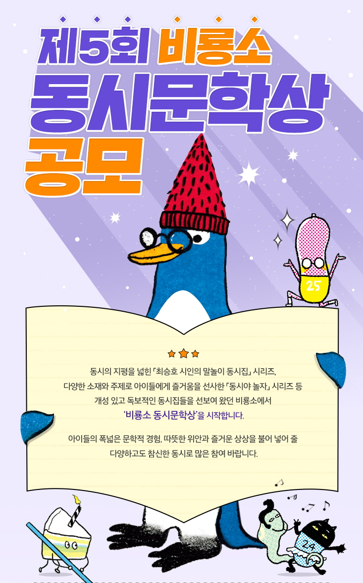 제5회 비룡소 동시 문학상 공모분야 문학/시나리오 접수기간2025.01.01 ~ 2025.06.30 D+229 종료 참가자격 제한없음 주최비룡소 주관비룡소 1등상금(상품)500만원~1천만원 홈페이지 바로가기 첨부파일 다운로드 유의사항 ※본 내용은 참고 자료로 내용의 오류와 변동에 대해 책임지지 않습니다. (오류 및 변동 신고는 상단의 '제안/오류' 신고를 통해 해주십시오.) ※주최사 사정에 따라 일정 및 내용이 변경될 수 있으니 주최사 홈페이지 등을 통해 관련 안내를 수시로 확인하시기 바랍니다. 상세내용 ■ 제목제5회 비룡소 동시문학상 ■ 개요 아이들의 폭넓은 문학적 경험, 따뜻한 위안과 즐거운 상상을 불어 넣어 줄 다양하고도 참신한 동시로 많은 참여 바랍니다. ■ 기간 ~2025년 6월 30일까지 (우편 마감일 소인 유효) ■ 참가자격 제한 없음 ■ 참여방법 / 접수방법 <제출 방법> - 동시 50편 이상 - 신청서 다운로드 후 작성 우편발송 <접수 방법> - 우편 : (우 06027) 서울시 강남구 도산대로1길 62 강남출판문화센터 4층 비룡소 편집부 '비룡소 동시문학상' 담당자앞 <문의> - bir@bir.co.kr (전화 문의는 정중히 사양합니다.) ■ 시상내용 / 혜택 - 대상 1명, 상패와 상금 1,000만원(선인세) - 단 우수상으로 당선될 경우 500만원(선인세) ■ 유의사항 - 우편 또는 택배 접수만 가능하며 이메일로는 받지 않습니다. - 겉봉투에 '제5회 비룡소 동시 문학상'을 반드시 명기해 주세요. - 응모지원서에 반드시 이름, 주소, 전화번호를 기재해야 합니다. 지원서 외 원고 시작이나 끝 부분에 이름이나 전화번호를 기재하지 말아 주세요. ■ 기타사항 - 수상작은 단행본으로 출간하며, 출간 후 판매 부수에 대한 인세가 상금을 상회할 경우 초과분에 대해 인세를 지급합니다. - 저작권은 작가에게 있습니다. 목록