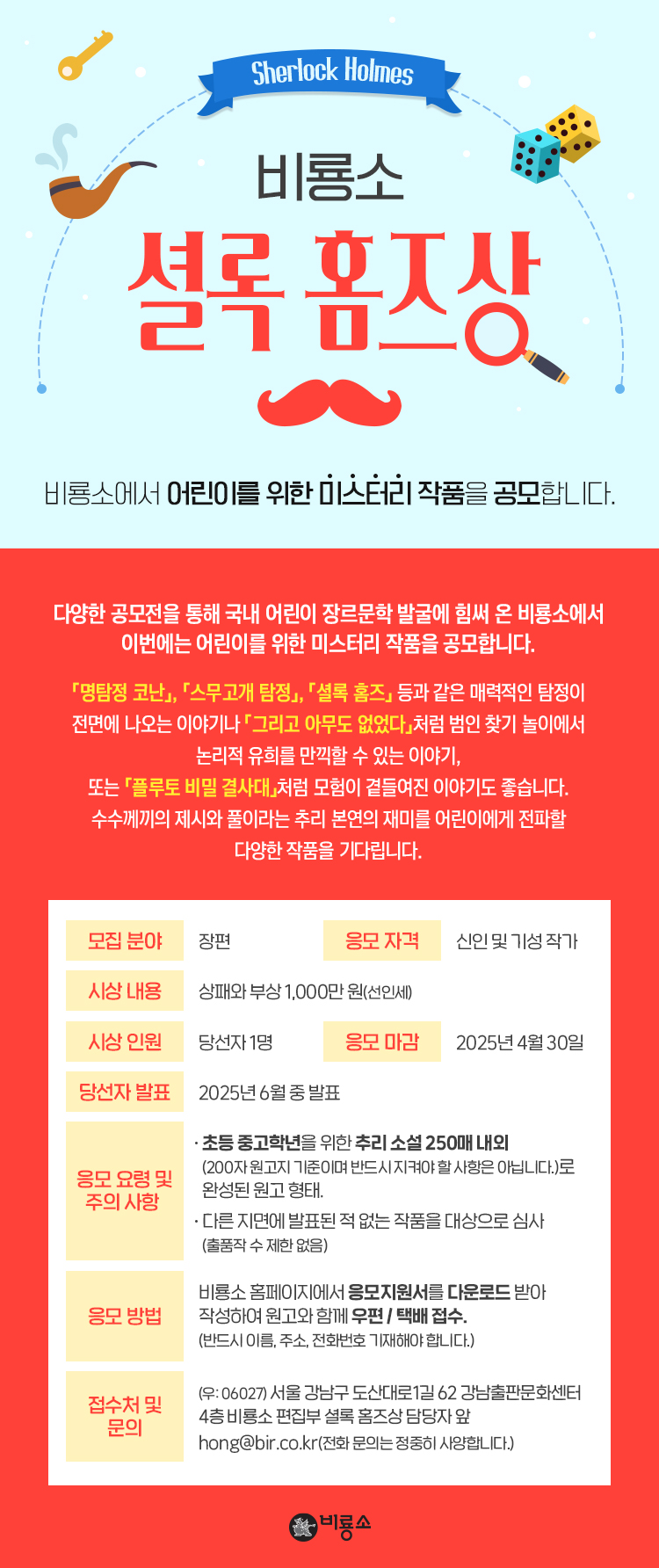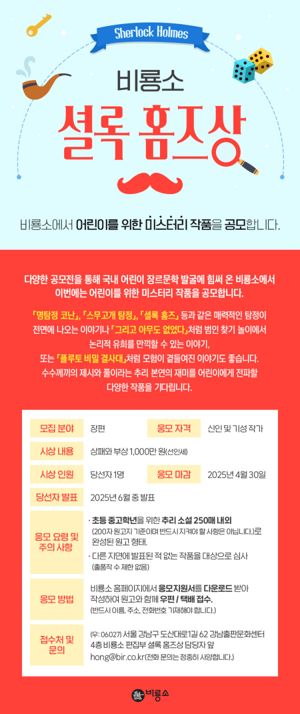 비룡소 셜록 홈즈상 공모분야 문학/시나리오 접수기간2025.01.01 ~ 2025.04.30 D+290 종료 참가자격 제한없음 주최비룡소 주관비룡소 1등상금(상품)500만원~1천만원 홈페이지 바로가기 첨부파일 다운로드 유의사항 ※본 내용은 참고 자료로 내용의 오류와 변동에 대해 책임지지 않습니다. (오류 및 변동 신고는 상단의 '제안/오류' 신고를 통해 해주십시오.) ※주최사 사정에 따라 일정 및 내용이 변경될 수 있으니 주최사 홈페이지 등을 통해 관련 안내를 수시로 확인하시기 바랍니다. 상세내용 ■ 제목비룡소 셜록 홈즈상 ■ 개요 비룡소에서 어린이를 위한 미스터리 작품을 공모합니다. ■ 기간 ~2025년 4월 30일까지(당선자 발표 : 2025년 6월 중 발표) ■ 참가자격 신인 및 기성작가 ■ 참여방법 / 접수방법 비룡소 홈페이지에서 응모지원서를 다운로드 받아 작성하여 원고와 함께 우편/택배 접수.(반드시 이름, 주소, 전화번호 기재해야 합니다.)<분량 및 응모요령> - 초등 중고학년을 위한 추리 소설 250매 내외 (200자 원고지 기준이며, 반드시 지켜야 할 사항은 아닙니다.)로 완성된 원고 형태. - 다른 지면에 발표된 적 없는 작품을 대상으로 심사 (출품작 수 제한 없음)<접수처 및 문의> (우 06027) 서울시 강남구 도산대로1길 62 강남출판문화센터 4층 비룡소 편집부 '셜록 홈즈상' 담당자앞 <문의> - hong@bir.co.kr (전화 문의는 정중히 사양합니다.) ■ 시상내용 / 혜택 상패와 부상 1,000만원(선인세) 목록