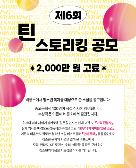 2025 제6회 틴 스토리킹 공모전 공모분야 문학/시나리오 접수기간2025.01.01 ~ 2025.03.31 D+319 종료 참가자격 제한없음 주최비룡소 주관비룡소 1등상금(상품)1천만원 초과 홈페이지 바로가기 첨부파일 다운로드 유의사항 ※본 내용은 참고 자료로 내용의 오류와 변동에 대해 책임지지 않습니다. (오류 및 변동 신고는 상단의 '제안/오류' 신고를 통해 해주십시오.) ※주최사 사정에 따라 일정 및 내용이 변경될 수 있으니 주최사 홈페이지 등을 통해 관련 안내를 수시로 확인하시기 바랍니다. 상세내용 ■ 제목2025 틴 스토리킹 공모전 ■ 개요 중고등학생 100명 직접 심사에 참여하는 청소년 독자를 대상으로 쓴 소설 공모전입니다. ■ 기간 ~2025년 3월 31일 (3월 31일 소인까지 유효) <당선작 발표>2025년 6월 중 발표, 비룡소 홈페이지 및 개별 통보 ■ 참가자격신인 및 기성 작가 ■ 참여방법 / 접수방법 <모집 부문>청소년을 위한 소설 (200자 원고지 500매 내외) <응모 방법> - 원고는 A4 용지에 출력한 상태로 우편 또는 택배 접수만 가능하며, 이메일로는 받지 않습니다. - 겉봉투에 ‘제6회 틴 스토리킹 응모작’이라고 명기해 주세요. - 비룡소 홈페이지 응모지원서를 다운로드 받아 원고의 맨 앞장에 첨부해 주세요. - 지원서 외 원고 시작이나 끝 부분에 이름이나 전화번호를 기재하지 말아 주세요. ■ 시상내용 / 혜택 대상작 1편 상패와 상금 2,000만 원 (선인세) ■ 주의 및 기타사항 - 응모작이 이미 발표된 작품이거나, 다른 문학상을 수상한 경험이 있거나, 표절 등의 부당한 작품일 때에는 수상을 취소합니다. (상업적으로 활용되거나 타 문학상 수상 경력이 없는 경우 순수 창작물로 응모 가능합니다.) - 완결되지 않은 작품은 응모 자격이 주어지지 않습니다. 연작의 경우 연작 1부의 완결성을 보인다면 완결로 봅니다. - 부상은 선인세에 해당하며 인세는 부상을 상회할 때, 해당 시점부터 판매 부수에 대한 인세를 지급합니다. ■ 접수처 및 문의(우: 06027) 서울 강남구 도산대로1길 62 강남출판문화센터 4층 비룡소 편집부 ‘틴 스토리킹’ 담당자 앞 <문의>teenstoryking@bir.co.kr(전화 문의는 정중히 사양합니다.) 목록